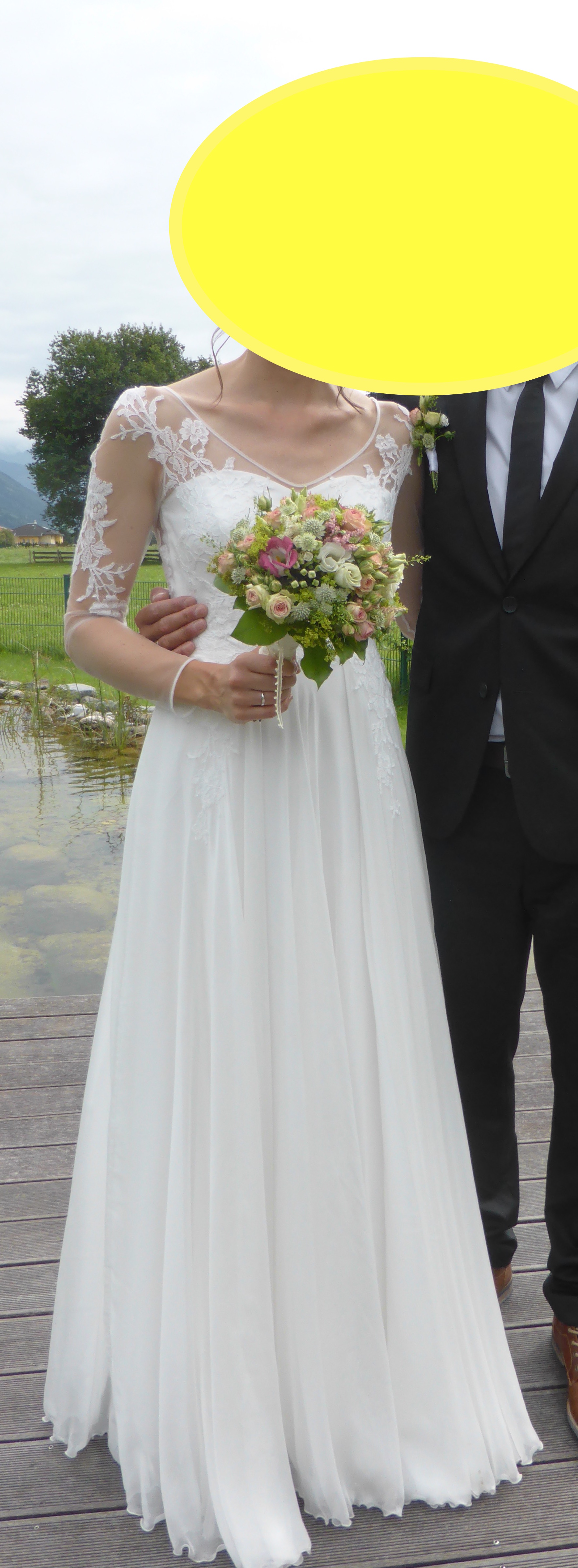 Das Kleid wurde einmal getragen, professionell gereiningt und hat zwei kleine Risse (max. 3cm) am äußeren Chiffon am unteresten Teil – nicht sichtbar beim Tragen – kann natürlich noch professionel genäht werden vor Übergabe.