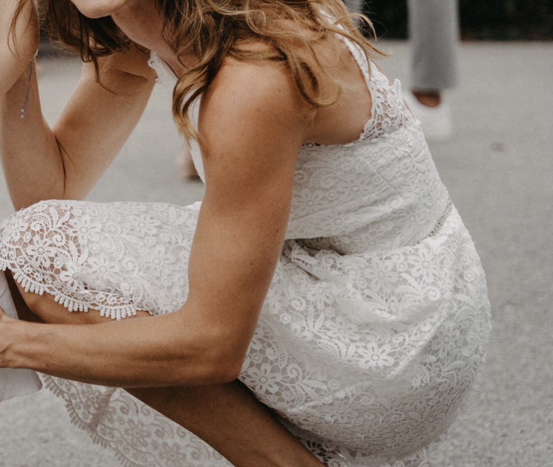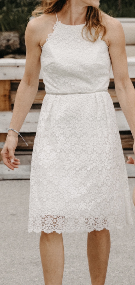 Ein wunderschönes, kurzes und elegantes Brautkleid der Marke White Kelsey Rose aus Spitze.