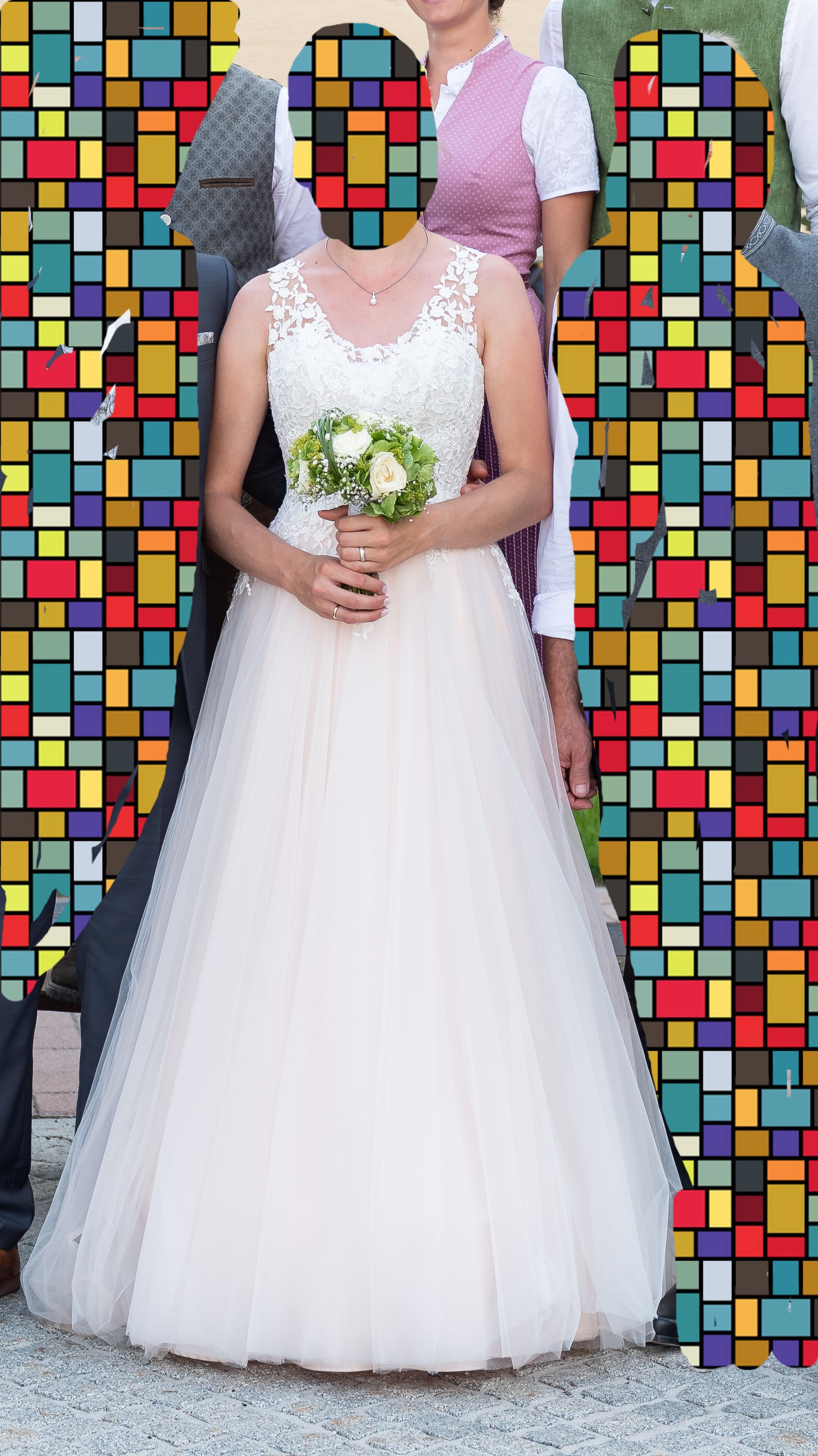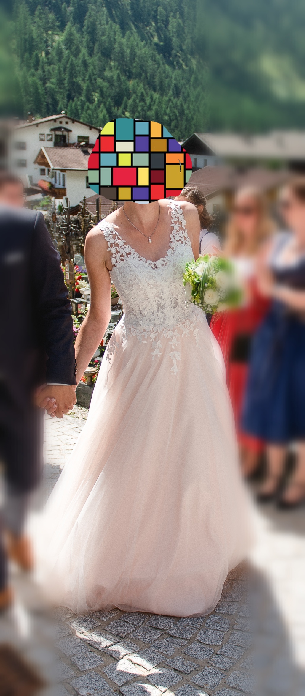 Ich verkaufe mein Brautkleid der Marke Elizabeth Passion. Die Spitze ist elfenbeinfarben, der Rock blush (siehe Fotos). Das Kleid wurde einmal getragen und dann professionell gereinigt. Ich bin ca. 1,78 cm groß und habe das Kleid mit fast flachen Schuhen und einem Reifrock getragen. Das Brautkleid wurde auf meine Länge gekürzt und der Ausschnitt etwas verkleinert (Ausschnitt war tiefer).