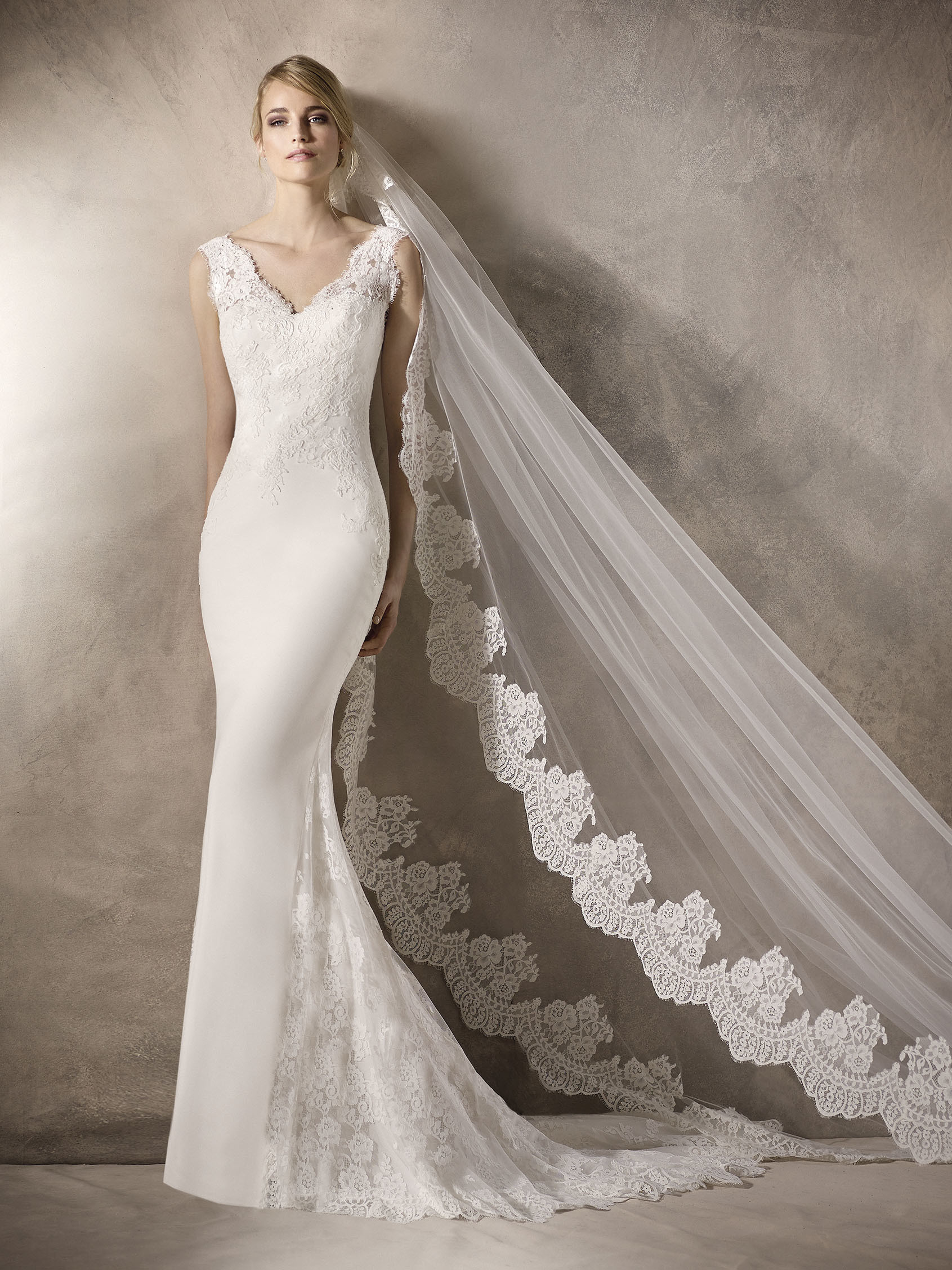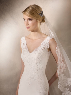 Meerjungfrauen Brautkleid aus Krepp kombiniert mit der wunderschönen spanischen Spitze am Oberteil und auf der Rückseite des Kleides.