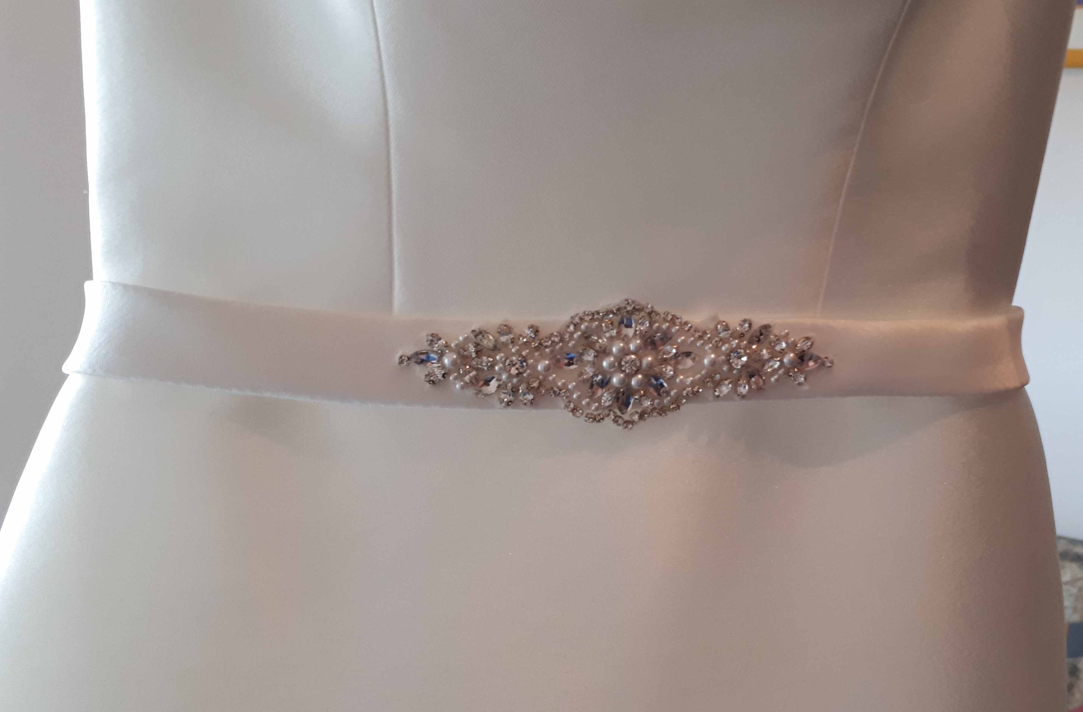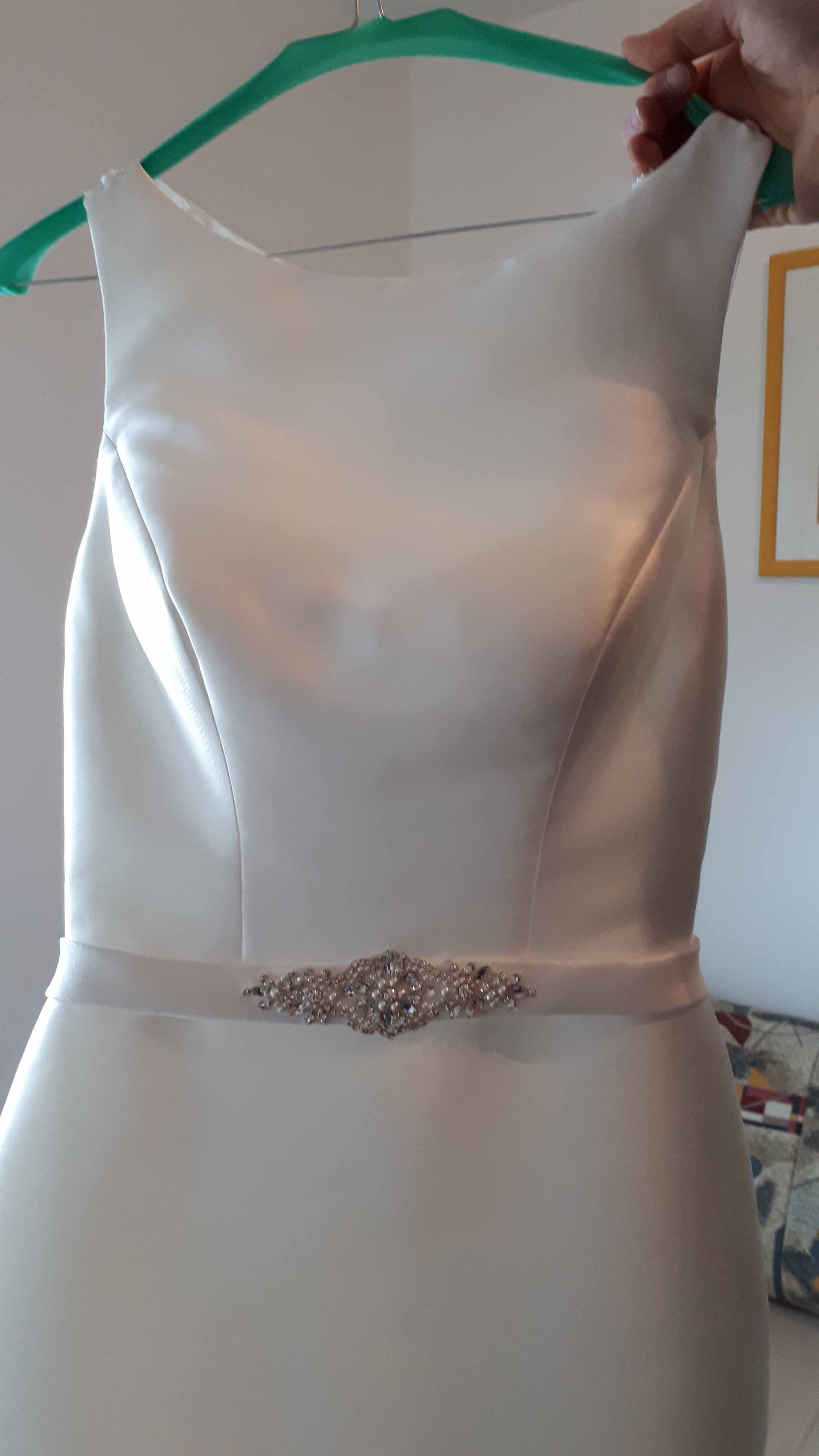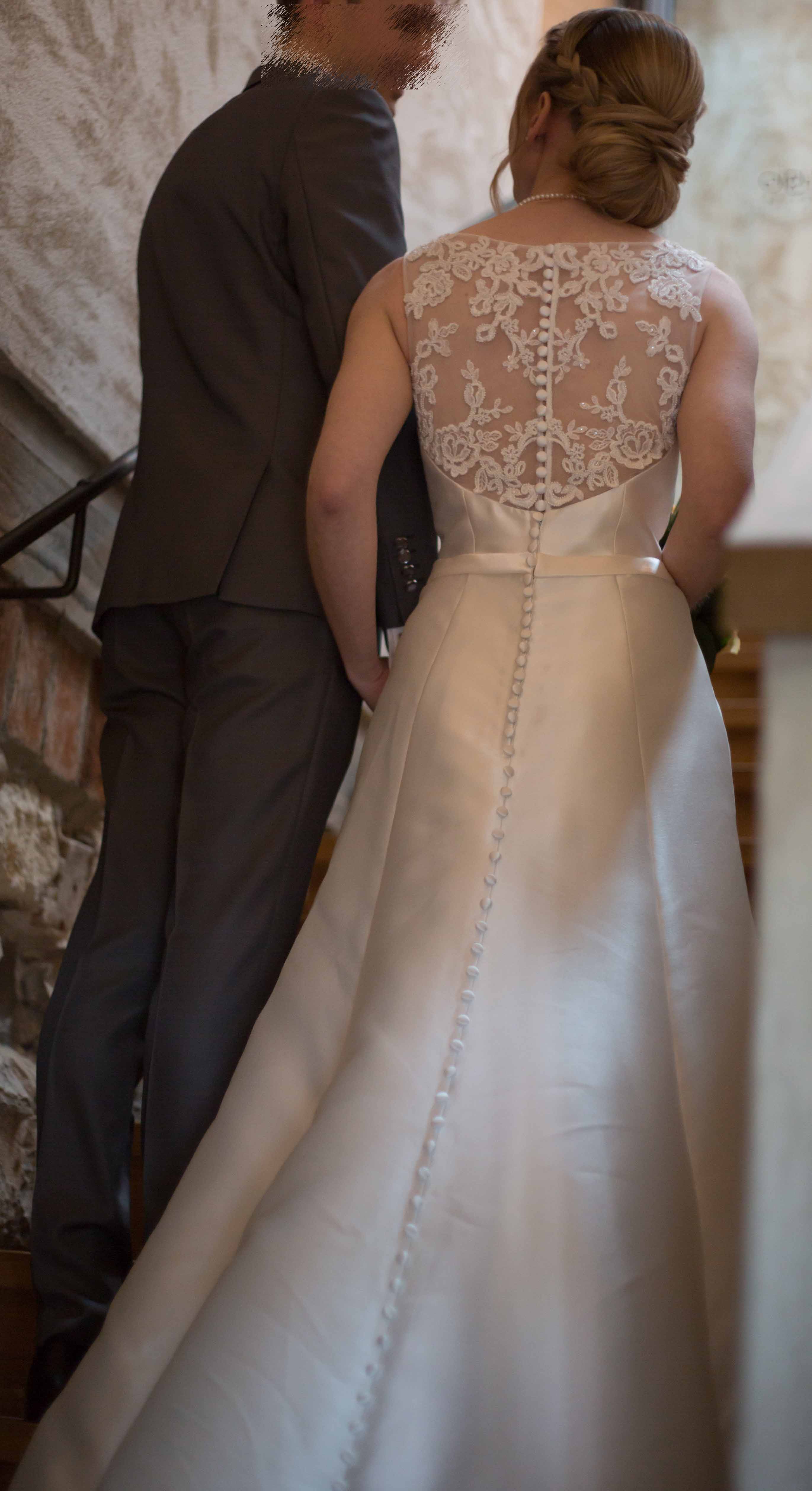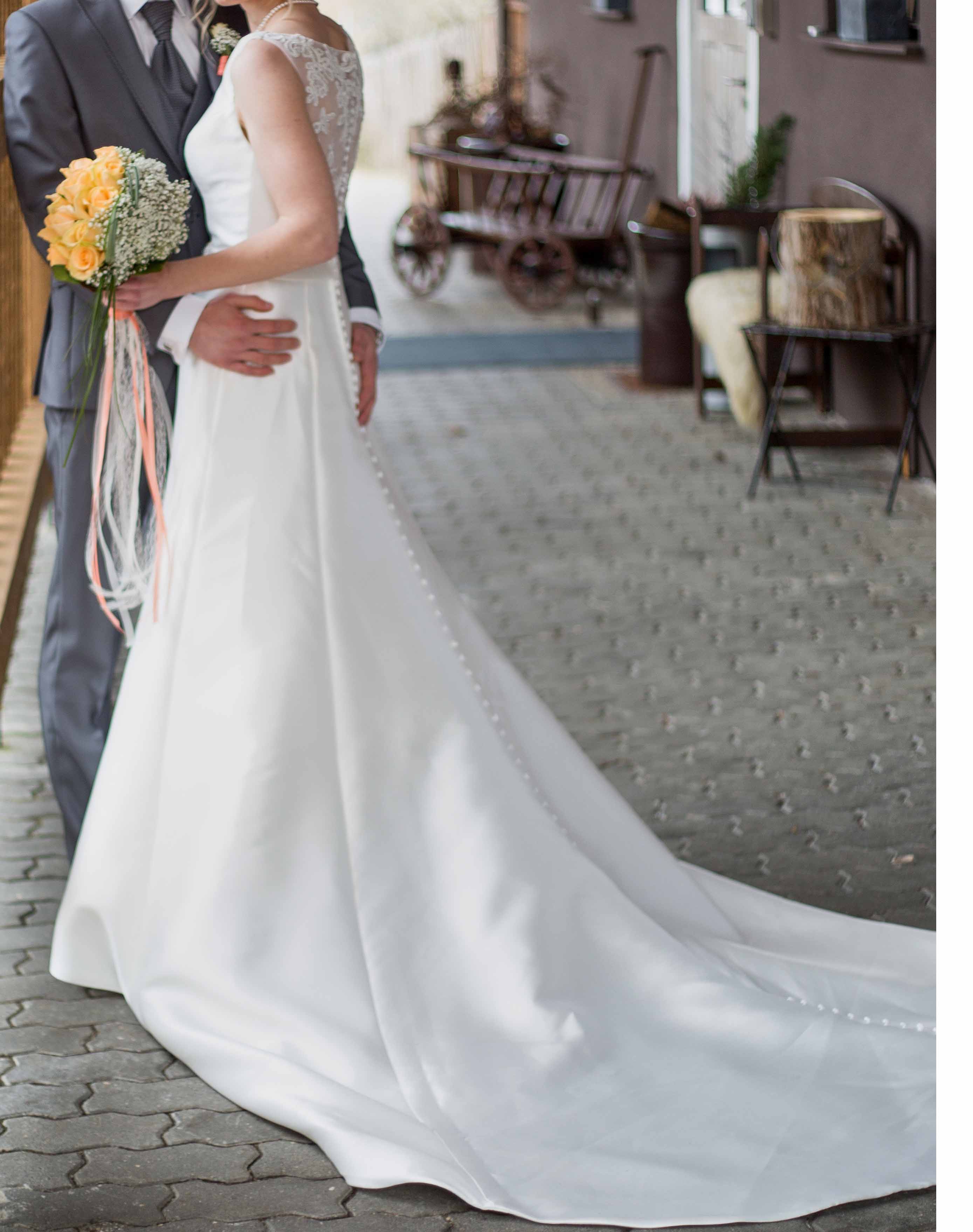 Das Kleid hat ein elegantes und schlichtes Design mit einem tiefen Rücken aus mit Perlen besetzter Spitze. Durch eine Knopfleiste wird das Kleid am Rücken verschlossen, die bis zum Ende der langen Schleppe durchgezogen ist. Ein schöner Glitzergürtel rundet das Kleid ab.