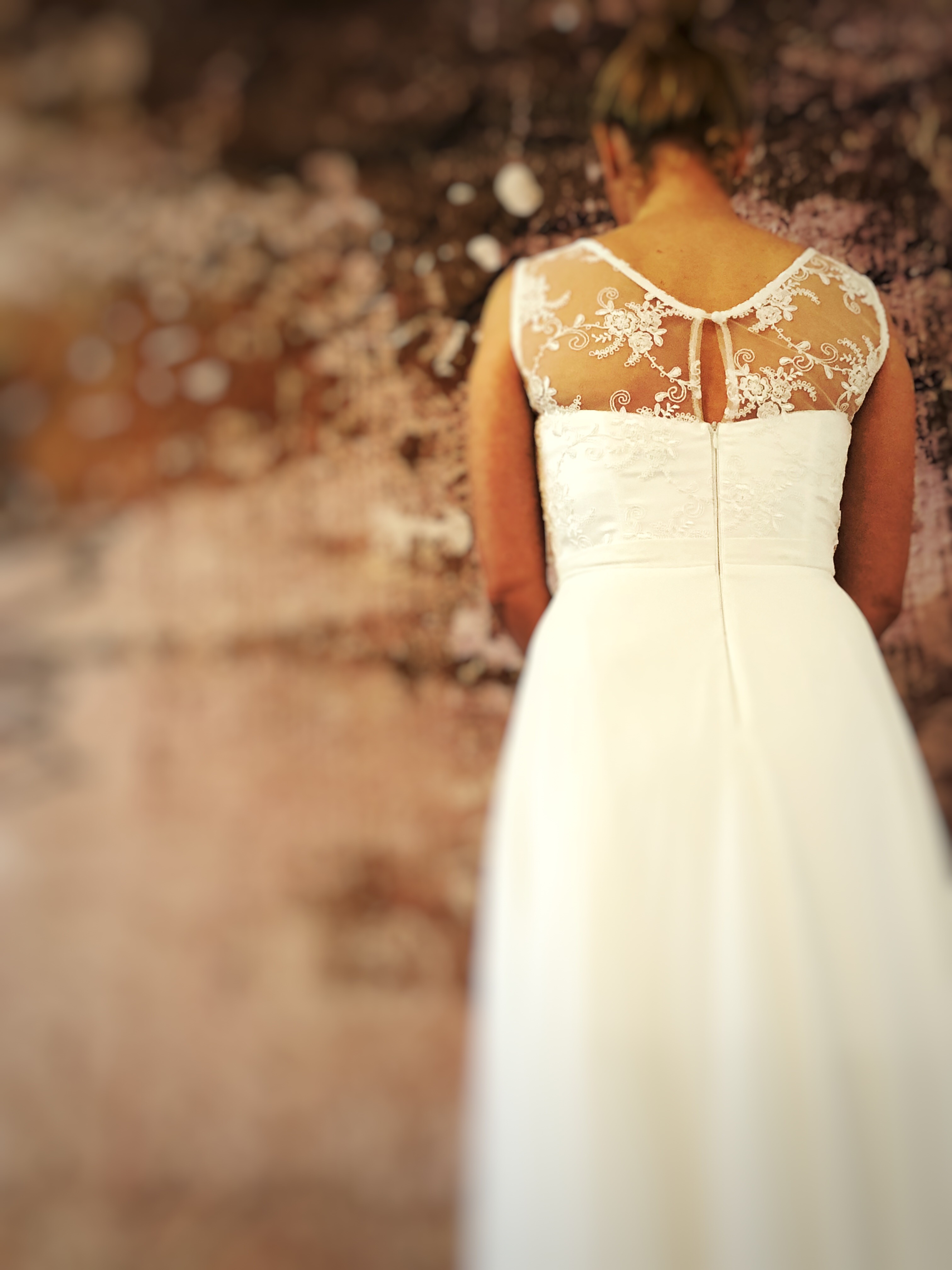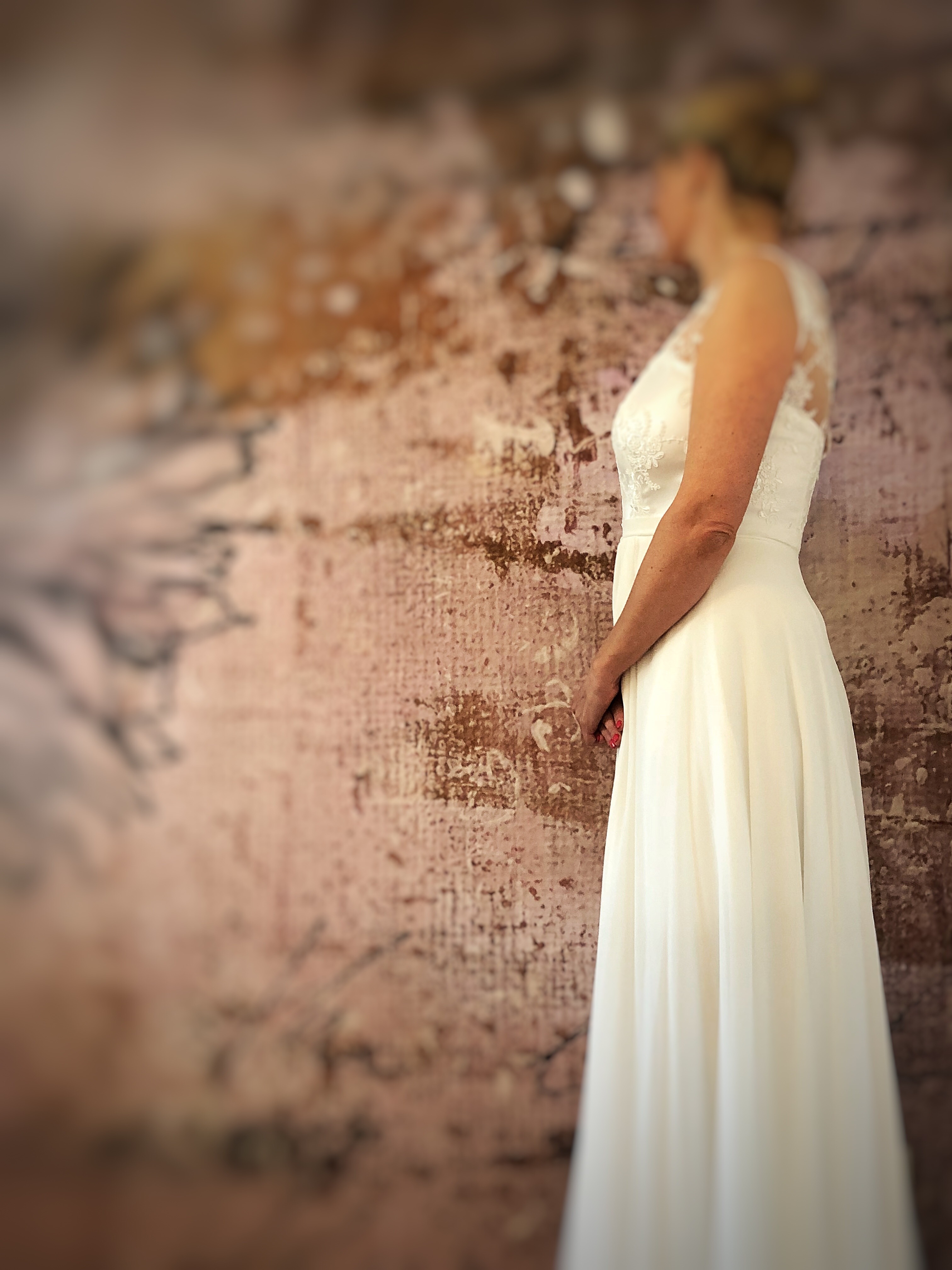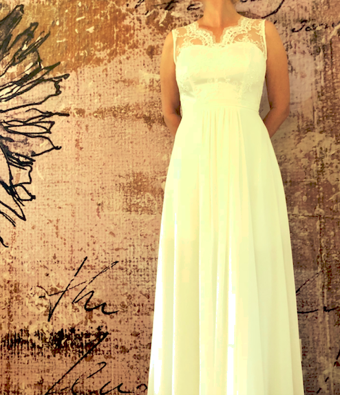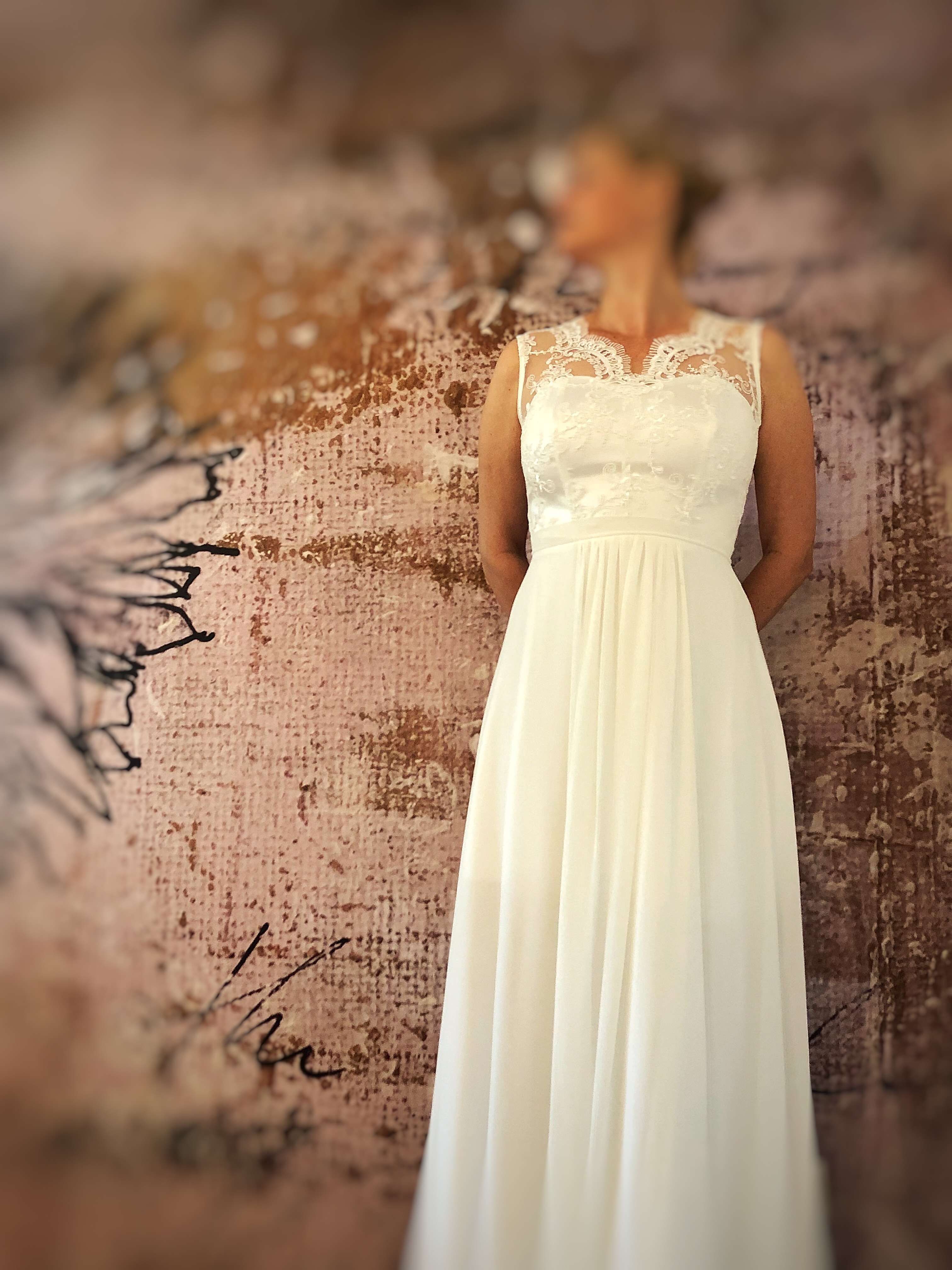 Liebe Bräute, hier habt ihr ein tolles, ganz leichtes Brautkleid für eine schwungvolle Partynacht. Unten weich fliessender Stoff, simple gehalten und oben mit traumhafter Spitze. Kann auch für eine Größe 40 passen :O)