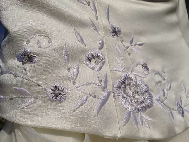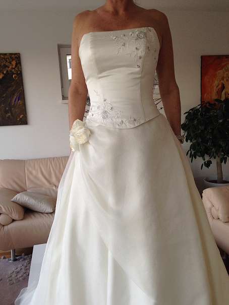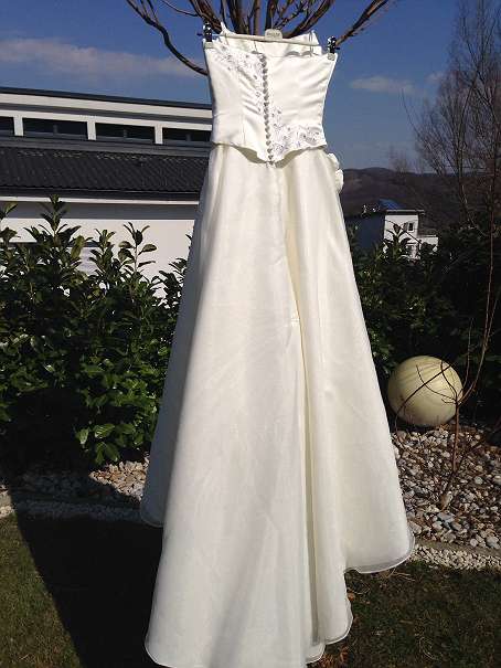 Wunderschönes elfenbeinfarbenes Brautkleid Gr. 36 , Satin matt glänzend mit aufwändiger Stickerei, als Korsage gearbeitet kann auch mit dünnen Trägern getragen werden, tüllrock mit Schleppe , vorne kurzer und rückwärts bodenlanger Schleier mit Satinrand, sonst transparent mit Ansteckkamm zu befestigen, sehr hochwertig, gereinigt wie neu, Marke Pronuptia de Paris, 1010 Wien, Neupreis € 1900