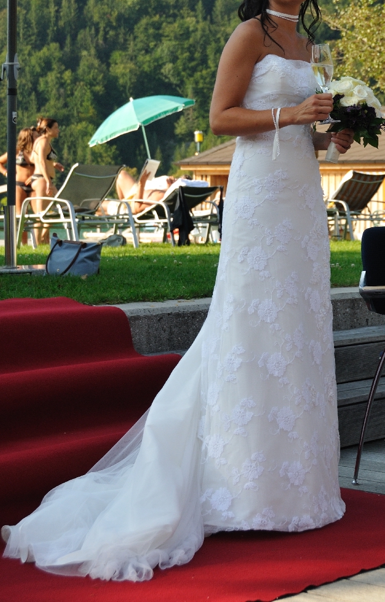 Italienisches Designer-Brautkleid (Originalpreis 1.500 Euro, Größe 34, offwhite) einmal! getragen sucht eine neue Braut, die sich an ihrem schönsten Tag im Leben wie eine Prinzessin fühlen möchte. Ich habe mich sehr wohl und wunderschön in dem Kleid gefühlt und es war etwas sehr besonderes mit der Spitze, den bestickten Blumen und Perlen und sehr schön figurbetont. Eine lange Schleppe hat es, die man auch raufstecken kann. Dazu passender Schmuck gibt es ebenfalls.