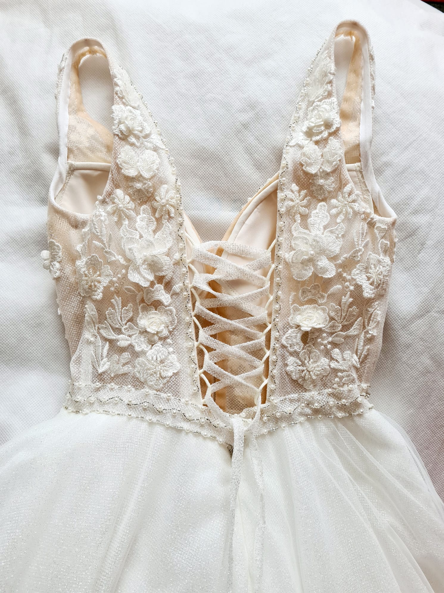 Oberteil leicht durchsichtig und glitzert, Tattoo lügen, Schnürung hinten mit Glitzerband, Perlenbesetzung an Trägern und Bund, Roch fließend, glitzert wunderschön, leichtes Kleid.
