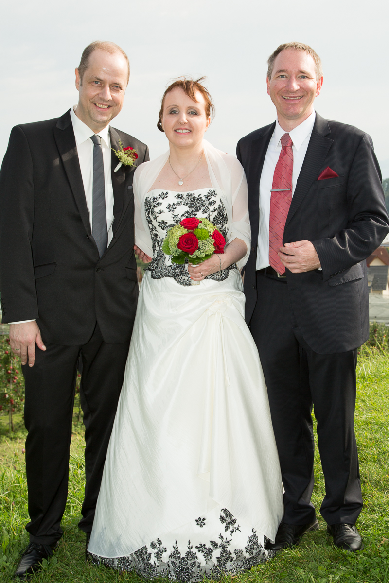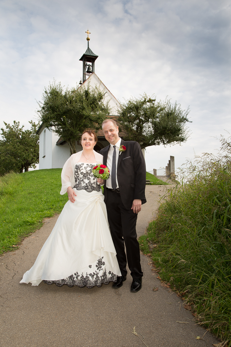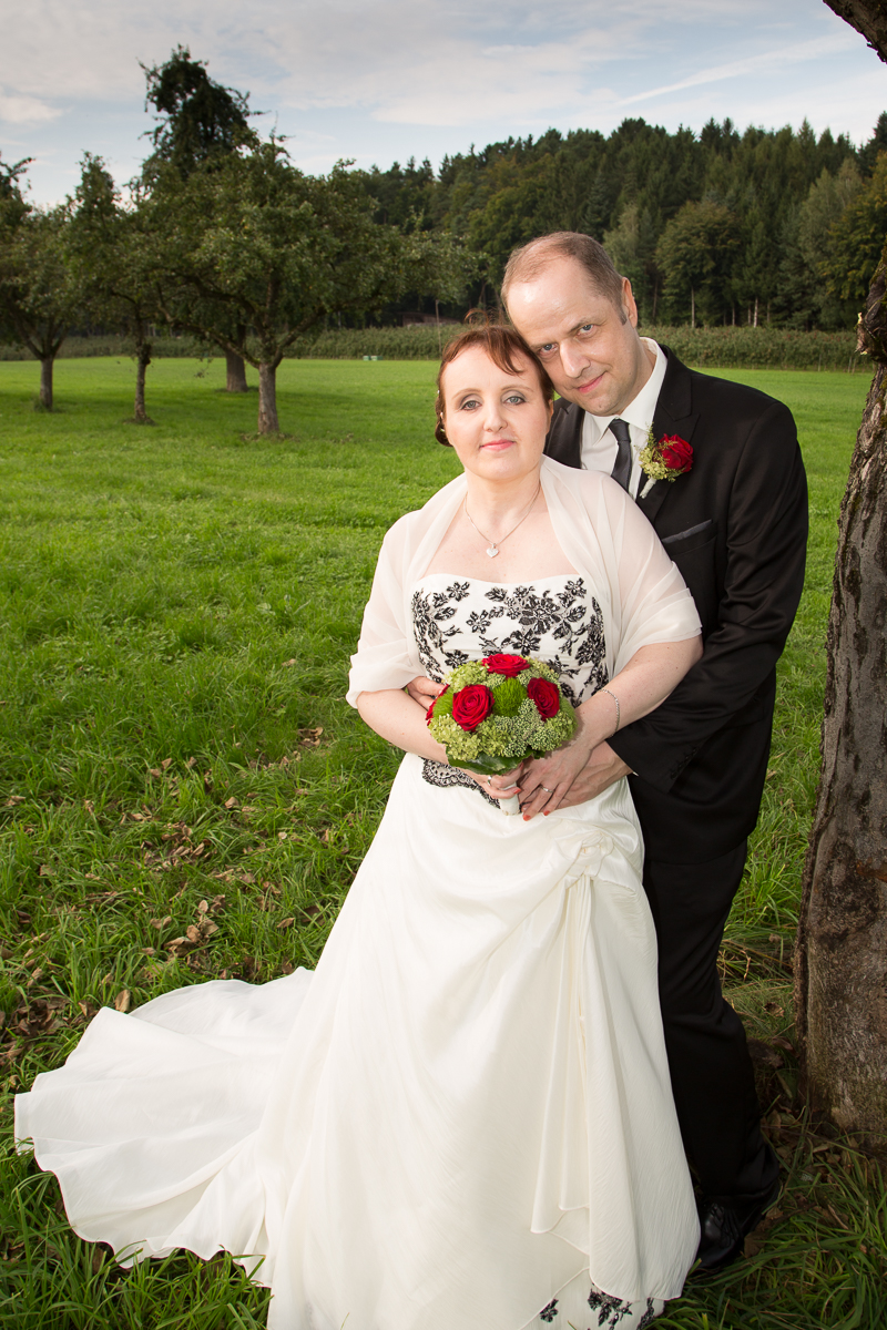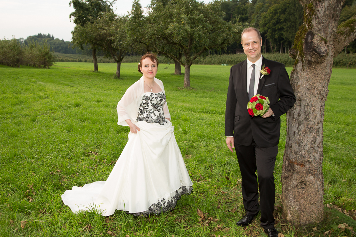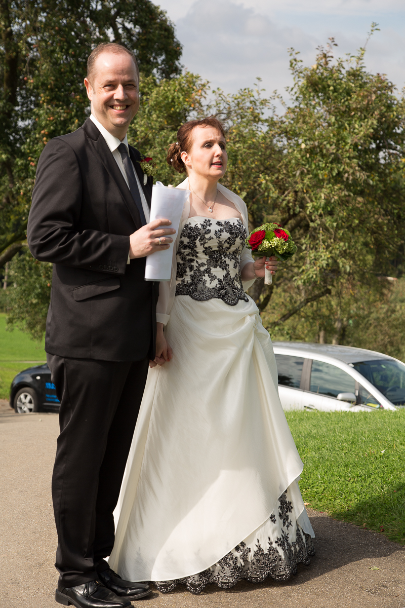 Das Kleid hat eine kurze Schleppe und kann mit einem Knopf hochgesteckt werden. der Saum besteht wiederum aus schwarzer Stickerei. Ich bin 164 cm groß und meine Brautschuhe hatten einen Absatz von 10 cm.