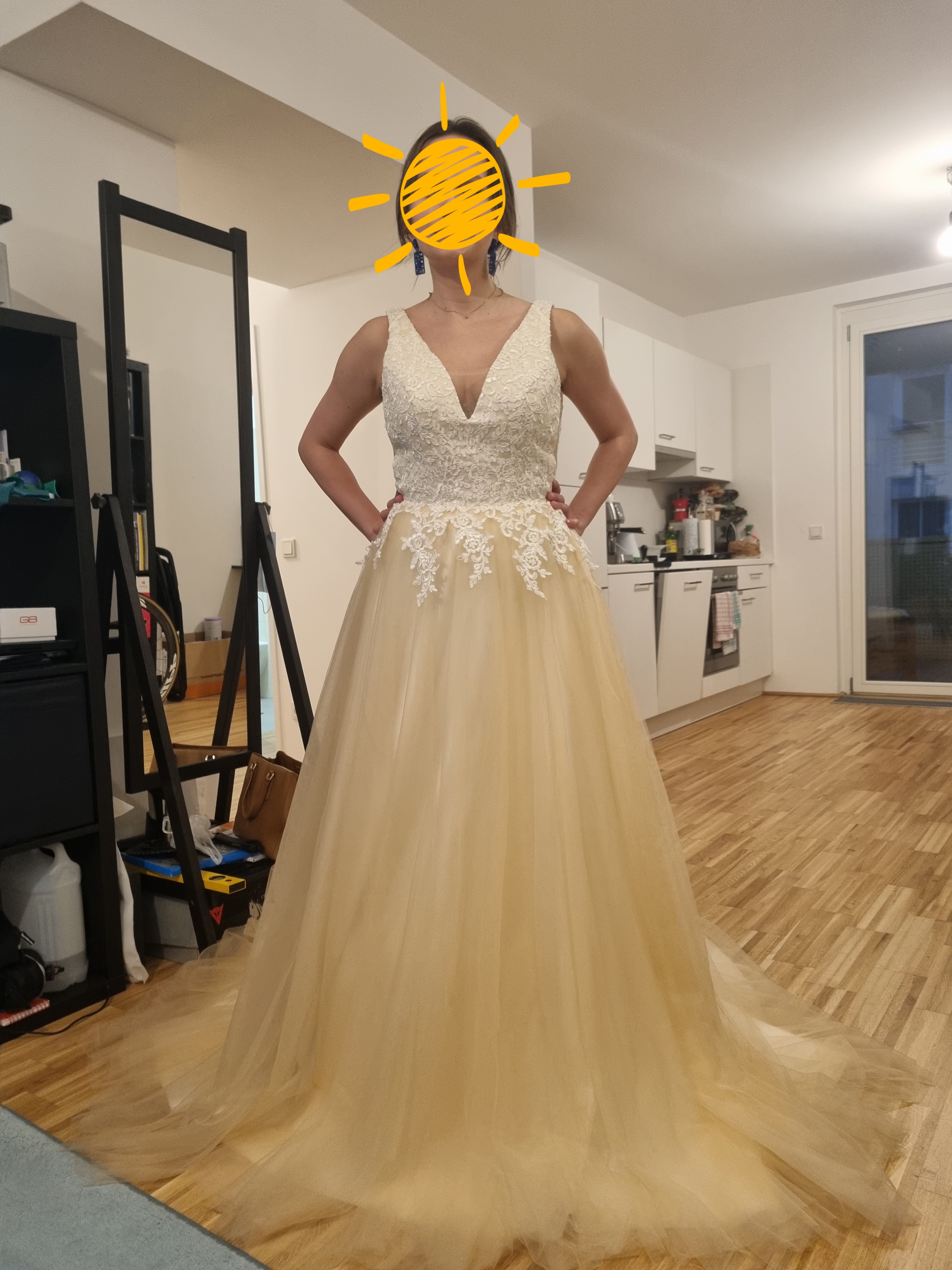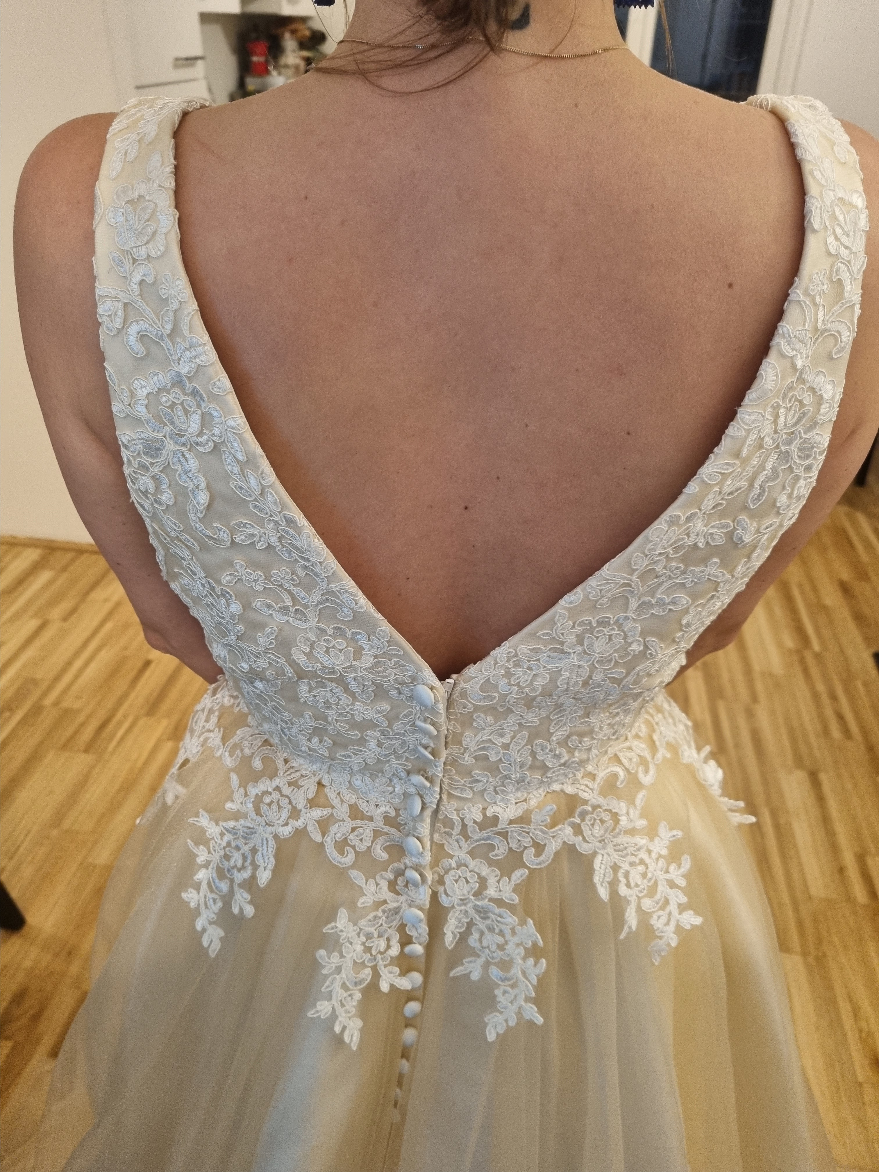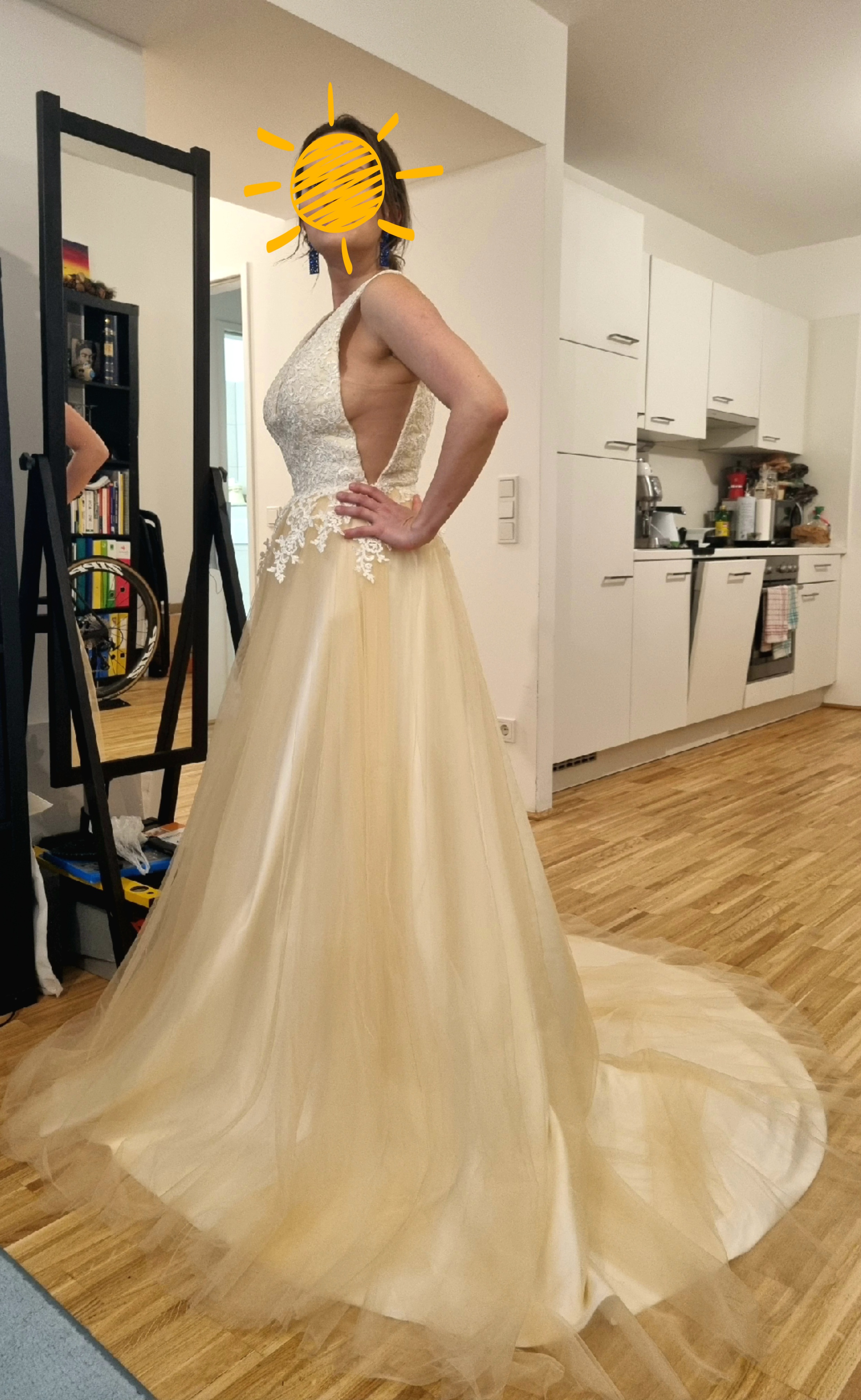 Was das Kleid besonders macht, ist das Farbenspiel (Champagner kombiniert mit Ecru) sowie der Ausschnitt mit Tüllakzenten oben bei der Brust und unter den Achseln.