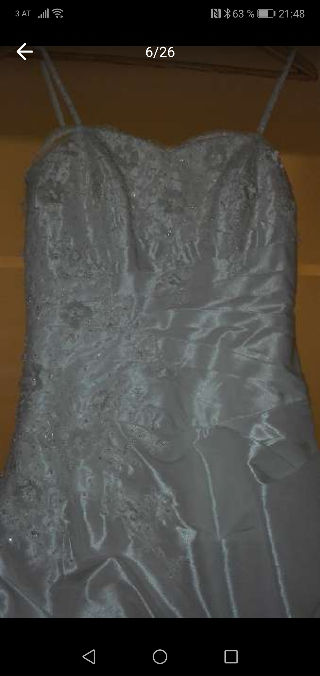 Die Auschnittsform des Kleides ist herzförmig, die Träger des Kleides sind schmal und mit zarte Perlen bestickt, die Form des Oberteils ist eng anliegend und ist hinten mit Reißverschluss zum verschließen und endet mit einem Haken. Die Form des Rockteils besteht aus vier Lagen und ist ab der Taille gerafft bis nach unten zum Wadenbein. Verzierungen mit Stickereien, Perlen, Blümchen und Ähnlichen gibt es am Brautkleid vom Auschnitt und endet abfließend bis nach unten wo die Raffung endet. Die Länge des Kleides reicht bis zum Boden mit einer Körpergröße von 167cm, die Brautschuhe mit einer Absatzhöhe von 4cm sind gerade noch verdeckt.