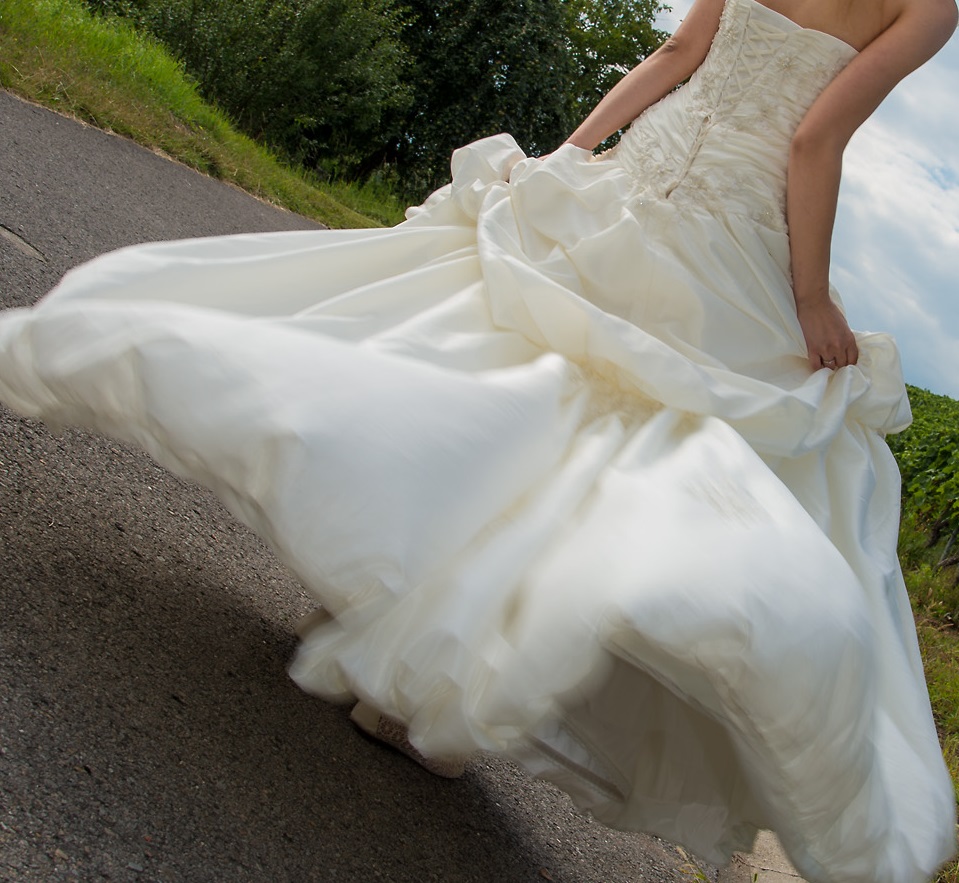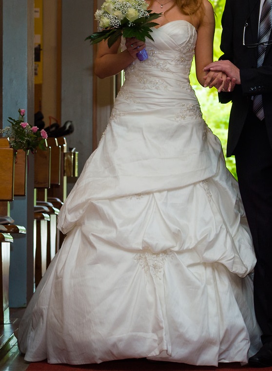 Eine Schleppe hat es auch, die im weiteren Verlauf der Hochzeit hochgesteckt werden kann.