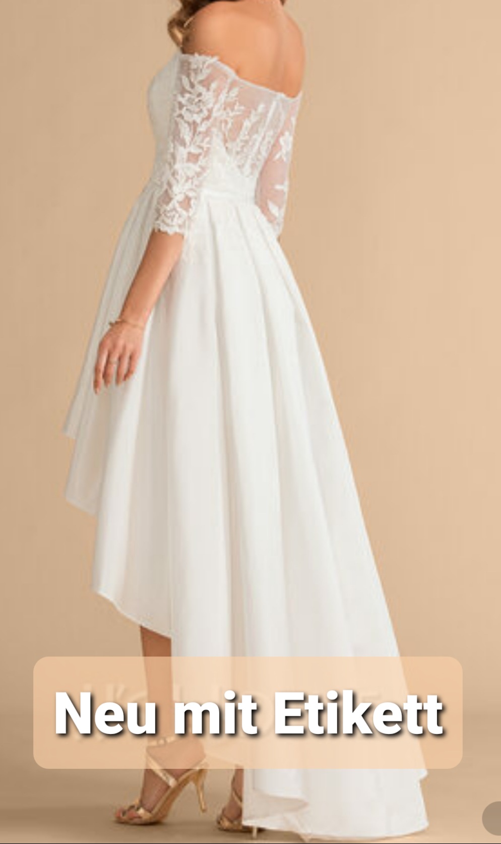 A-Linie mit asymmetrischen Rock (Vokuhila) schulterfrei und mit halblangen Ärmel aus Spitze und Applikationen.