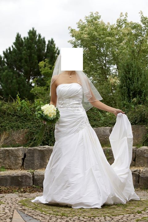 Dieses A-Linien Brautkleid ist trägerlos mit Corsage. Stickerei mit Pailetten auf der Corsage und verläuft seitlich bis in den Rock. Der Rock ist seitlich gerafft. Im Rücken wird das Kleid geschnürt, daher ist es variabel in der Passform. Schleppe ist leicht A-Symmetrisch mit einer Schleife, um den Rock beim tanzen an die Hand zu stecken. Kleid kann man hochschnallen.