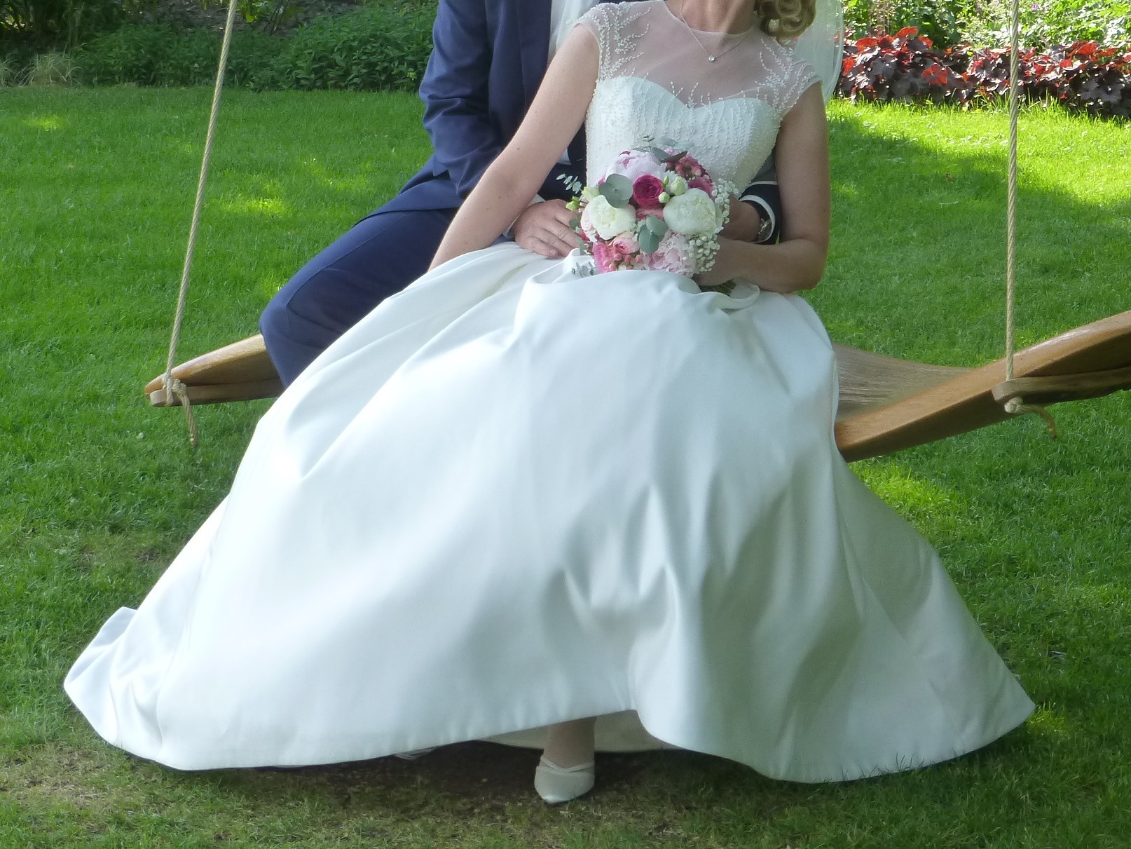 Ich bin 1,72 cm groß und trage Konfektioinsgröße 36. Das Kleid passte perfekt und musste nicht geändert werden. Lediglich die Länge wurde um 1,5 cm gekürzt und Cups für ein schöneres Dekoltee wurden eingenäht – können aber problemlos entfernt werden. Nach der Hochzeit wurde das Kleid in eine professionelle Reinigung gebracht. Es sieht aus wie neu und hat keine Flecken oder Defekte. Leider fehlen mir bis dato noch die Bilder der Fotografin. Einige Bilder sind im Brautgschäft entstanden.