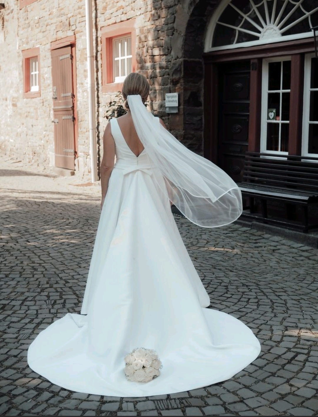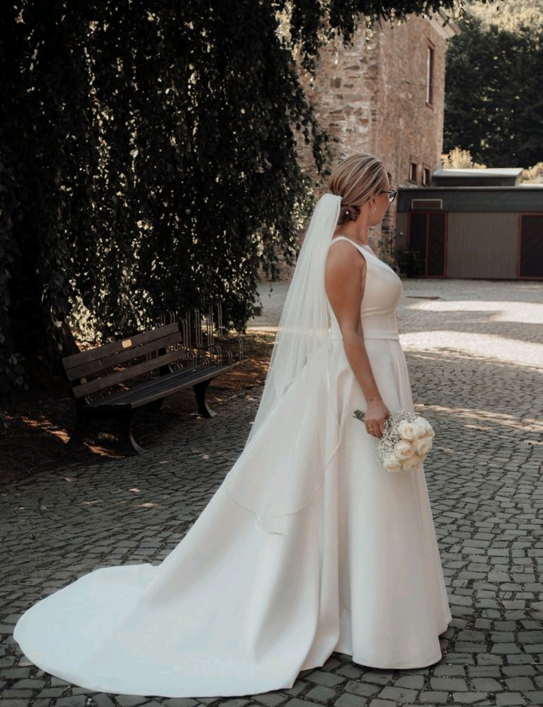 Verkaufe hier mein wunderschönes Brautkleid inklusive Schleier. Die Farbe ist “ivory”, es hat an beiden Seiten Taschen und befindet sich in einem einwandfreien Zustand. Das Kleid wurde bereits gereinigt. Ich bin 1.62 m groß und habe 7 cm hohe Absätze getragen.