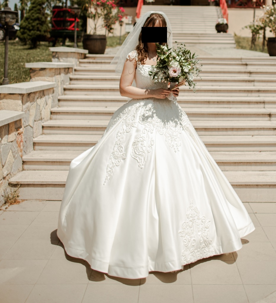 Ich verkaufe mein wunderschönes Prinzessin-Hochzeitskleid aus hochwertigem Satinstoff. Die Schleppe kann man hinten mit Knöpfen befestigen, so stört es nicht beim Tanzen. Ich habe es mit einem Reifrock mit ca. 115cm Durchmesser getragen. Ich bin 164cm, 55kg und habe es mit Schuhe mit 5,5cm Absatzhöhe getragen. Das Kleid ist in einwandfreiem Zustand und wurde schon gereinigt und gebügelt. Für weitere Fragen stehe ich gerne zur Verfügung!