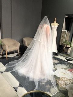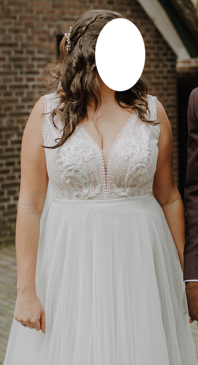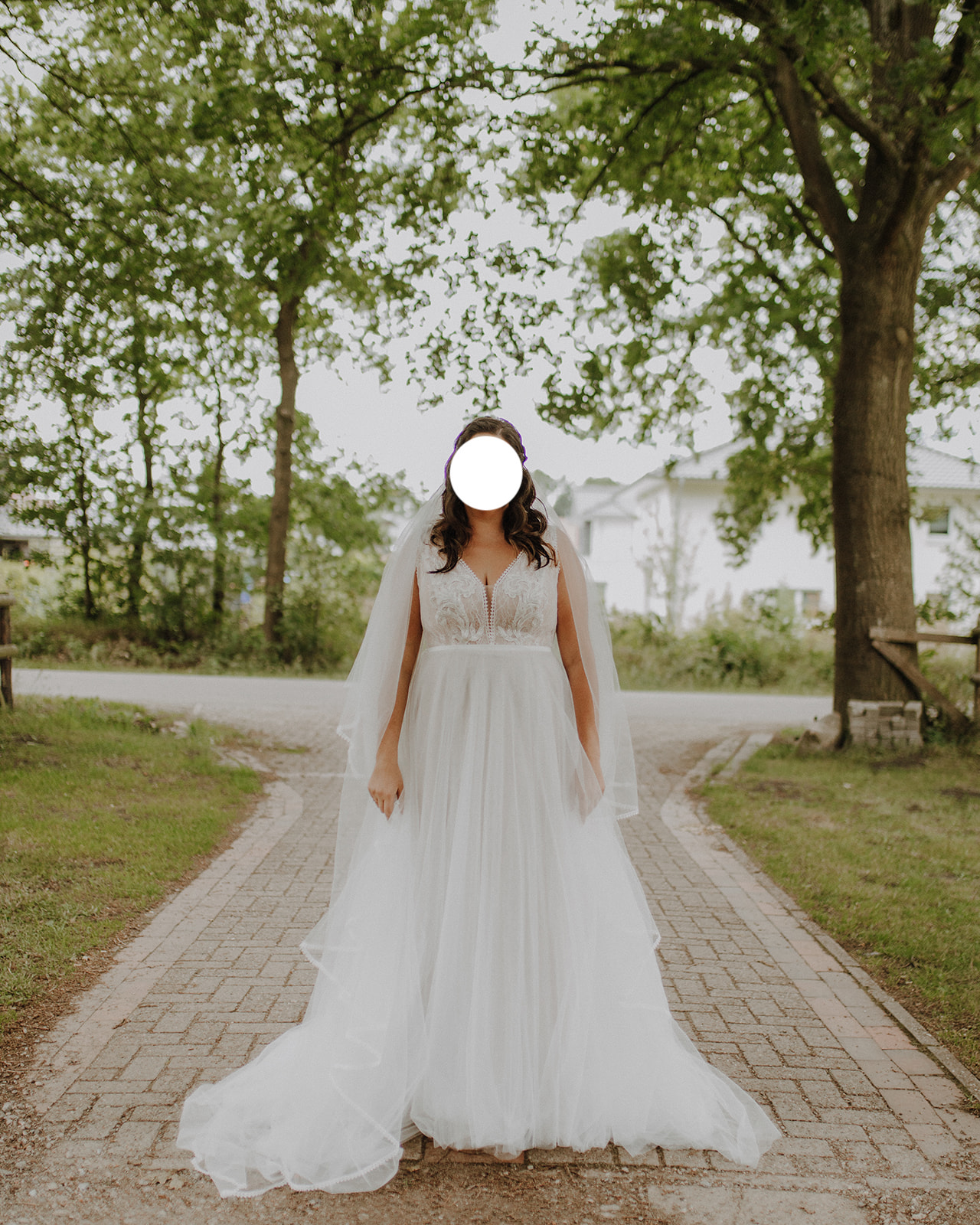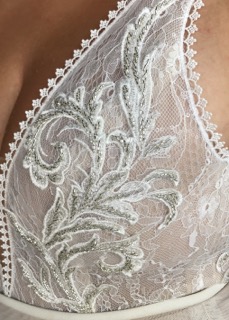 Das Oberteil hat einen tiefen Ausschnitt (sowohl hinten, als auch vorne) welche am Rand mit Spitze versehen ist. Die gleiche Spitze findet man am passenden 3,5 m langen Schleier.