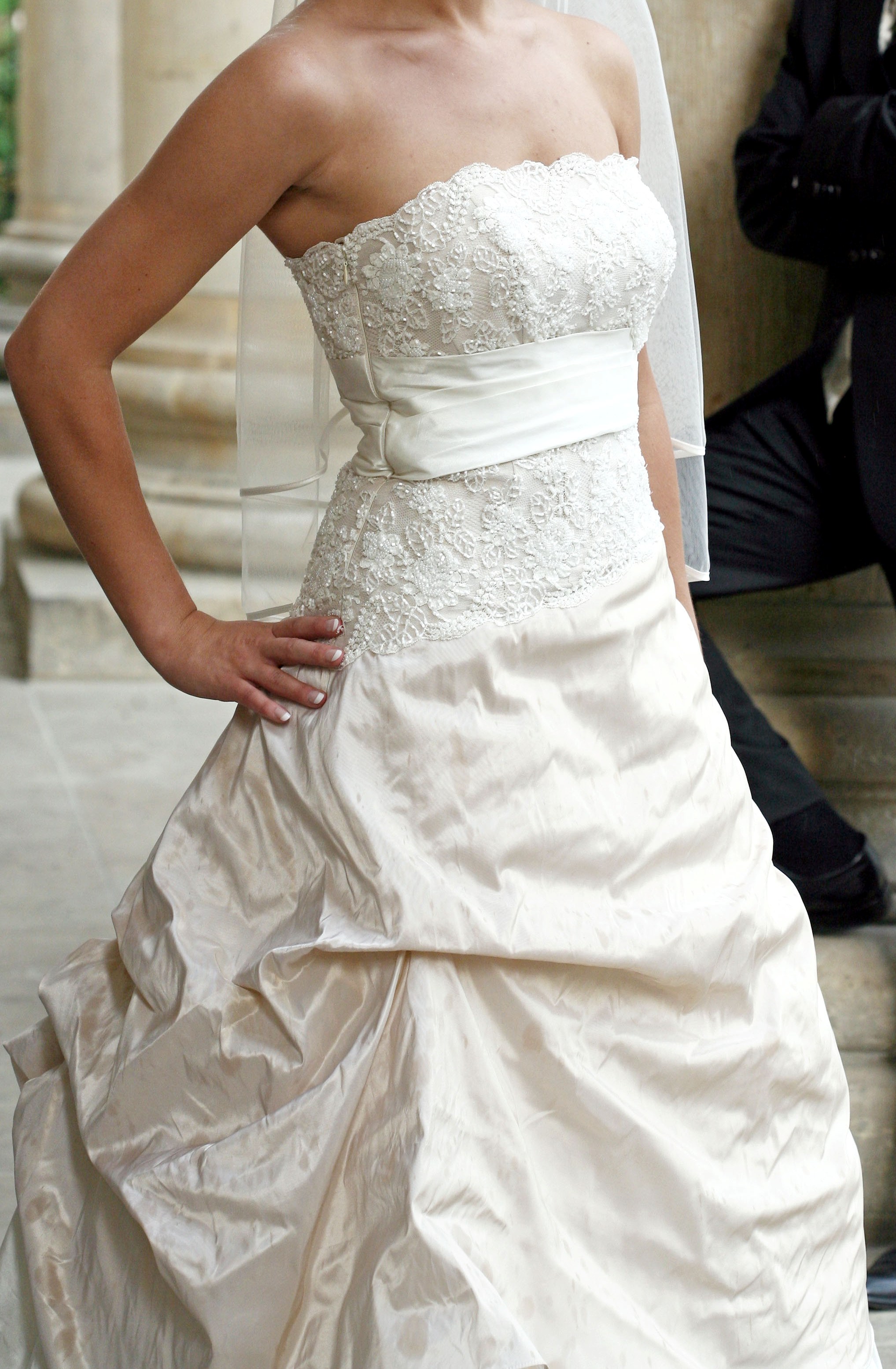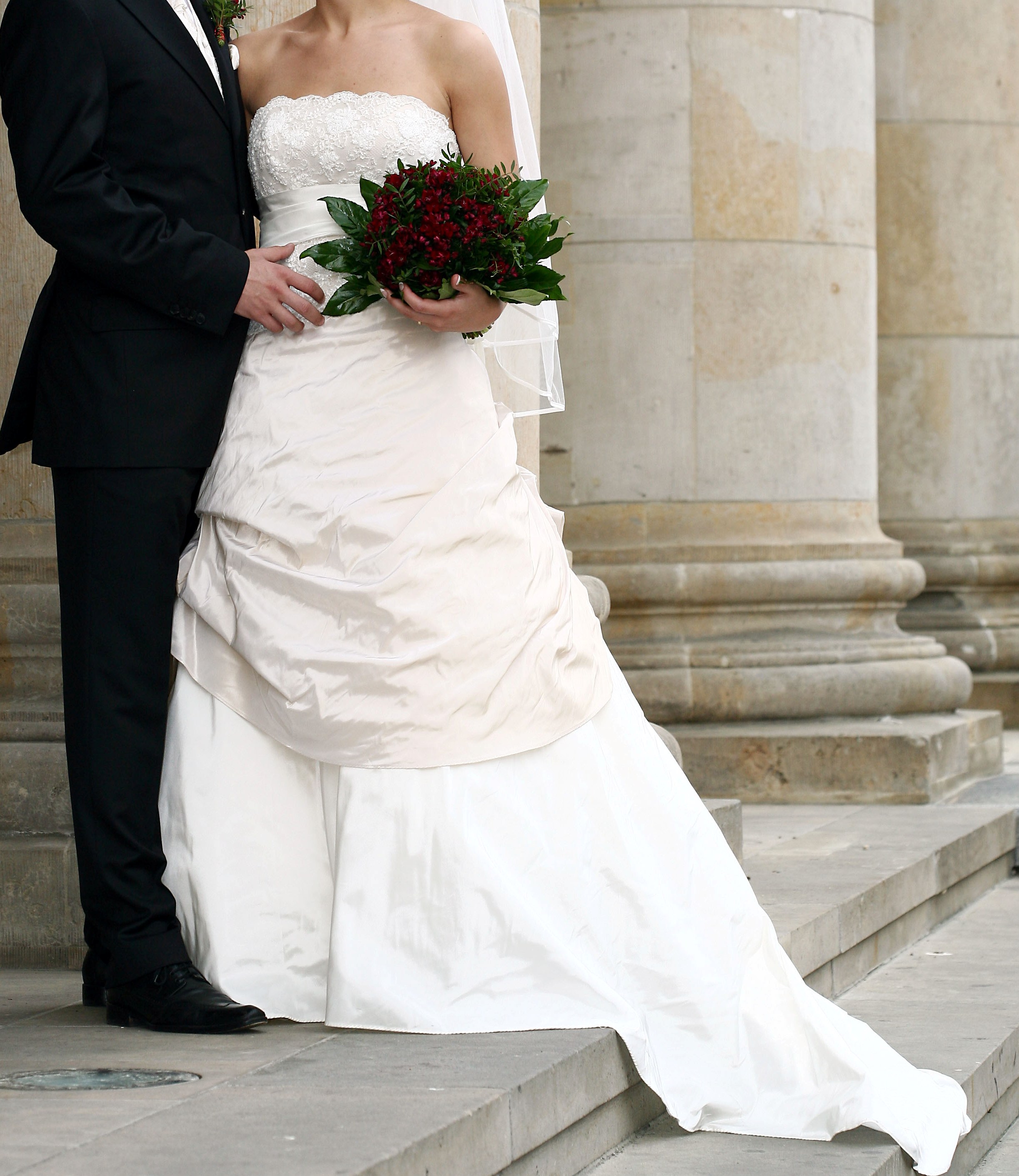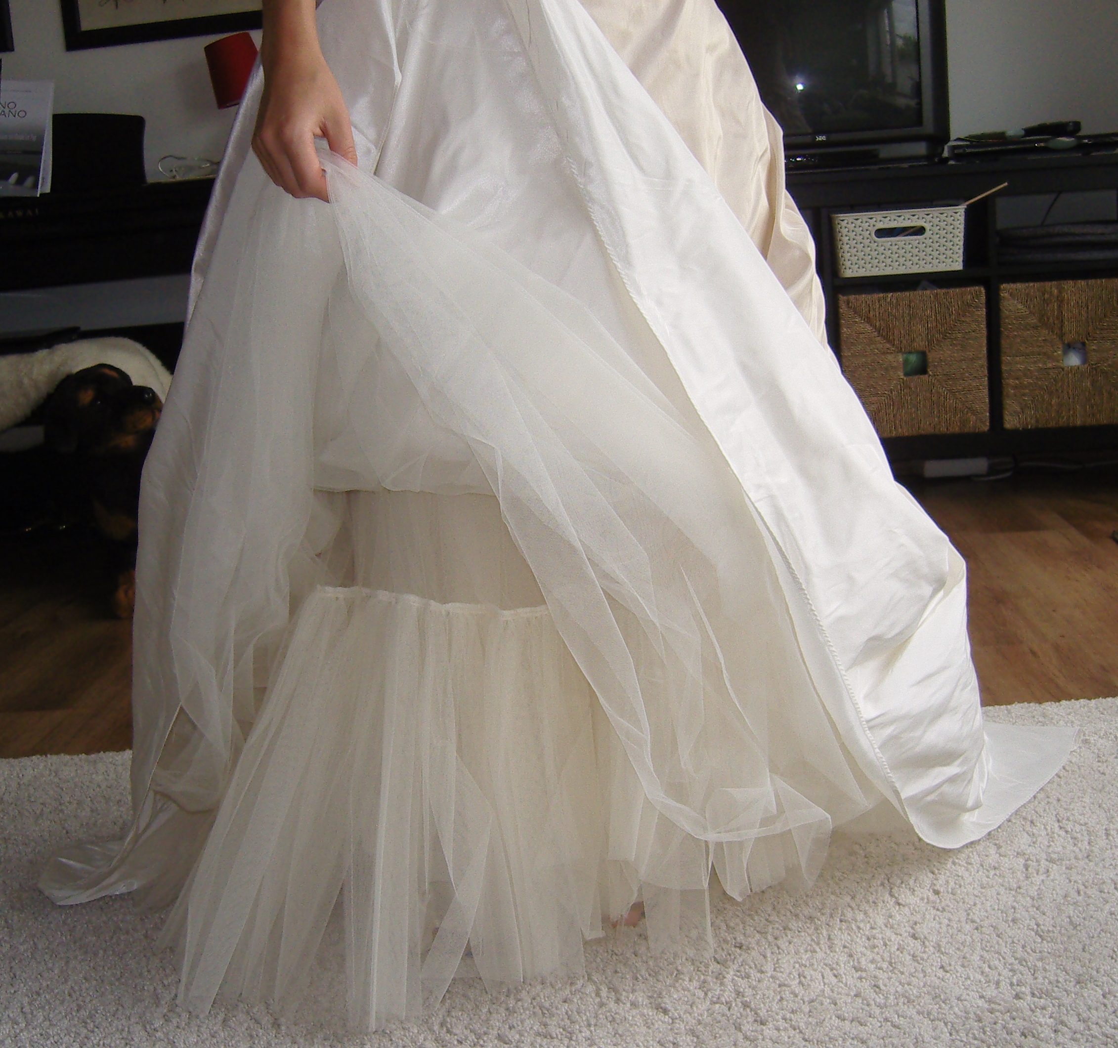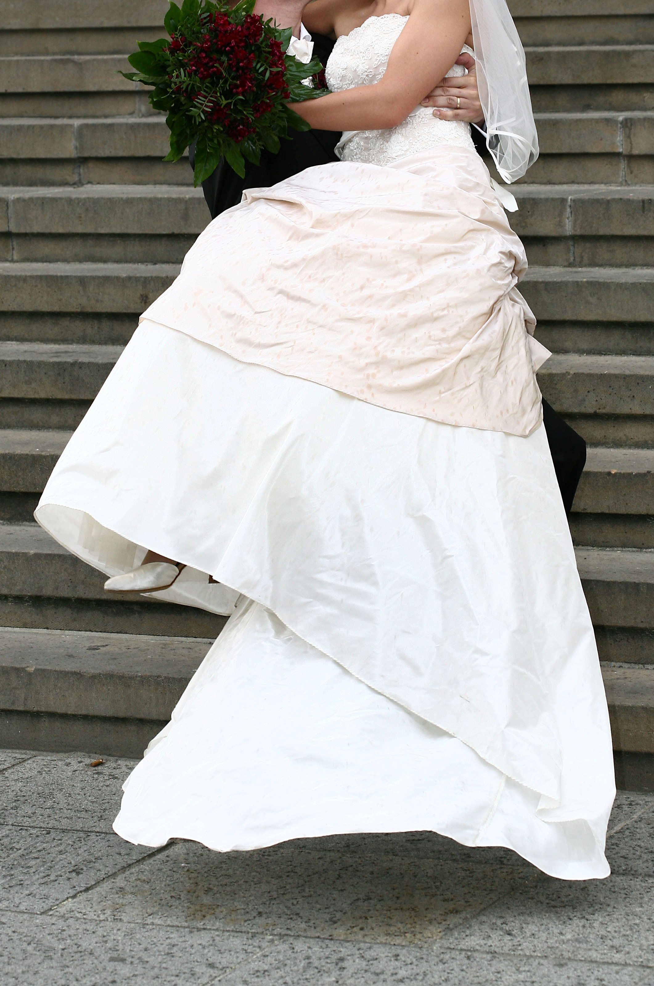 Eine Schneiderin hat innen kleine Bänder angebracht, um die Schleppe aufzuhängen, dann kann man besser tanzen. Es hat auch eine Fingerschlaufe, wenn man die SChleppe nur heben will beim Tanzen.