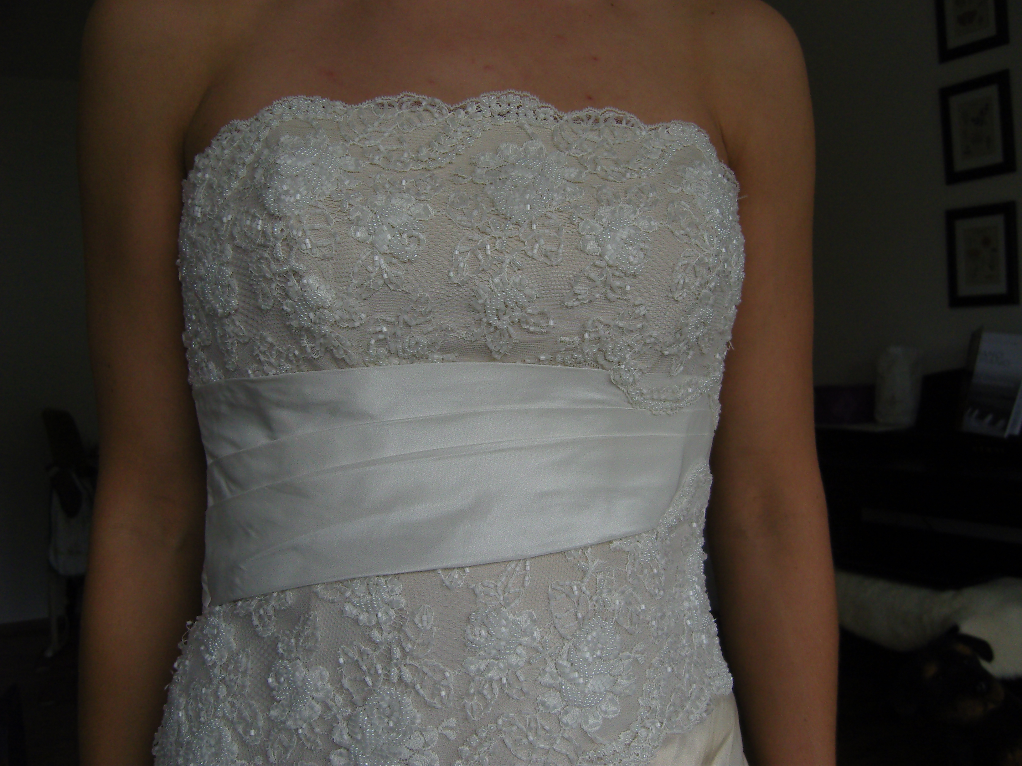 Die Korsage ist auch in diesem schimmernden Blush und wird überzogen von aufwändiger Spitze. Ein Taftband in Elfenbein macht die Taille zum Hingucker, man bekommt eine richtige Prinzessinnen-Silhouette.