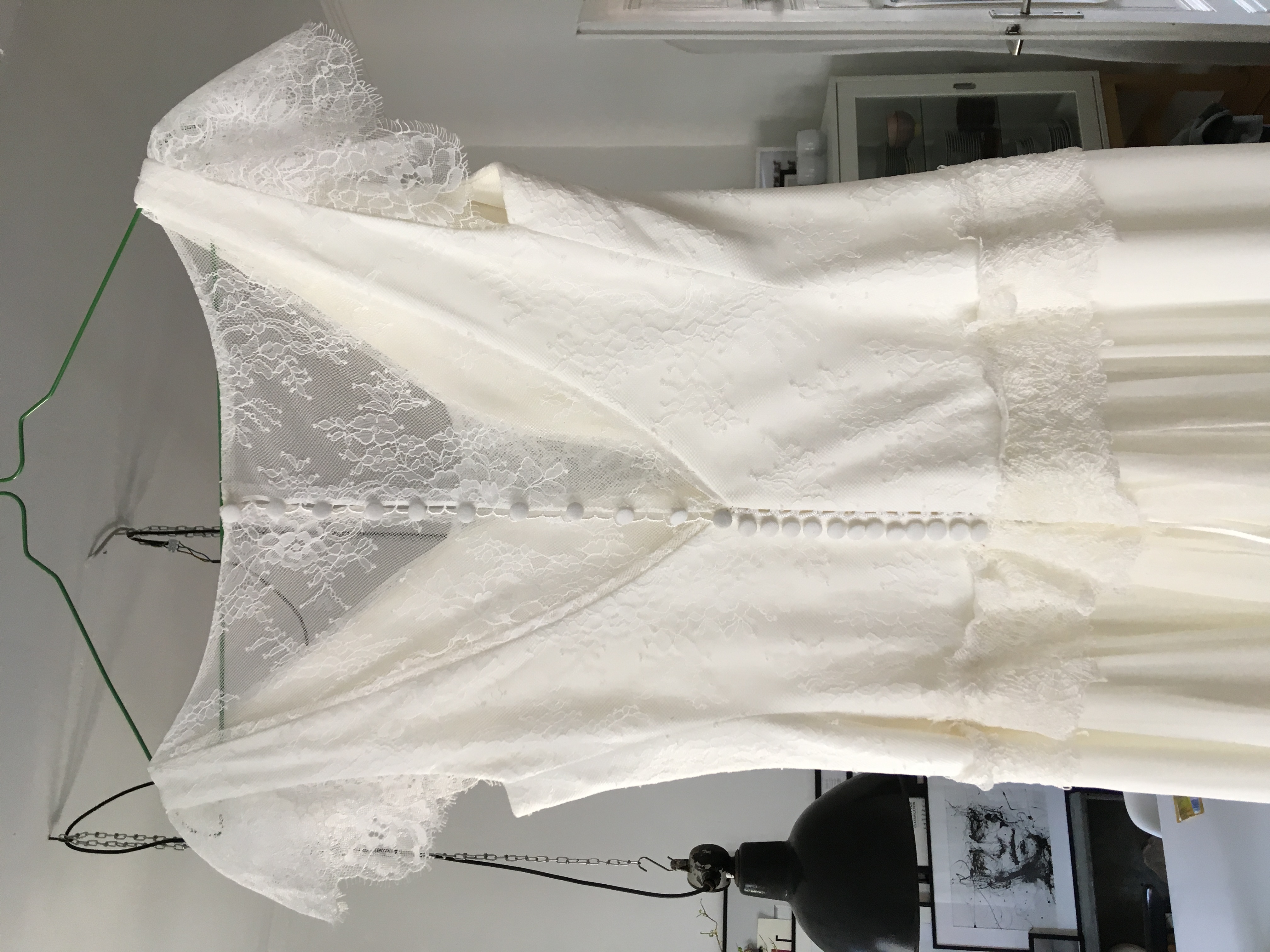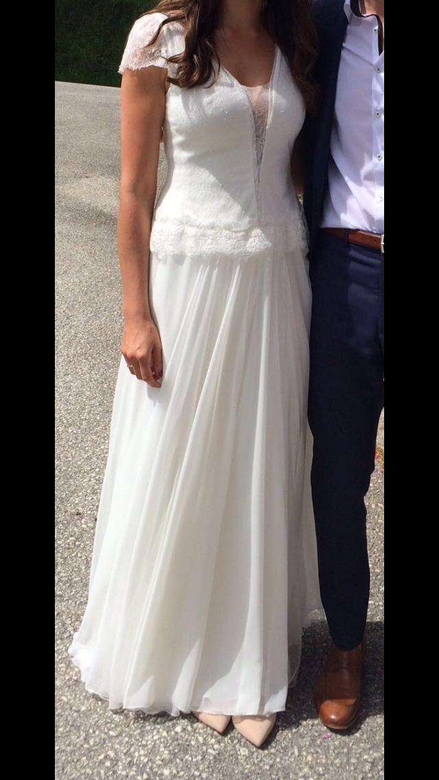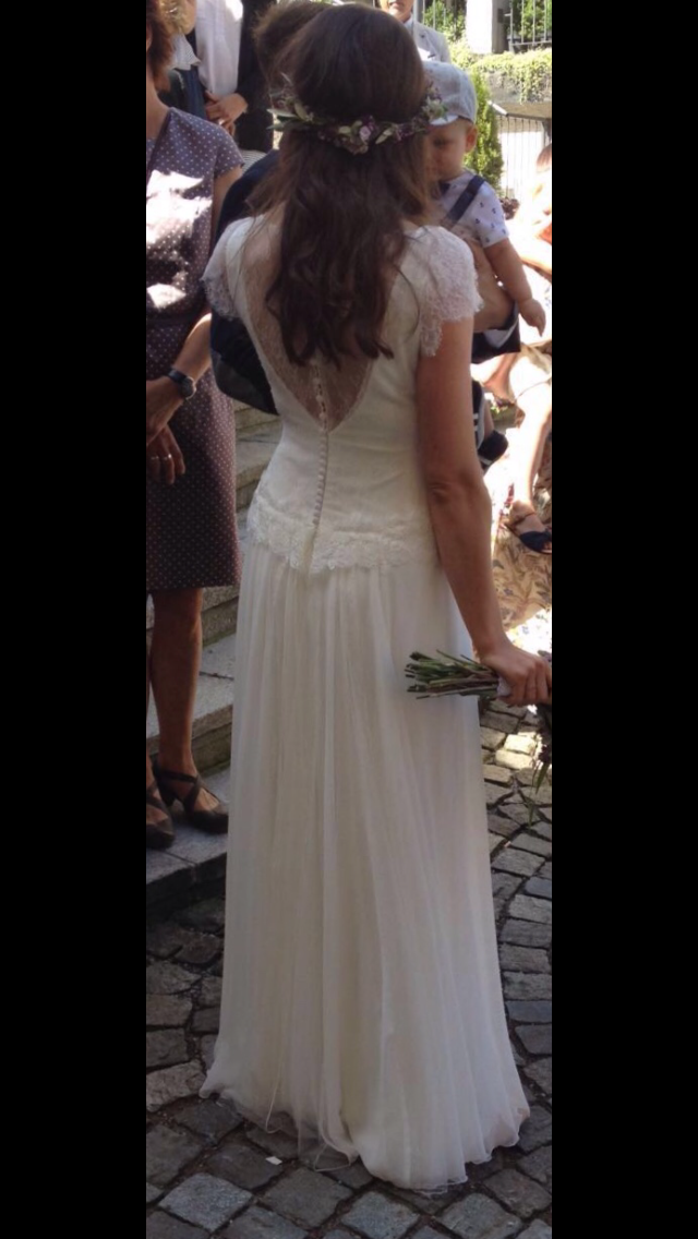 Verkaufe mein Hochzeitskleid im boho/vintage Stil. Die Knöpfe am Rücken sind echt und der Stoff ist sehr weich und edel. Es hat wunderschöne Details aus Spitze, wie z.B. die kleinen Flügelärmel, der Ausschnitt am Dekolleté und am Rücken sowie an der Hüfte und auch am Rock. Ich habe es 2016 für 1.700 € gekauft. Das Kleid vor kurzem gereinigt worden und ist in einem sehr guten getragenen Zustand. Die Größe ist 38, es wurde jedoch etwas angepasst.
