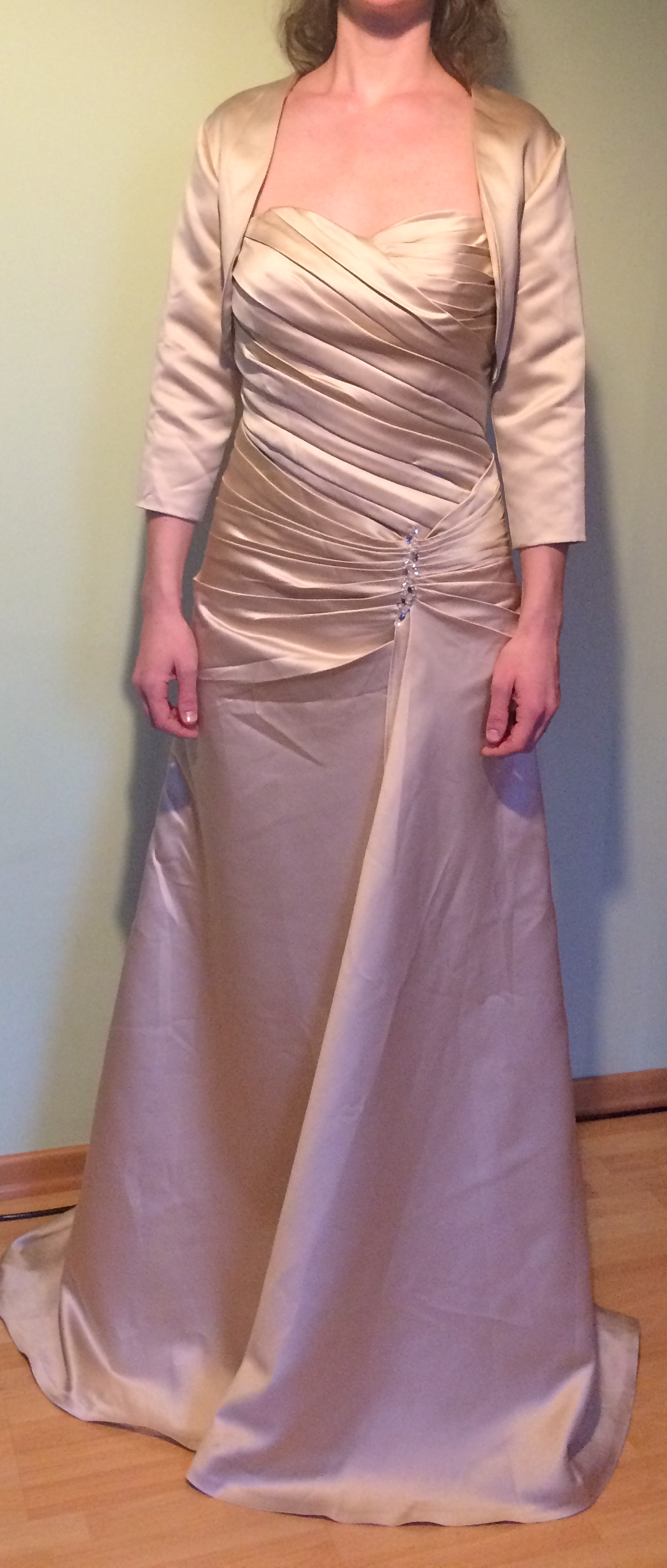 Ich verkaufe hier ein wunderschönes Brautkleid in champagner. Das Kleid wurde aus hochwertigem Satin gefertigt und bietet hohen Trage-Comfort. Zum Beispiel sind bis zum Taillenbereich luftige Querfalten vernäht, was dem Kleid das besondere Etwas verleiht. Ein Rückenreißverschluß und ein eingenähter BH sind natürlich bei dieser Qualität selbstverständlich. Eine schöne Blumenapplikation mit Stein schmückt den Taillenbereich, und ein passender Bolero komplettiert dieses elegante Kleid.