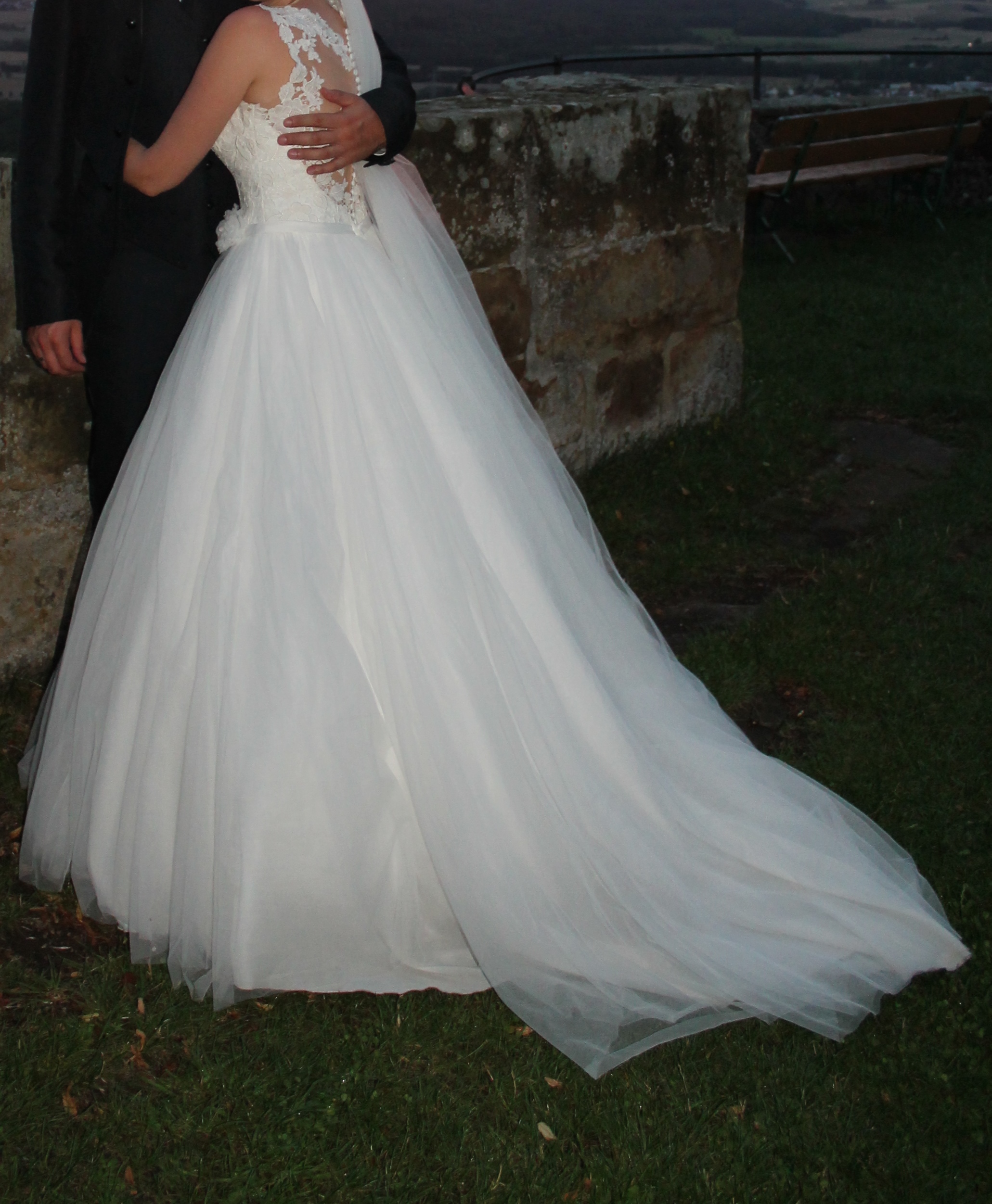 ich verkaufe schweren Herzens mein Traumbrautkleid von Eddy K mit Spitze und Tüll, Rücken Tattoooptik, Schleppe zum hochknöpfen, frisch gereinigt.