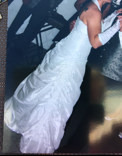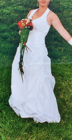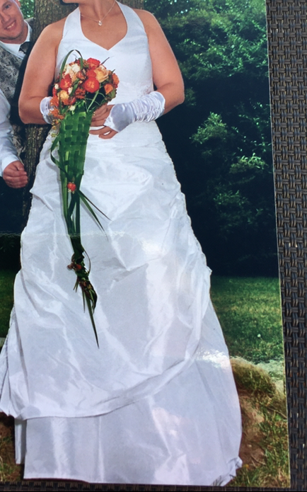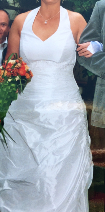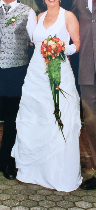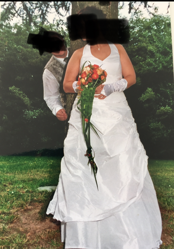 Das Brautkleid ist in Größe M (40) steht zwar 42 drin, fällt aber kleiner aus. Es ist zweiteilig.
