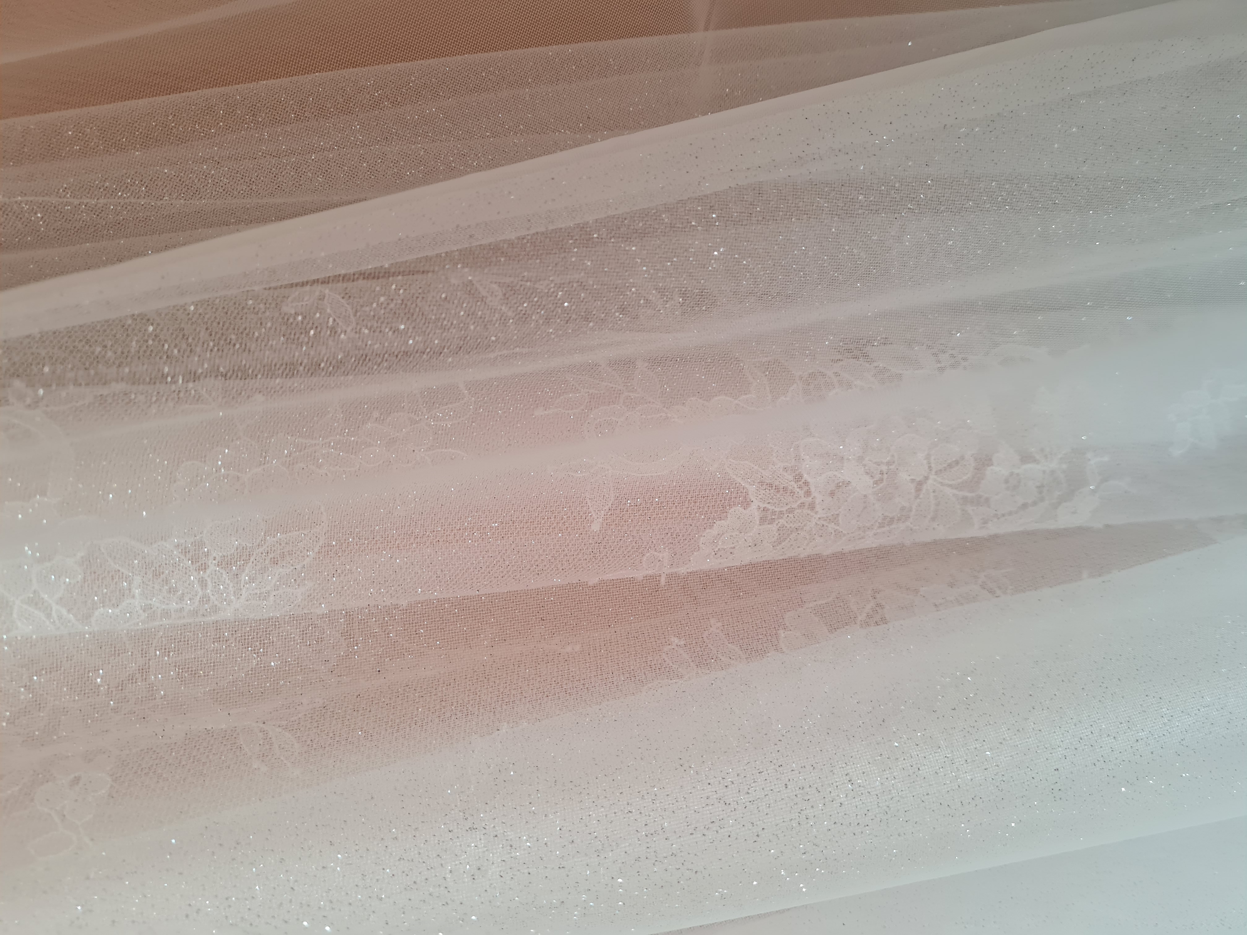 Es ist eine schmale A-Linie mit leichtem Glitzertüll und Ornamenten im Rock.