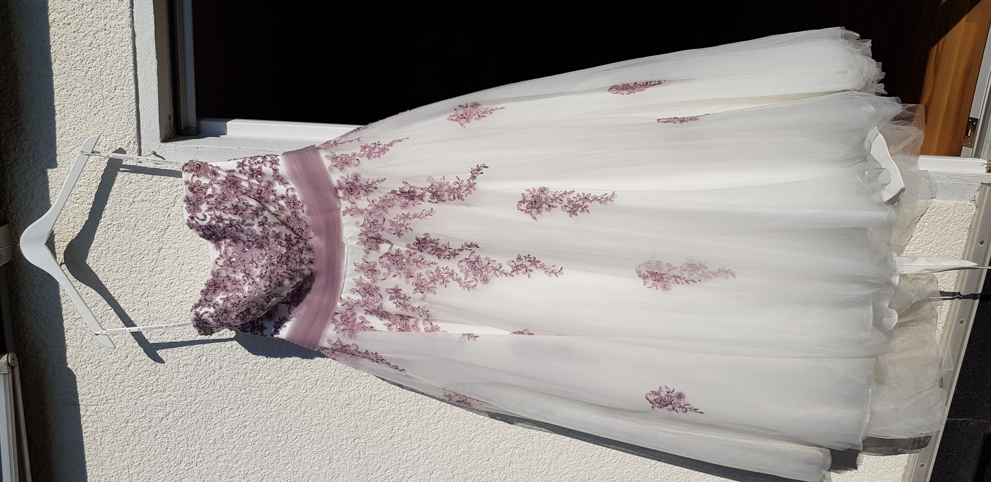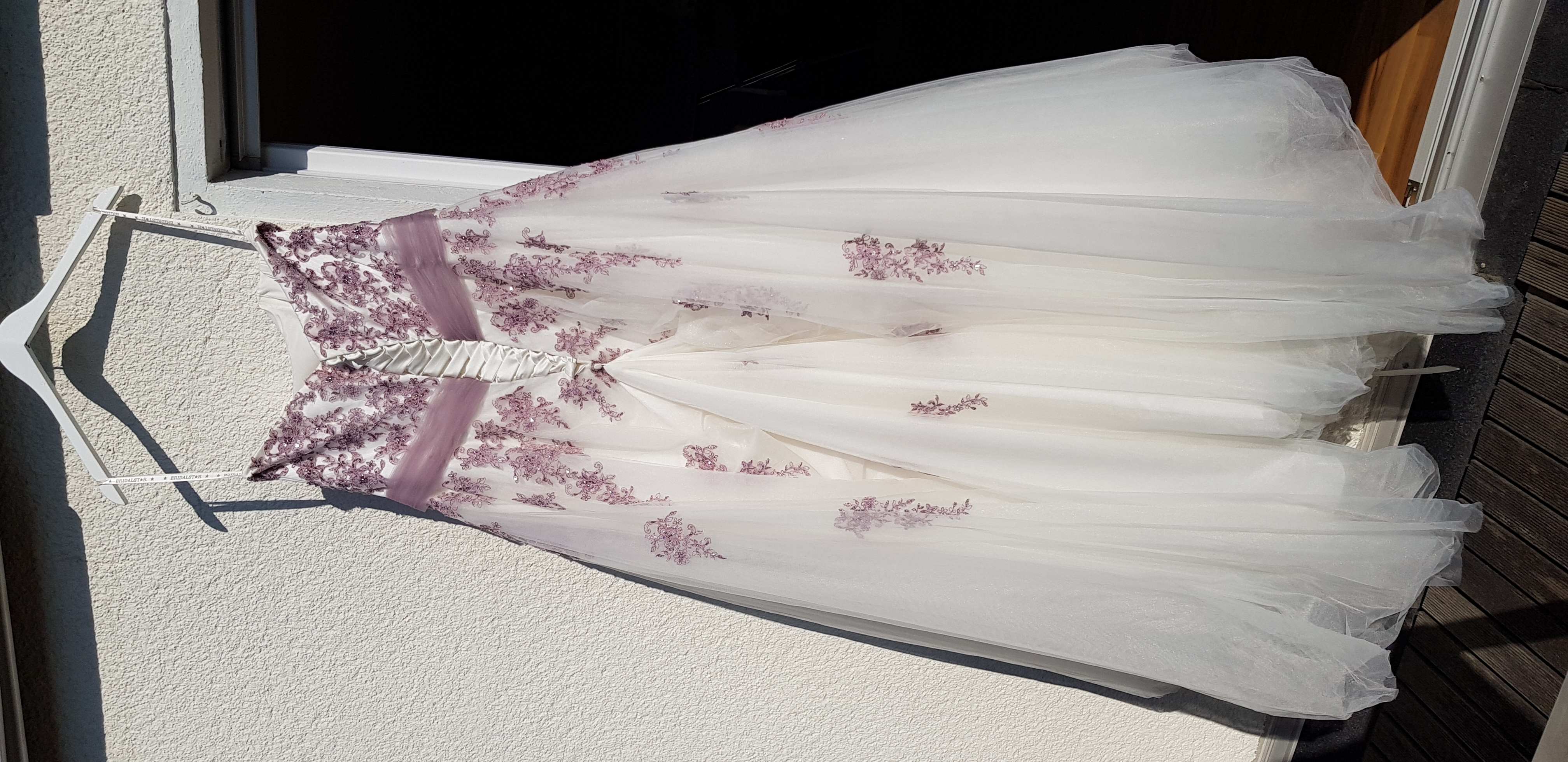 Ich wollte etwas außergewöhnliches, etwas Prinzessinhaftes, was ich all mit diesem Kleid gefunden habe. Es besitzt auch eine Hofschleppe, die mit einem Knopf über dem Steißbein hoch gesteckt werden kann.