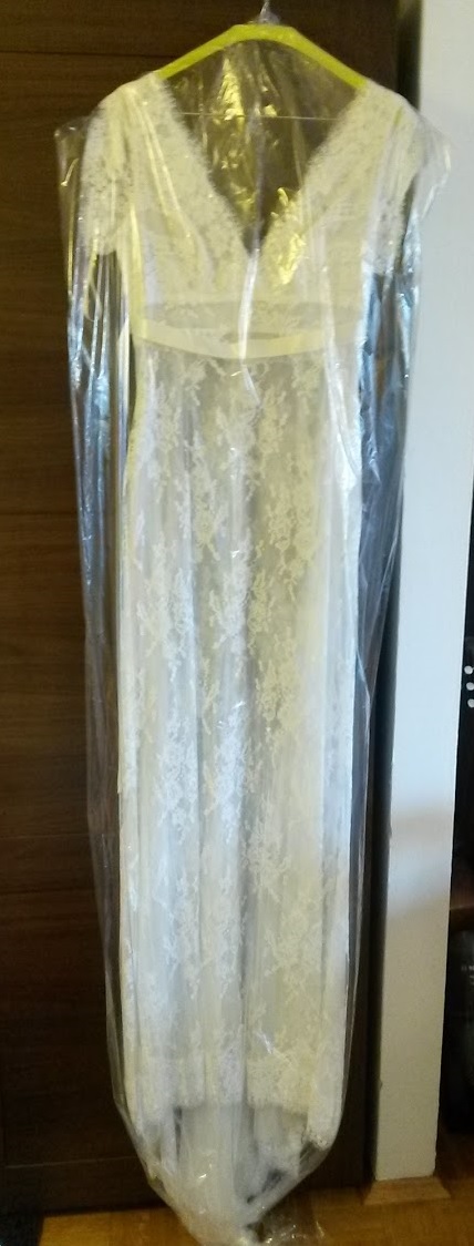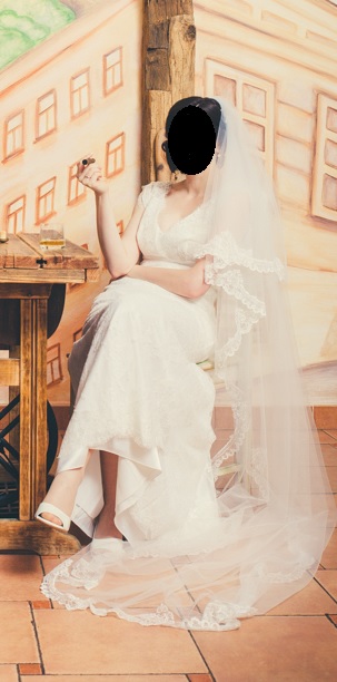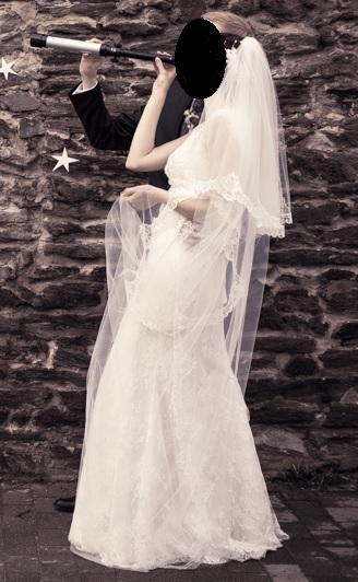 Das Kleid besteht aus einem Unterkleid, darüber ein Spitzenkleid mit kurzer Schleppe und ein Schleier. Bei Bedarf kann man die Schleppe einfach mit einem Knopf hochknöpfen.