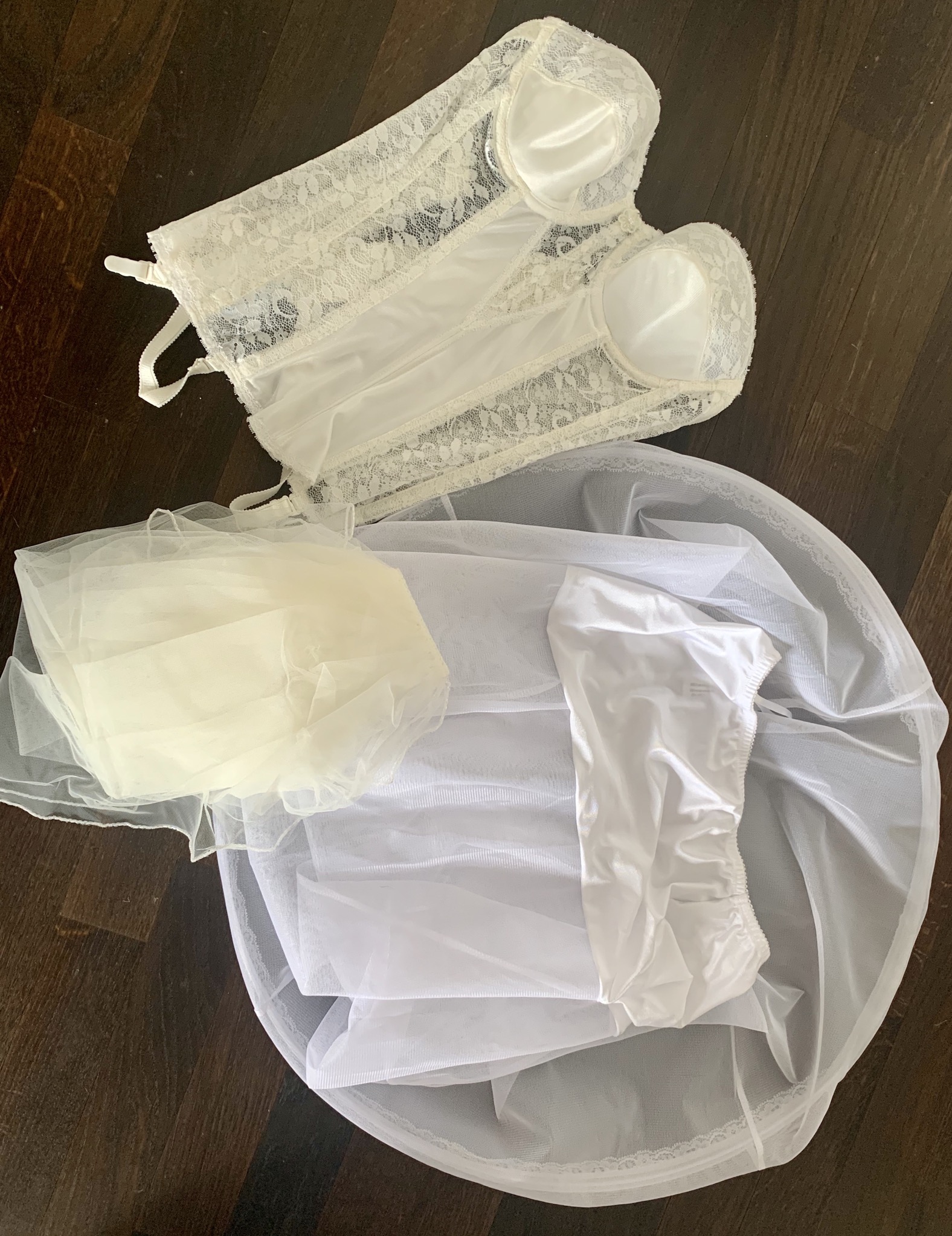 Passend zum Kleid lege ich Unterrock, Schleier und Corsage bei.
