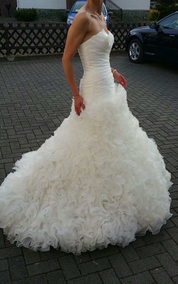 Das Kleid hat eine sehr lange Schleppe, die hochgesteckt werden kann! Am Rand des Unterstoffes dieser sind noch leichte Flecken vom Asphalt, man kann die Schleppe aber kürzen, so dass die Flecken weg wären, oder man lässt es, da sie wie gesagt nicht so sichtbar sind! Die das Kleid ist professionell gereinigt und sonst in einem sehr guten Zustand! Das Kleid ist komplett zum Schnüren und ein Organzajäckchen ist mit enthalten! Die Herzförmige Corsage ist am Ausschnitt asymmetrisch geschnitten. Ein mit Perlen- und Steinchen besetztes Ornament runden die Corsage ab. (Siehe zusätzliche Bilder)