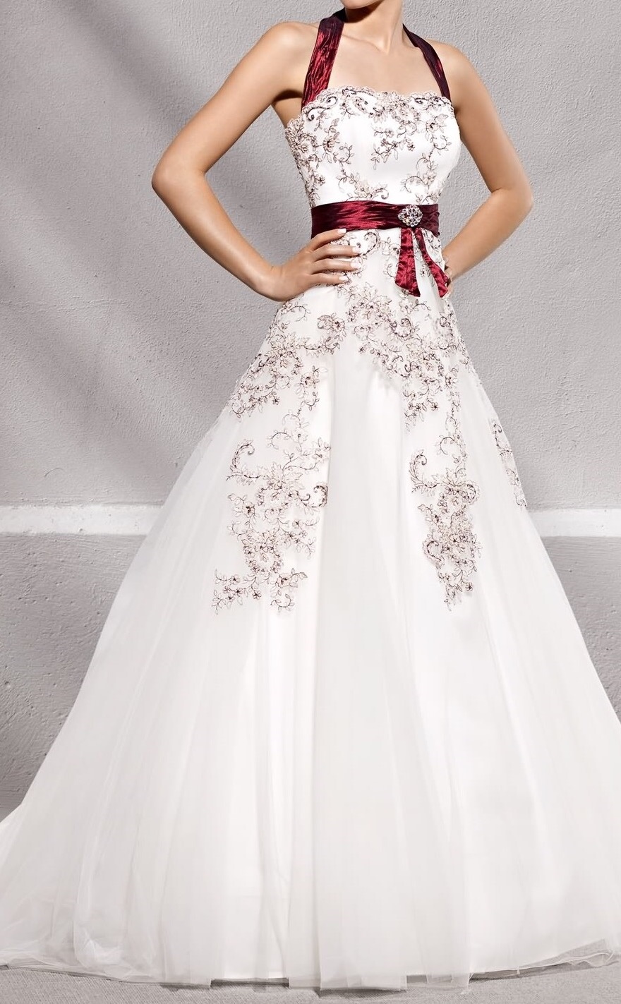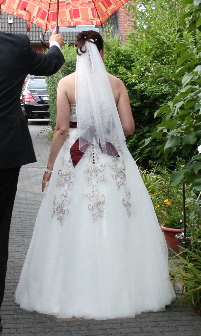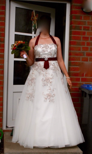 Verkaufe weißes Brautkleid mit bordeaux-farbenem Neckholder, Elizabeth Passion, A-Linie, nur einmal getragen, in TOP-Zustand.