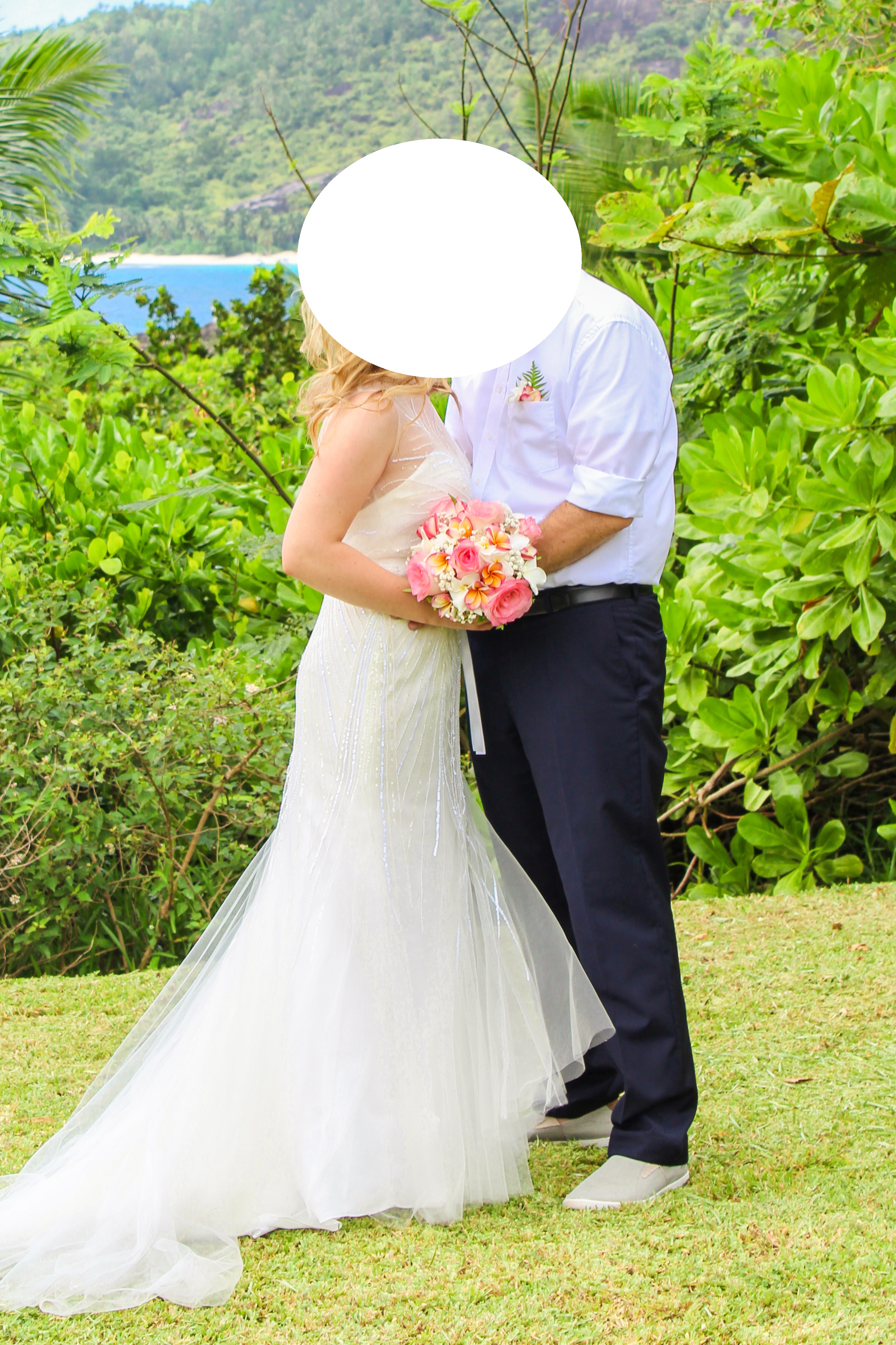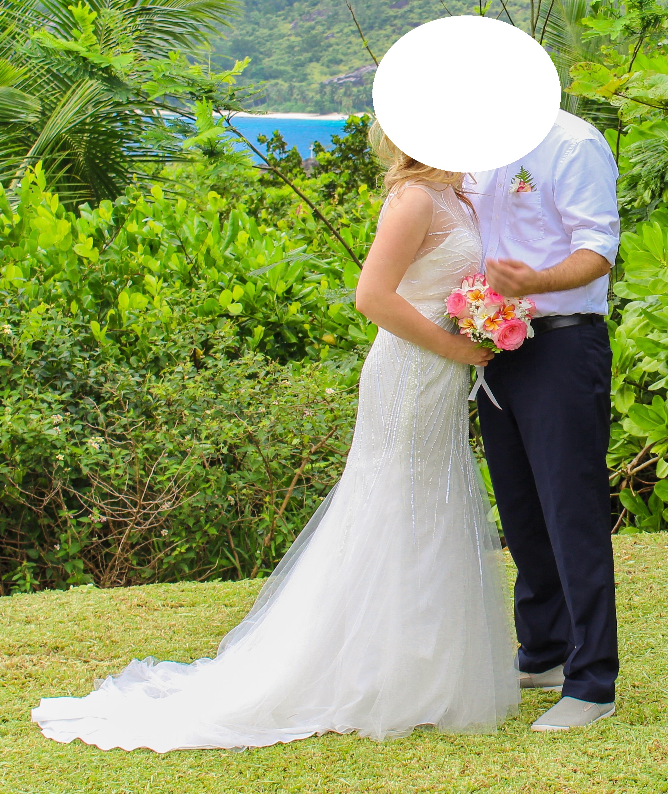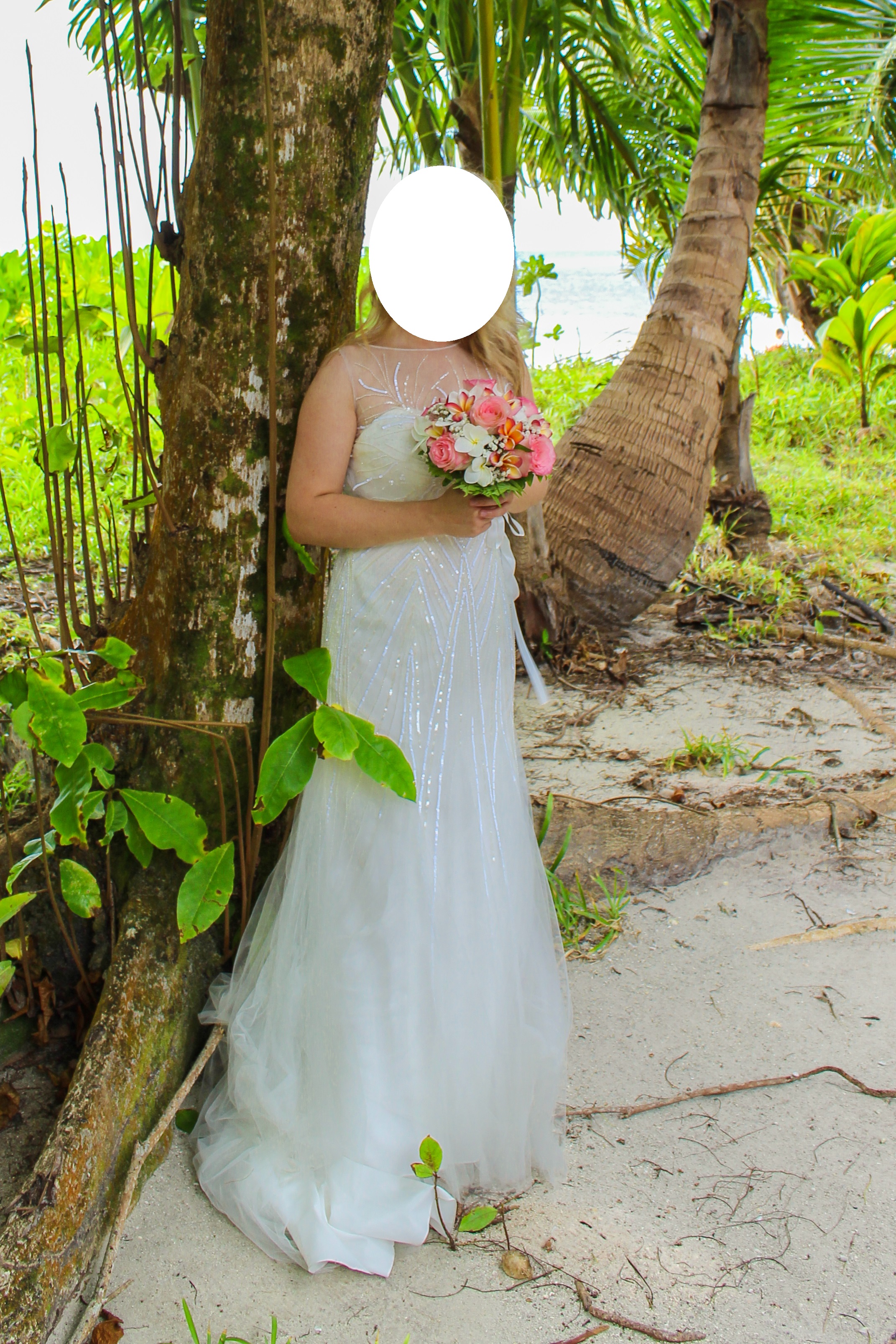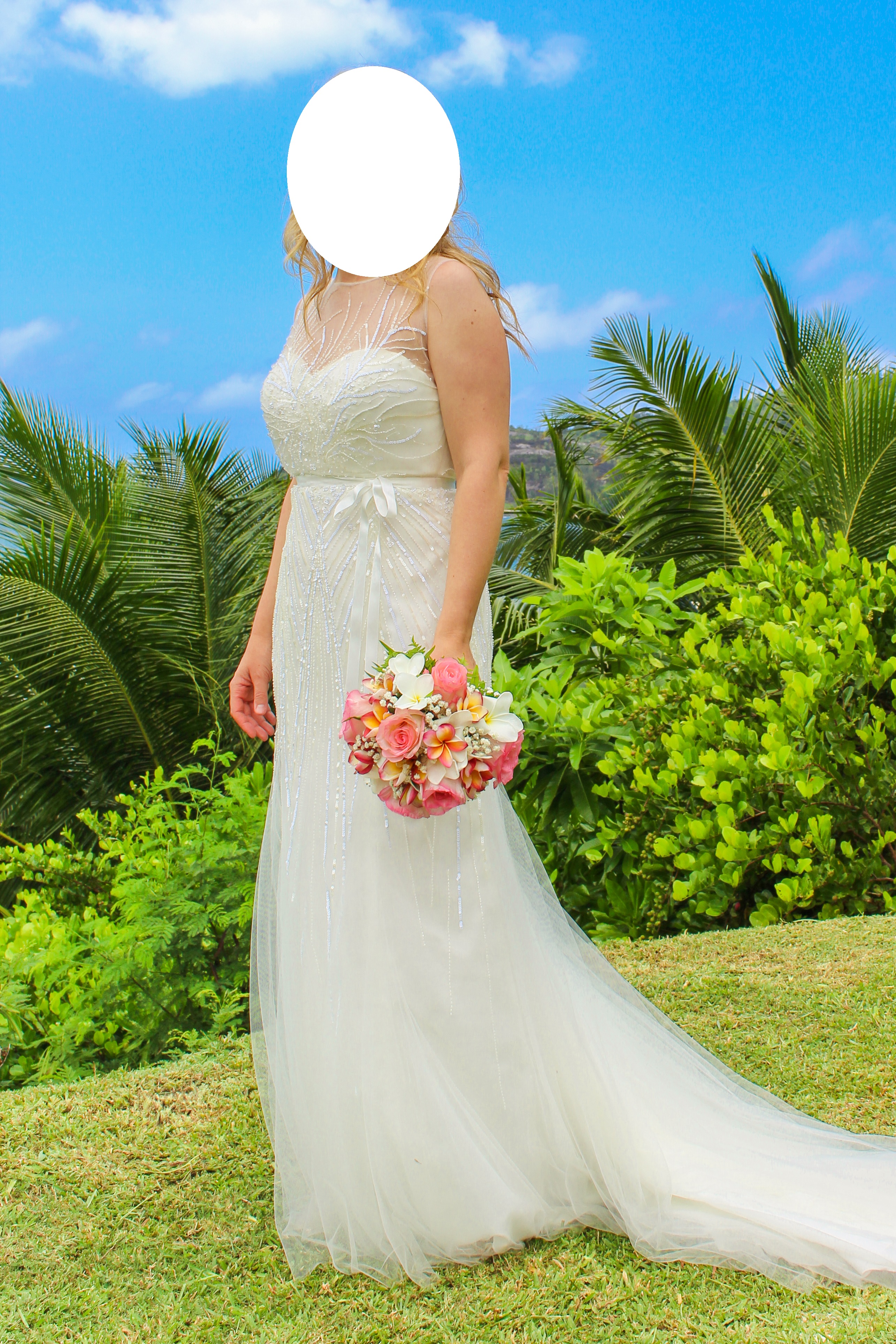 Dieses Kleid habe ich in der Größe 38 gekauft und es auf eine 36 professionell schneidern lassen. Meine Schneiderin teilte mir auf Nachfrage mit, dass man es auch wieder in eine 38 und 34 ändern kann. Weiterhin wurden Cups eingenäht, sodass man es bequem ohne BH tragen kann. Dieses Kleid von Ellis Bridal ist im Boho-Style gefertigt, welches man eigentlich etwas lässiger trägt. Ich wollte einen Mix aus Empire- u. Meerjungfrauen-Style und weil ich diese fließenden Pailletten, sowie den tollen Rückenausschnitt an dem Kleid sehr liebe, ließ ich die weiblichen Vorzüge etwas hervorheben. :)