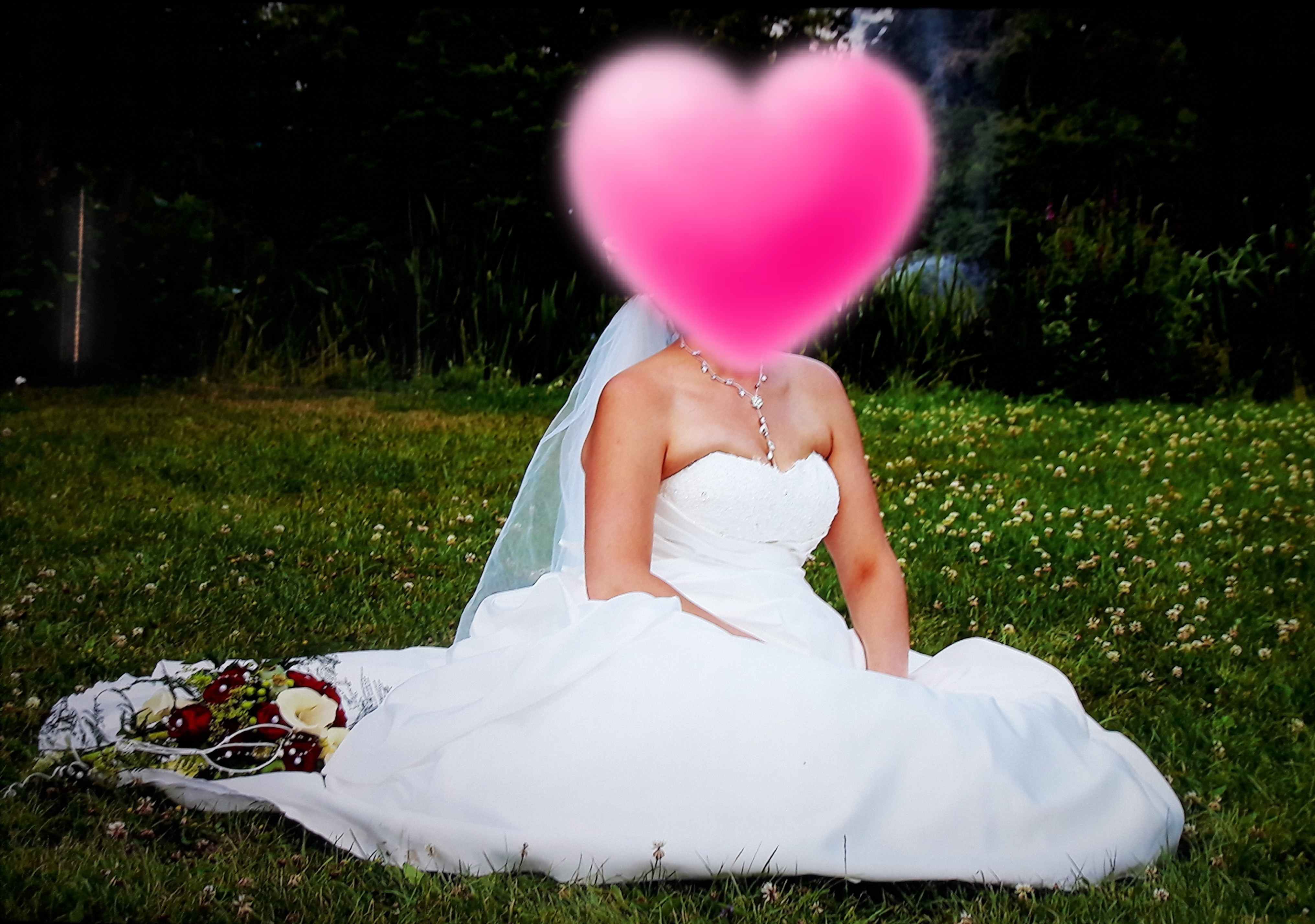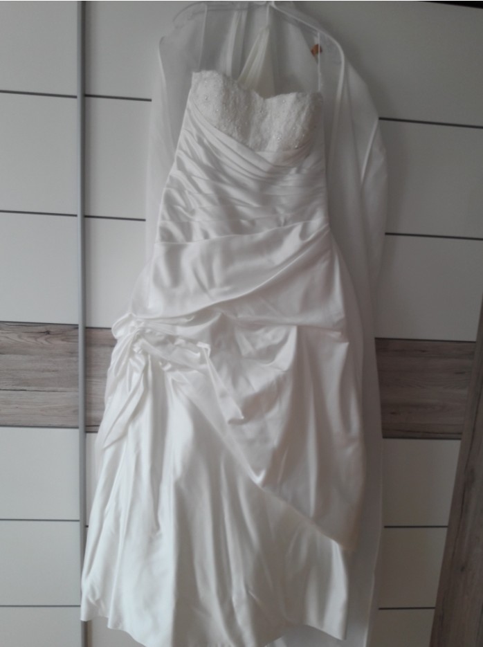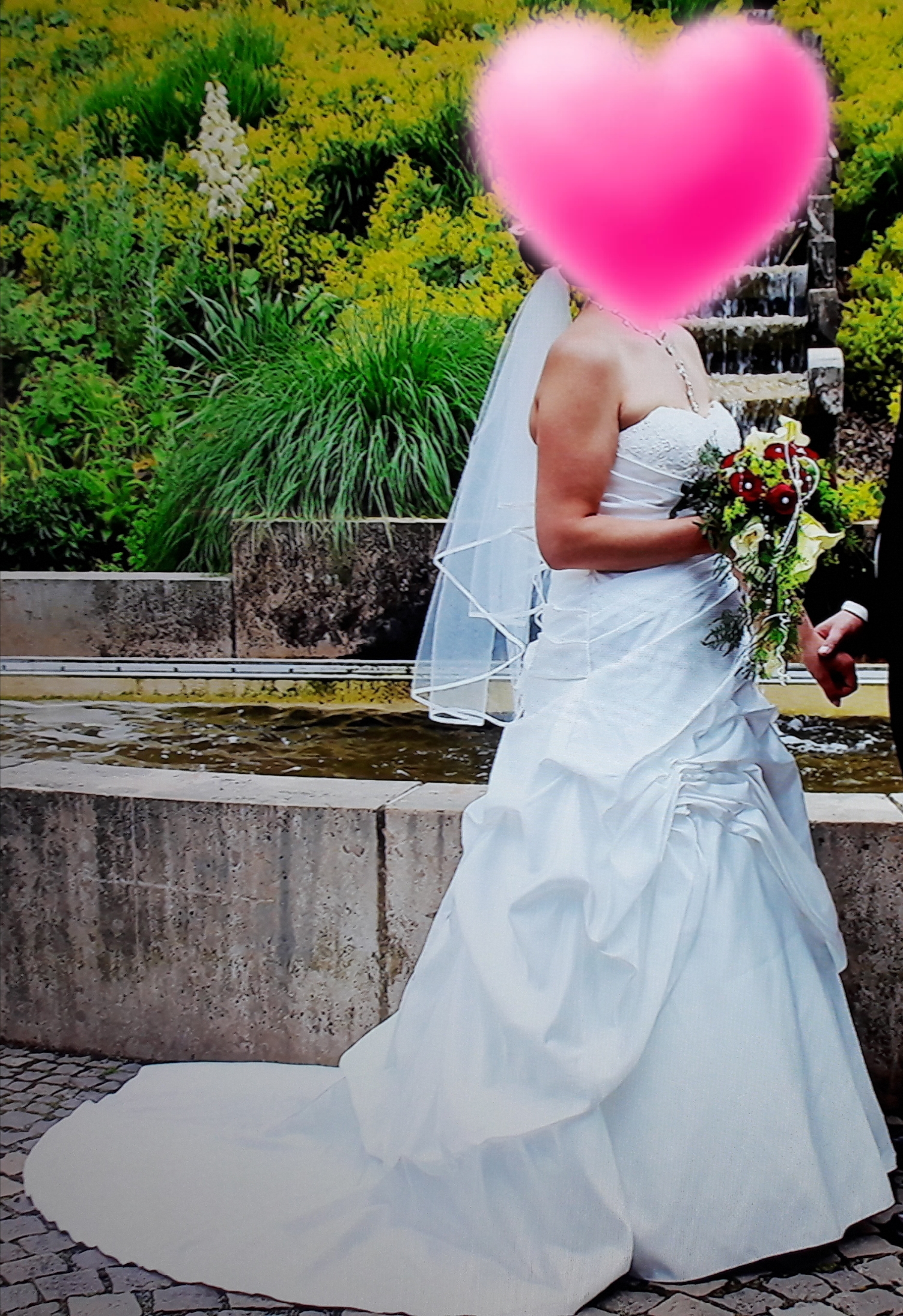 Ich verkaufe mein wunderschönes A-Linie Brautkleid von Emmerling, tragbar von Größe 42-44 da es hinten zum schnüren ist. Es hat einen Herzausschnitt, eine Schleppe die man zum Tanzen hoch machen Kann, es ist aus Satin in der Farbe Ivory, ist hinten zum schnüren und das Oberteil ist mit schöner Stickerei und Perlen. Es wurde professionell gereinigt und ist ohne Flecken oder Löcher! Dazu gibt es den passenden Schleiher, Bolero 3/4 Arm und Reifrock. Neupreis für alles zusammen war 900 Euro! Versand nach Übernahme der Kosten möglich