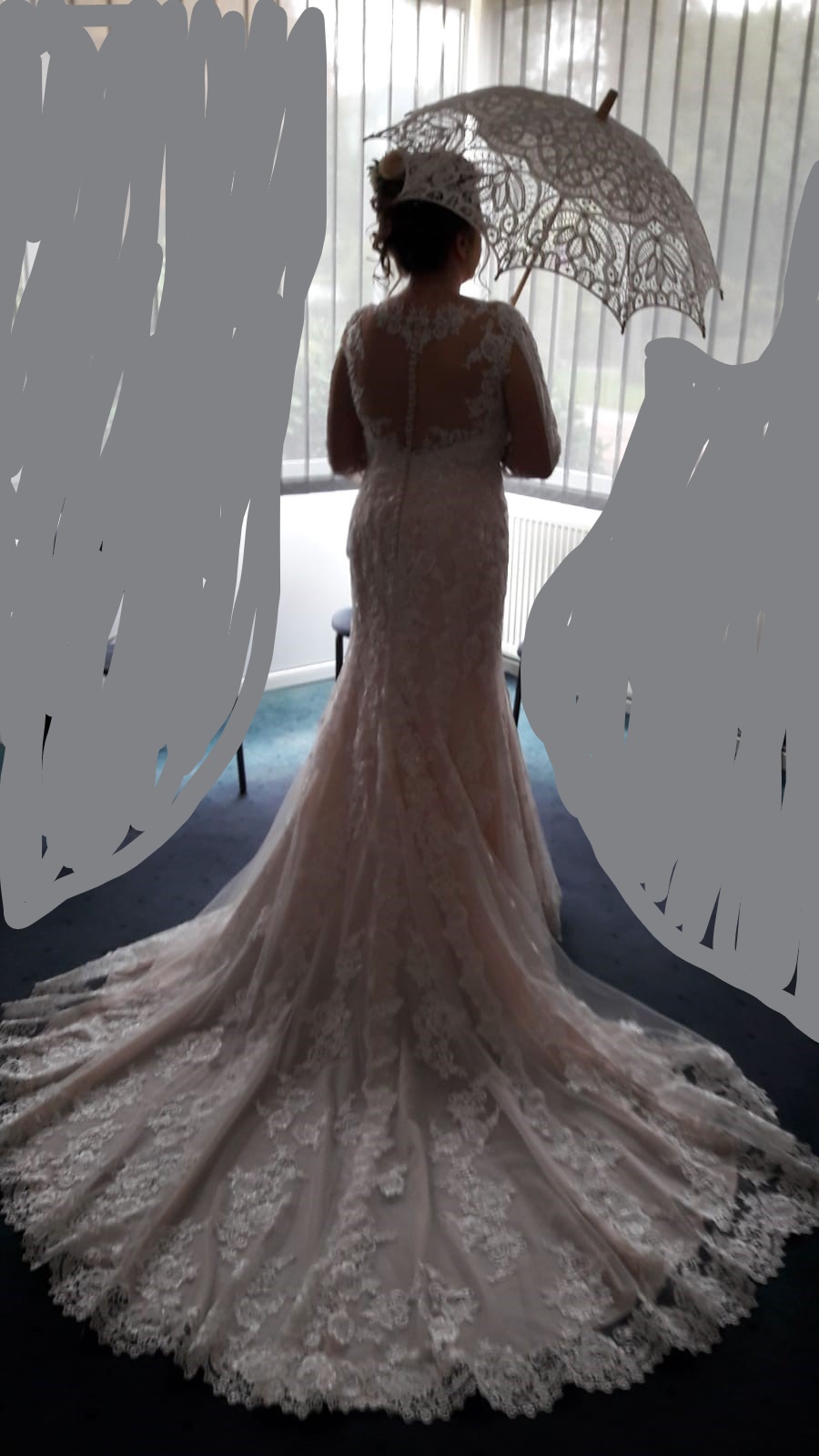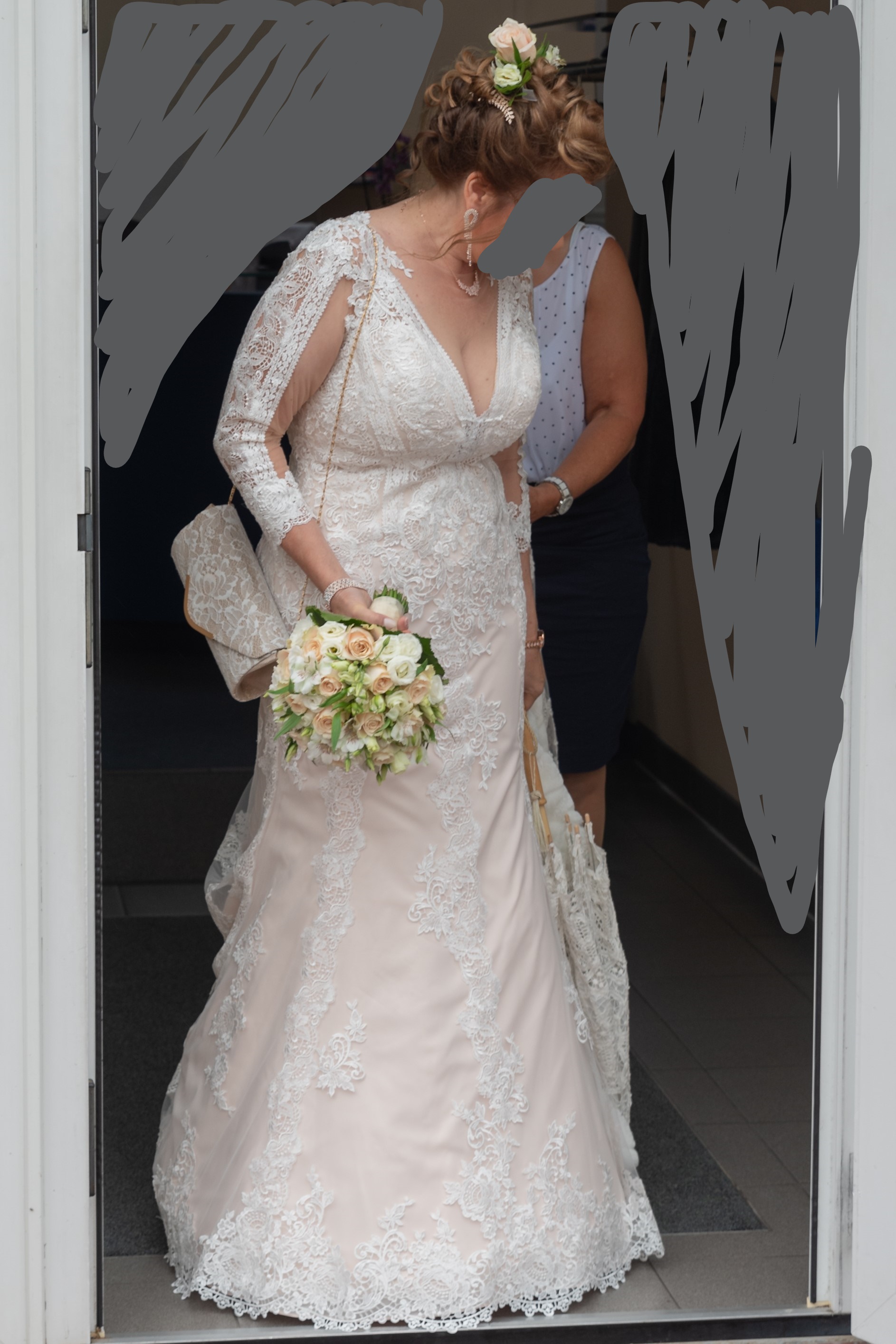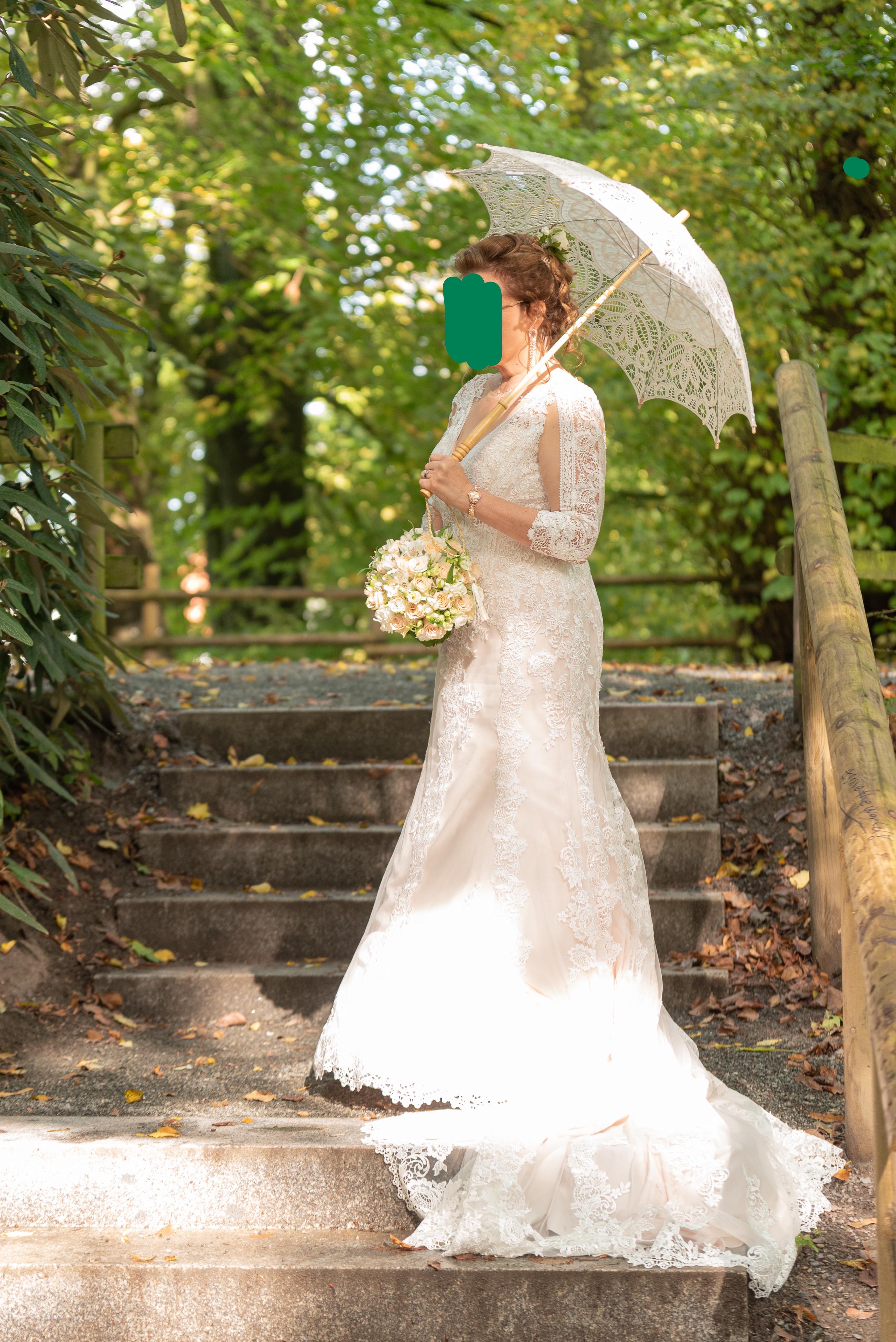 dieses Brautkleid in den Farben nude/champagner (ivory) ist im Mermaidstil. Das Kleid selbst hat Ende 2019 inkl. Anpassung im Brautmodengeschäft 2100,00€ gekostet. Zusätzlich enthalten ist ein schmaler unten ausgestellter Reifrock, damit ein Laufen und Tanzen leichter wird, weil so mehr Beinfreiheit gegeben ist. Das Kleid wurde direkt nach der Hochzeit professionell für 100,00€ gereinigt. Auf Wunsch kann der Schirm (ivory) und ein Fellimitatbolero (champagner ivory) kostenlos mit erworben werden. Bei Interesse übersende ich gern mehr Fotos
