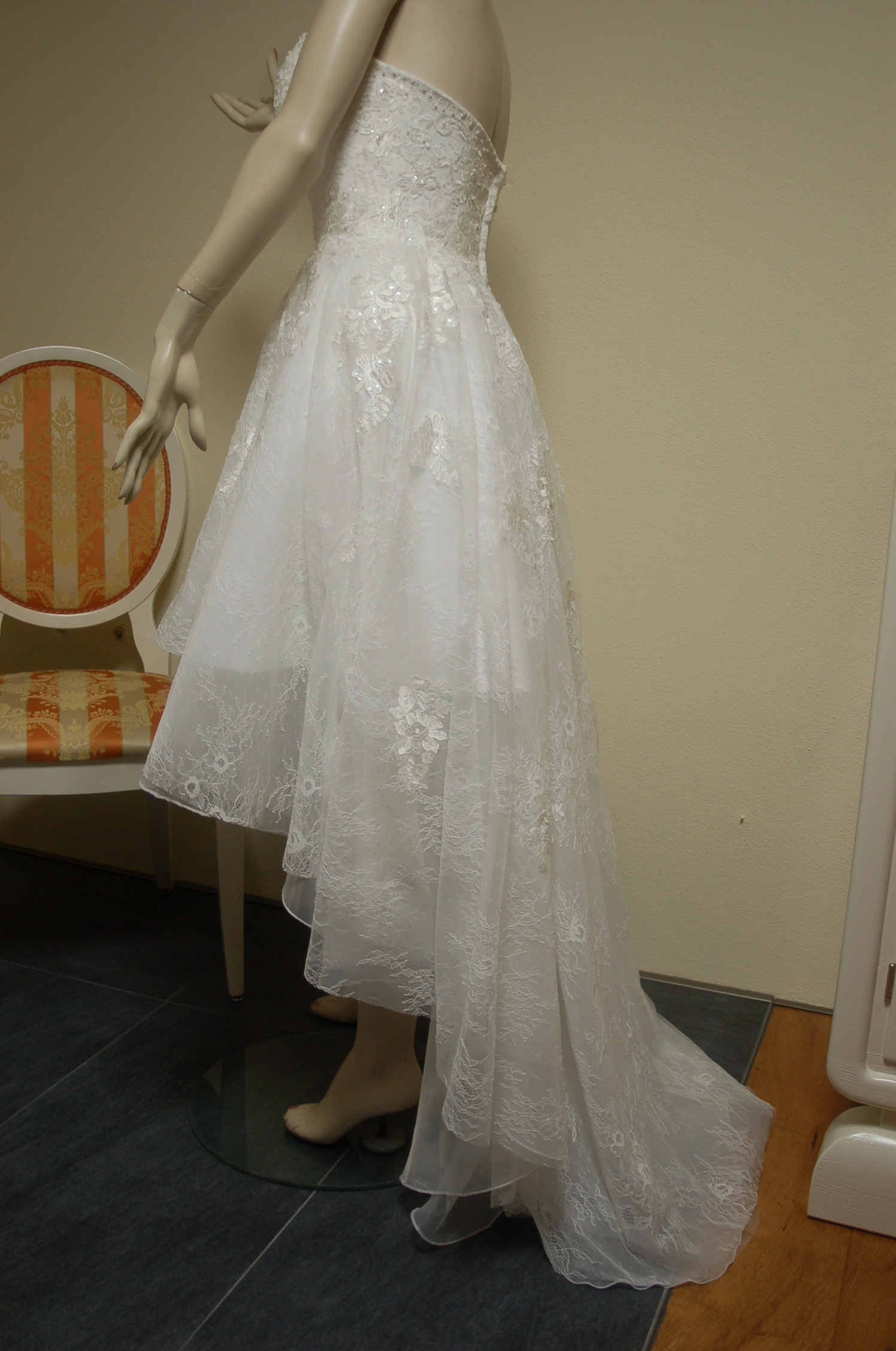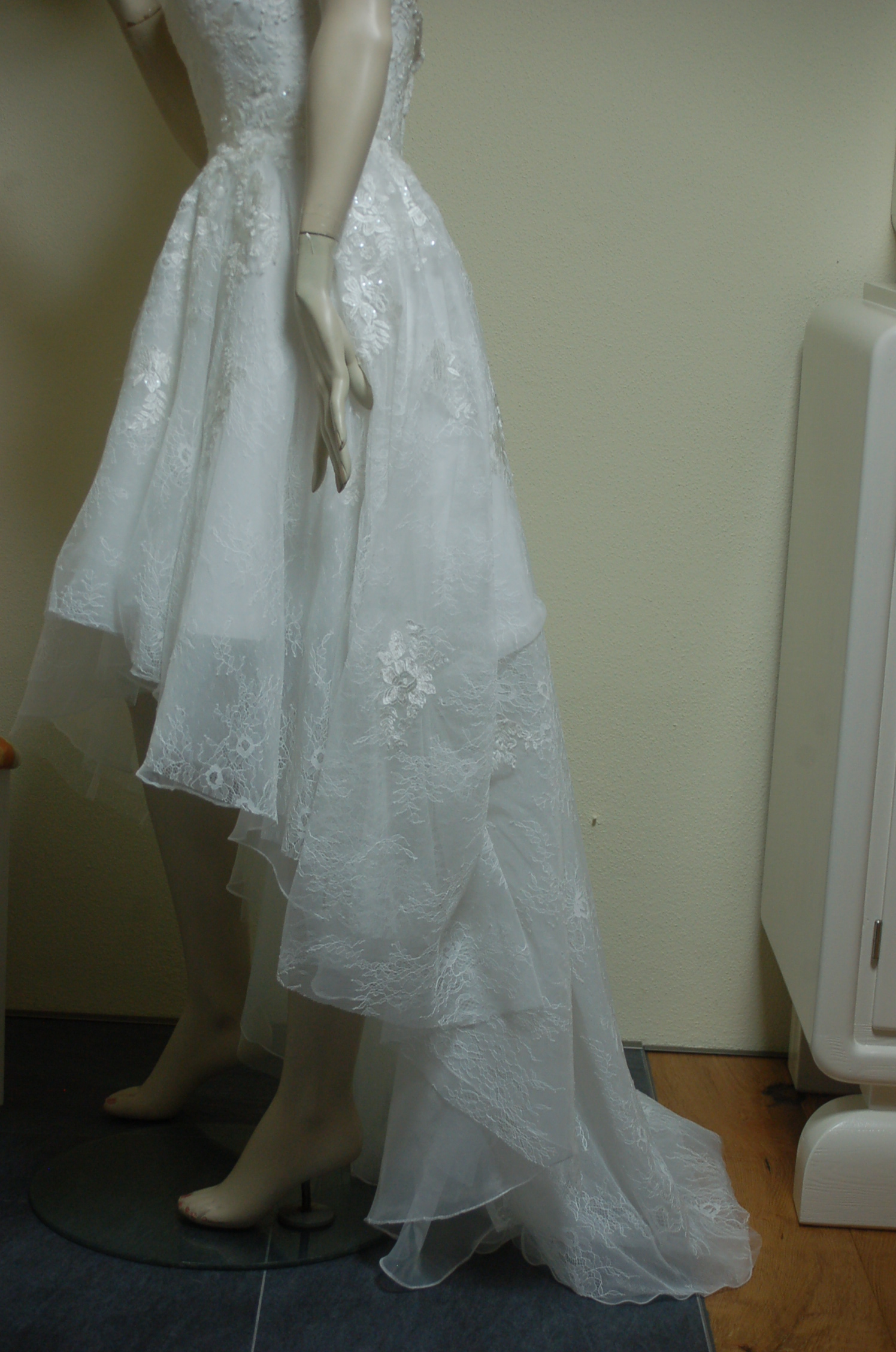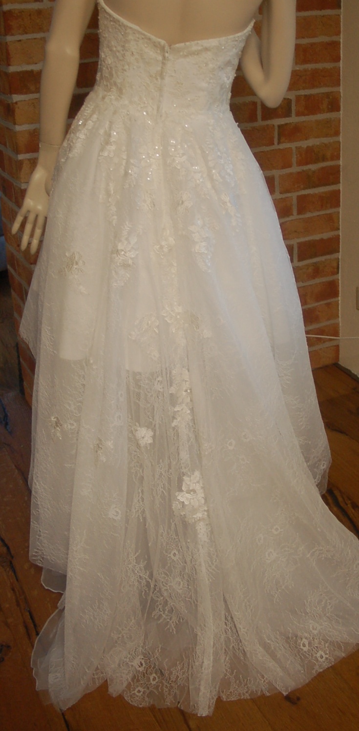Vorn kurz, hinten lang – das sieht man selten und ist deswegen ein Blickfang. Der leichte Herzausschnitt betont das Dekolleté. Und auch ein kleiner Busen sieht recht voluminös aus. Das Kleid betont den Rücken, macht diesen gerade und elegant. Sollte die Braut ein kleines Bäuchlein haben, kaschiert das Kleid den kleinen Makel. ( Auch das war ein entscheidender Grund, warum ich mich für dieses Kleid entschieden habe. ) Der handgefertigte perlenbesetzte Stoff ist einmalig in der Verarbeitung. Im Originalzustand, ohne Änderung, wurde dieses Kleid bei einem Brautausstatter gekauft. Wegen Schwangerschaft kann dieses Brautkleid nicht getragen werden, dazu müsste es zu sehr verändert werden.