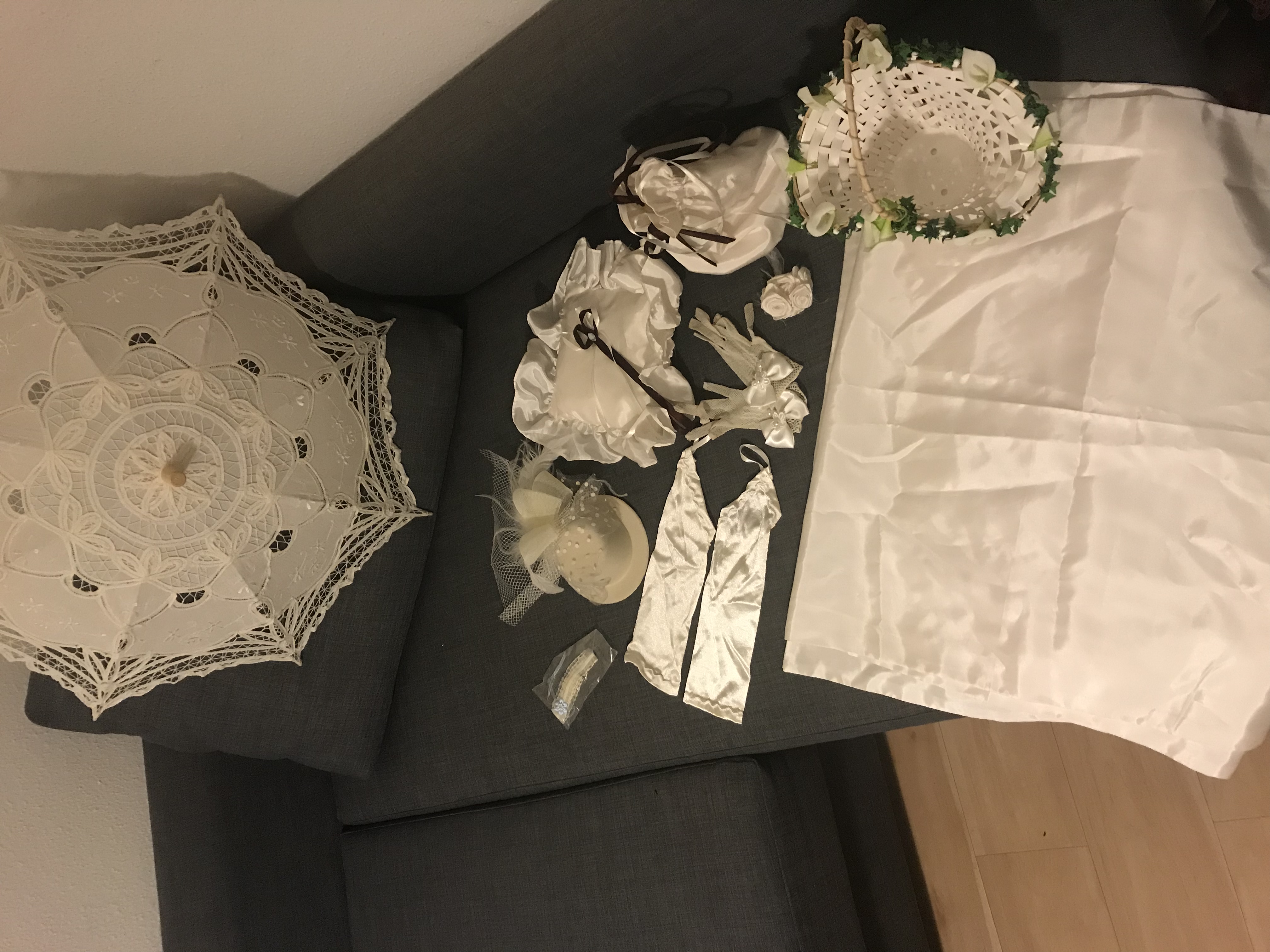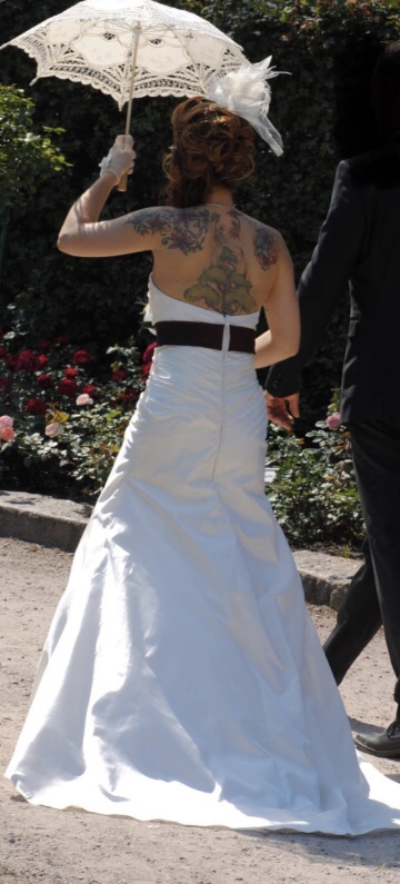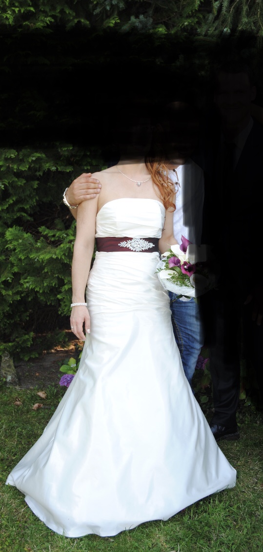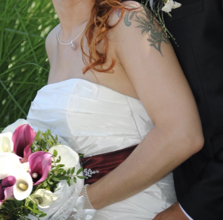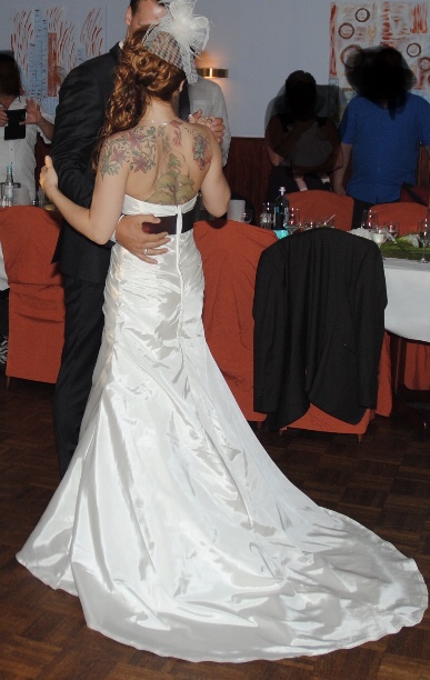 Hallo,extra geschneidertes Hochzeitskleid.Grösse zwischen 34/36.Cup 75B.Brustpolster.Zusätzlich,wie auf den Bildern zu sehen,gibt es Schulterschaal,Netzhandschuhe,Unterarmstulpen,Haarrosenstecker,Ringkissen,Brauttasche,Hut,Streukörpchen,Sonnenschirm,Strumpband.Reifrock hatte ich leider nur zur Leihgabe,muss also selber noch besorgt werden.Bei Interesse geht das Kleid zur Reinigung ,da ich es nach der Hochzeit noch nicht dort hatte.Bei Bedarf:Unbenutze Brautschuhe dazu.Es ist mein Traumkleid. Nur zu schade um es jetzt Jahre im Schrank zu lassen.Ich hoffe das es auch jemandes Traumkleid wird.Bei Fragen gerne melden.Privatkauf.Keine Garantie und Rücknahme.