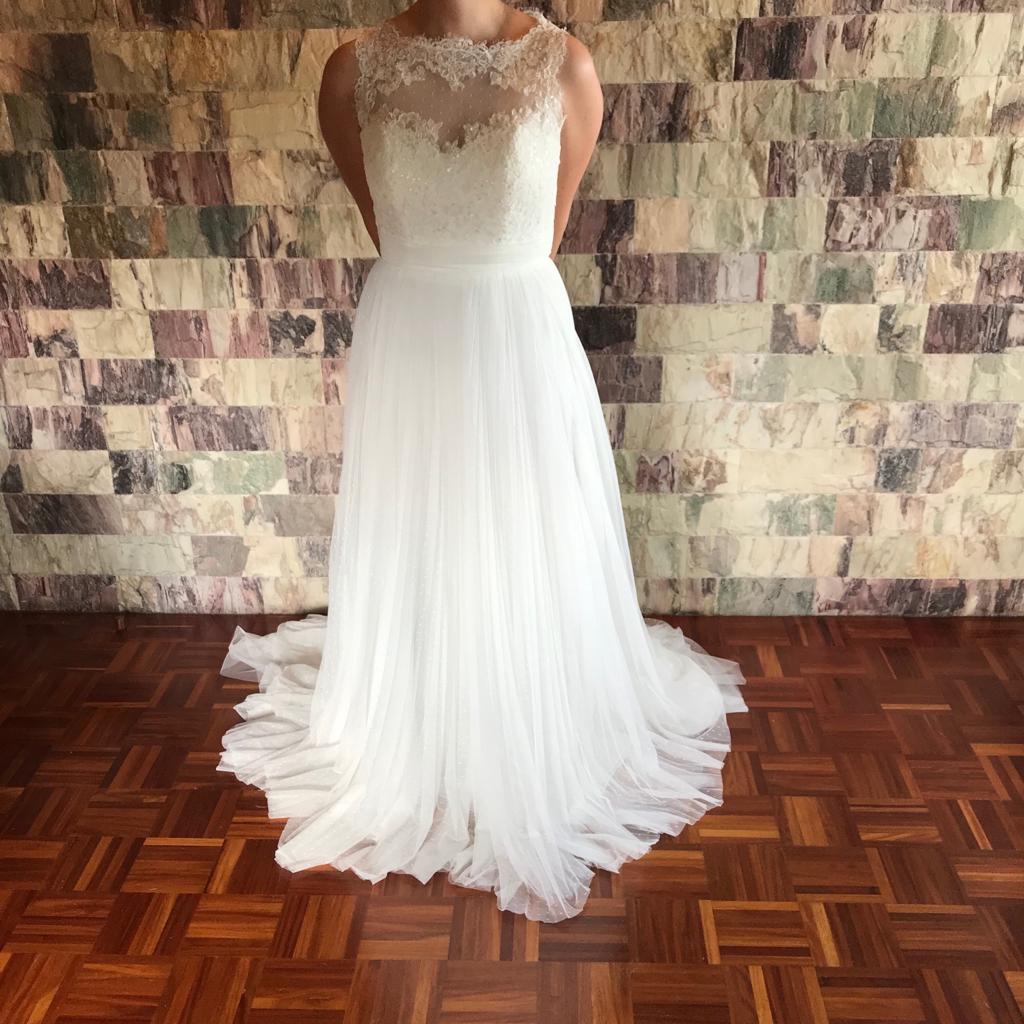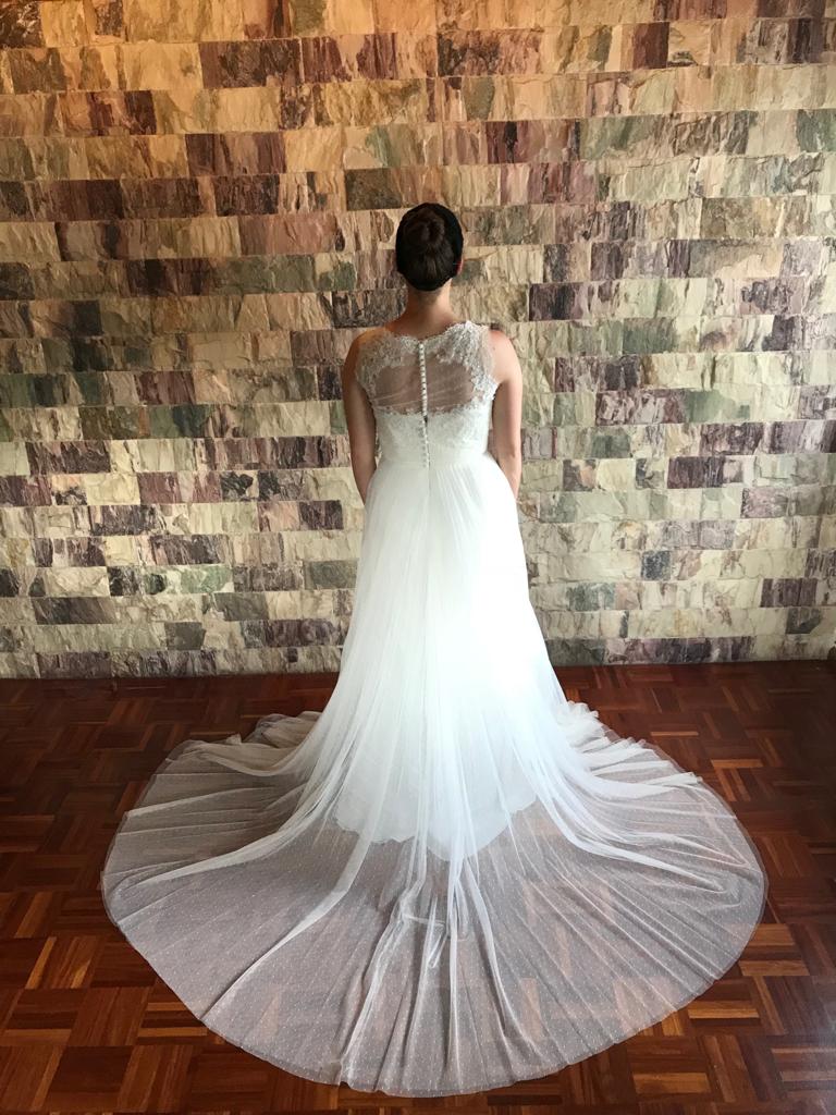 Schön luftig mit süßen Punkten auf dem Tüllstoff. Schleppe ist 3 Meter lang.
