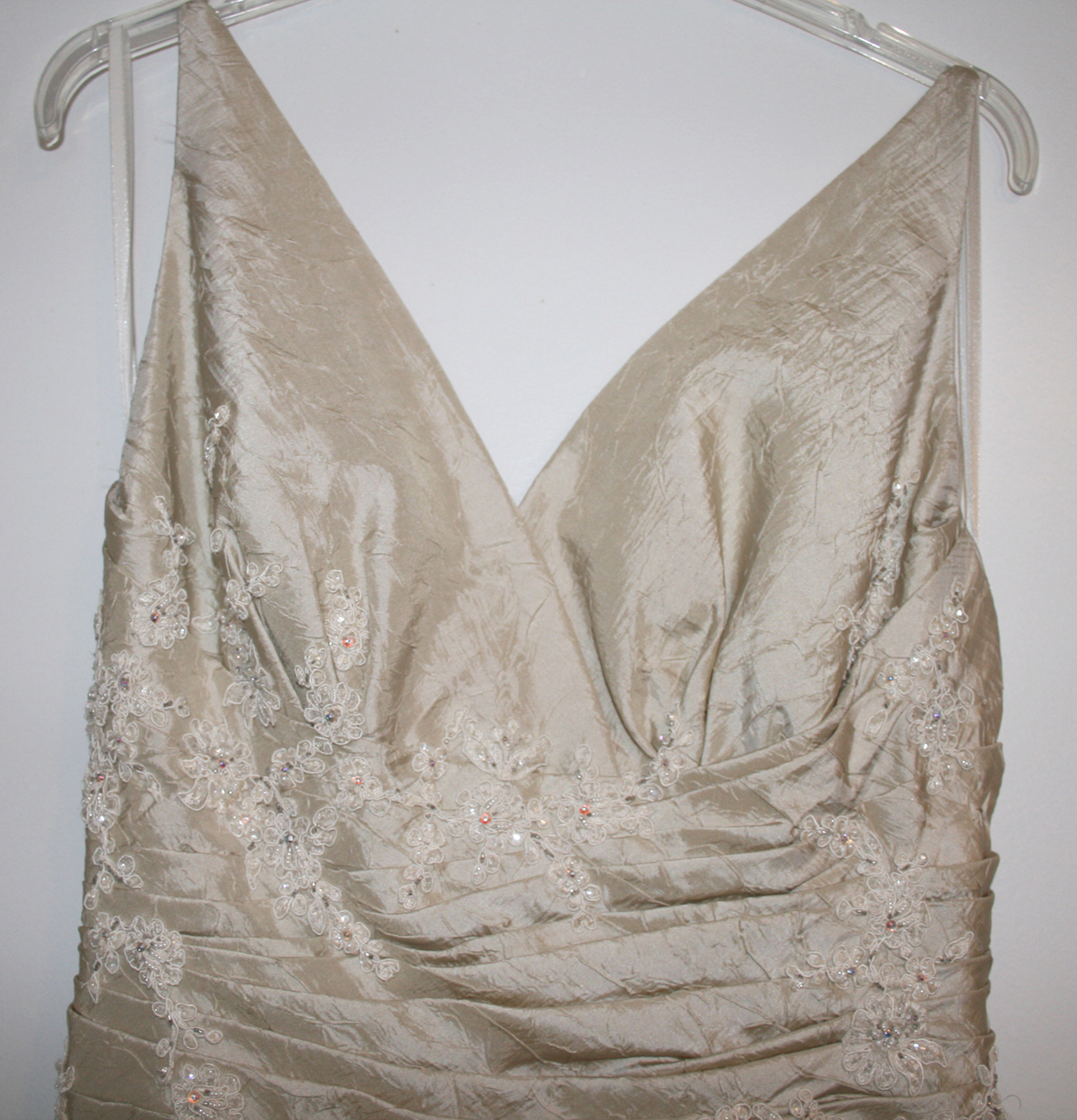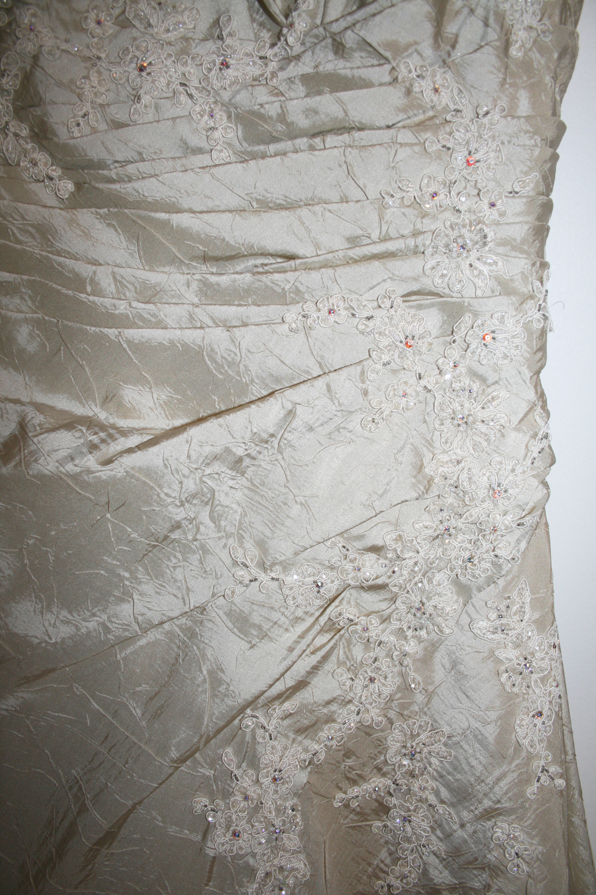 Die außergewöhnliche Farbe Ecru (ein warmer Champagner/Créme-Ton) schmeichelt dem Teint, die schöne Crash-Optik vertreibt die Sorge nach Falten oder Knittern im Kleid und die Trägerin kann den Tag unbeschwert genießen.