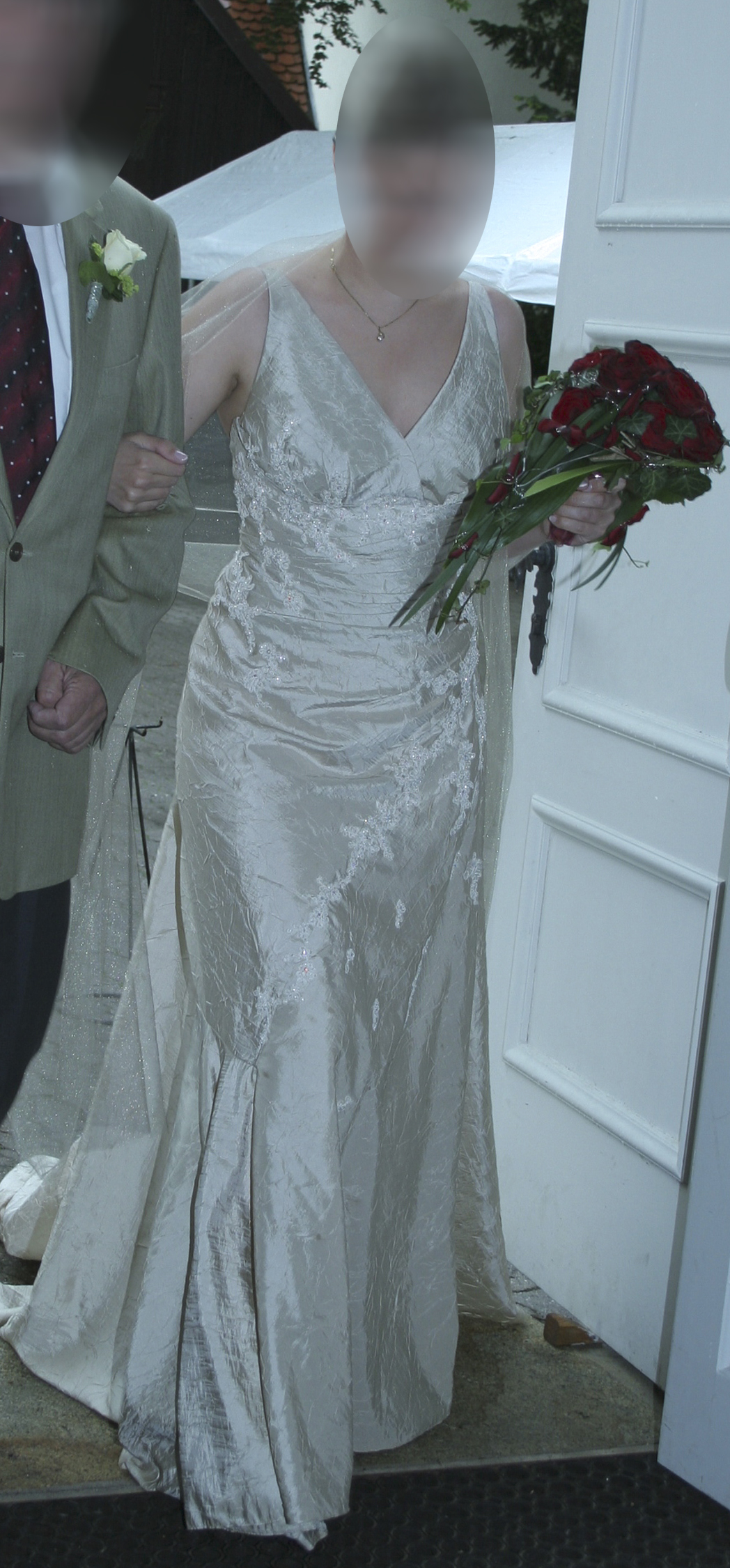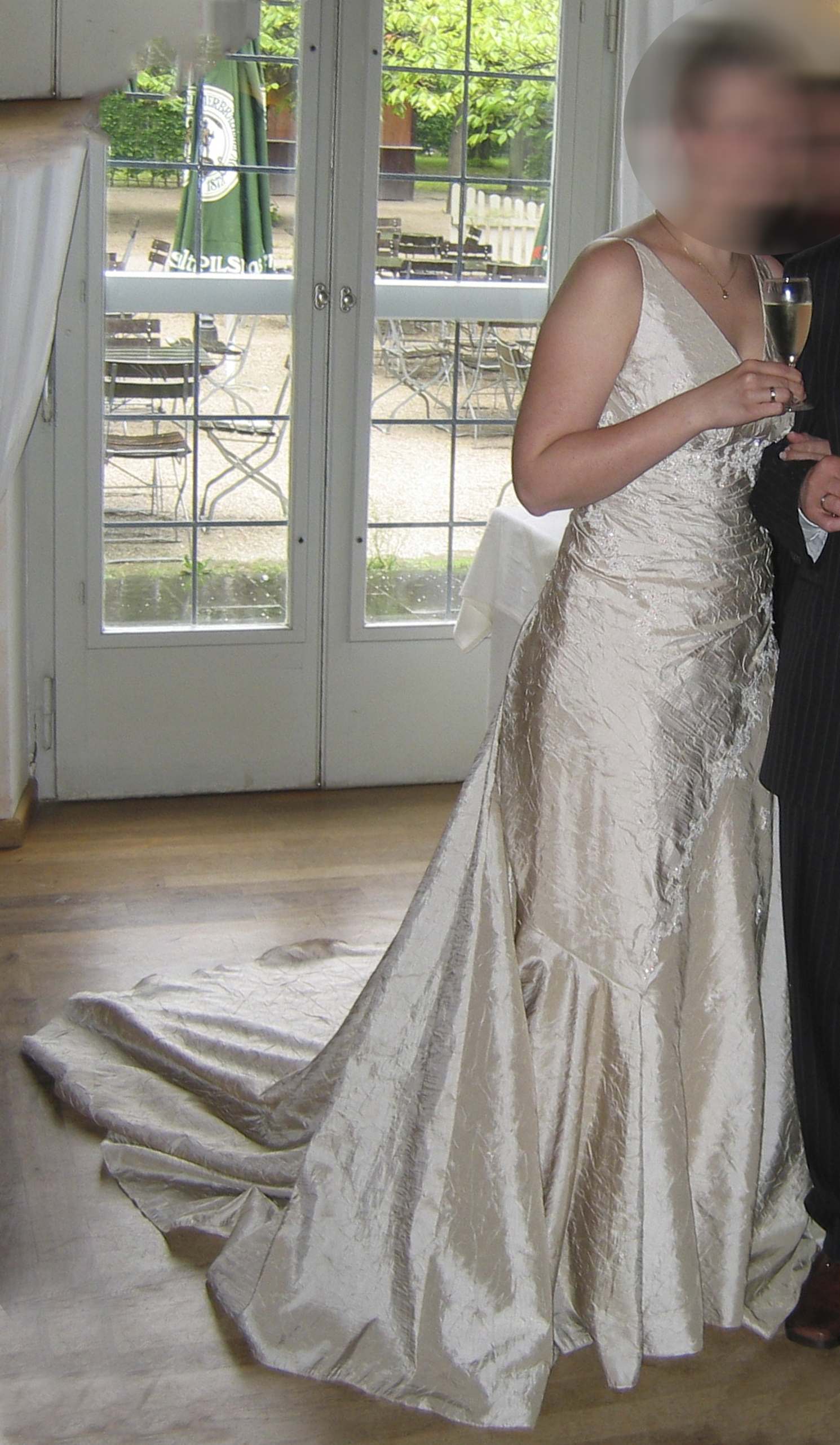 Das Kleid wurde in der Größe 38 gekauft und minimal enger genäht. In das Oberteil passt gut ein C-Körbchen. Die Länge ist für 1,70 m und Schuhen mit 6 cm Absatz optimal, kann aber natürlich noch entsprechend an die neue Trägerin angepasst werden.
