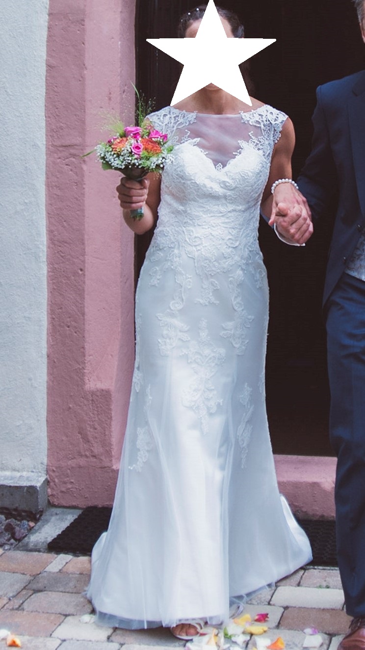 Hallo liebe zukünftigen Bräute, ich verkaufe mein wunderschönes Brautkleid von Lisa Donetti in Größe 38. Modell Nr. 70534 aus der Kollektion 2017! Es hat die Farbe ivory. Es ist vom Designer Vittorio Donetti und ein Traum aus Spitze und Tüll, mit einem wunderschönen Herzausschnitt. Es hat eine kleine Schleppe, die sich ganz einfach an einem kleinen Knopf nach oben hängen lässt, sodass sie beim Tanzen oder Laufen nicht stört. Das Kleid hat insgesamt vier Lagen, zwei aus festem Tüll, quasi als Ersatz für einen Reifrock, der dünne, geschmeidige Unterrock, damit der Tüll nicht an den Beinen kratz und das eigentliche, traumhafte Kleid mit der Spitze. Ich bin 1,68 groß, wiege ca. 59 kg und trage normalerweise 38. Meine Schuhe hatten einen Absatz von 5 cm – das Kleid musste dafür etwas gekürzt werden.