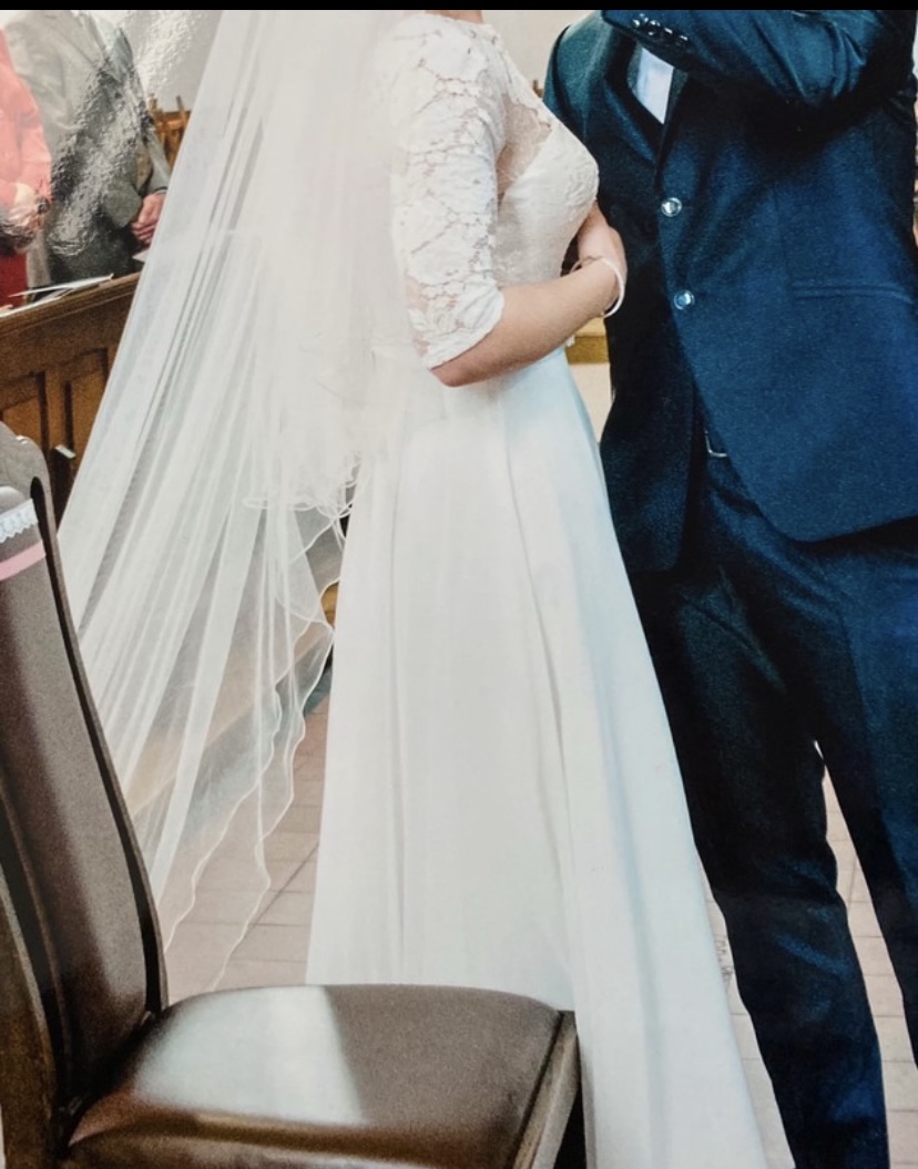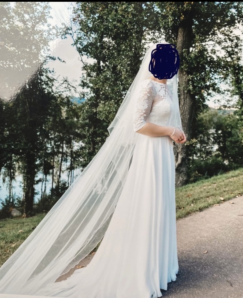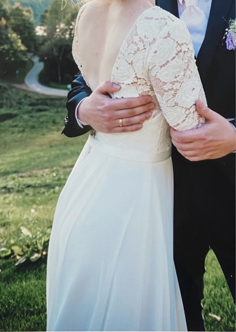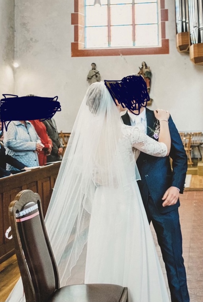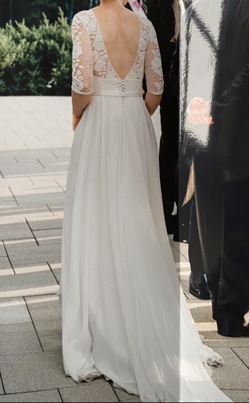 Ich biete mein wunderschöne, elegantes, schlichtes Kleid an. Oben geschlossen mit schöner Spitze. Das Kleid wurde 2017 gekauft und getragen. Es ist vollständig gereinigt und in einem sehr guten Zustand. Das Kleid wird mit Schleier abgegeben, der ebenfalls schlicht gehalten ist und eine lange Schleppe hat. Es ist sehr bequem und der Rock fällt wunderbar leicht ab. Ich habe ein BH von Calvin klein einnähen lassen, diesen kann man ohne Probleme entnehmen. Ich bin 1,67m groß und hatte hohe Schuhe von 7cm an . Originalpreis: 1349€; Rechnung ist selbstverständlich vorhanden.