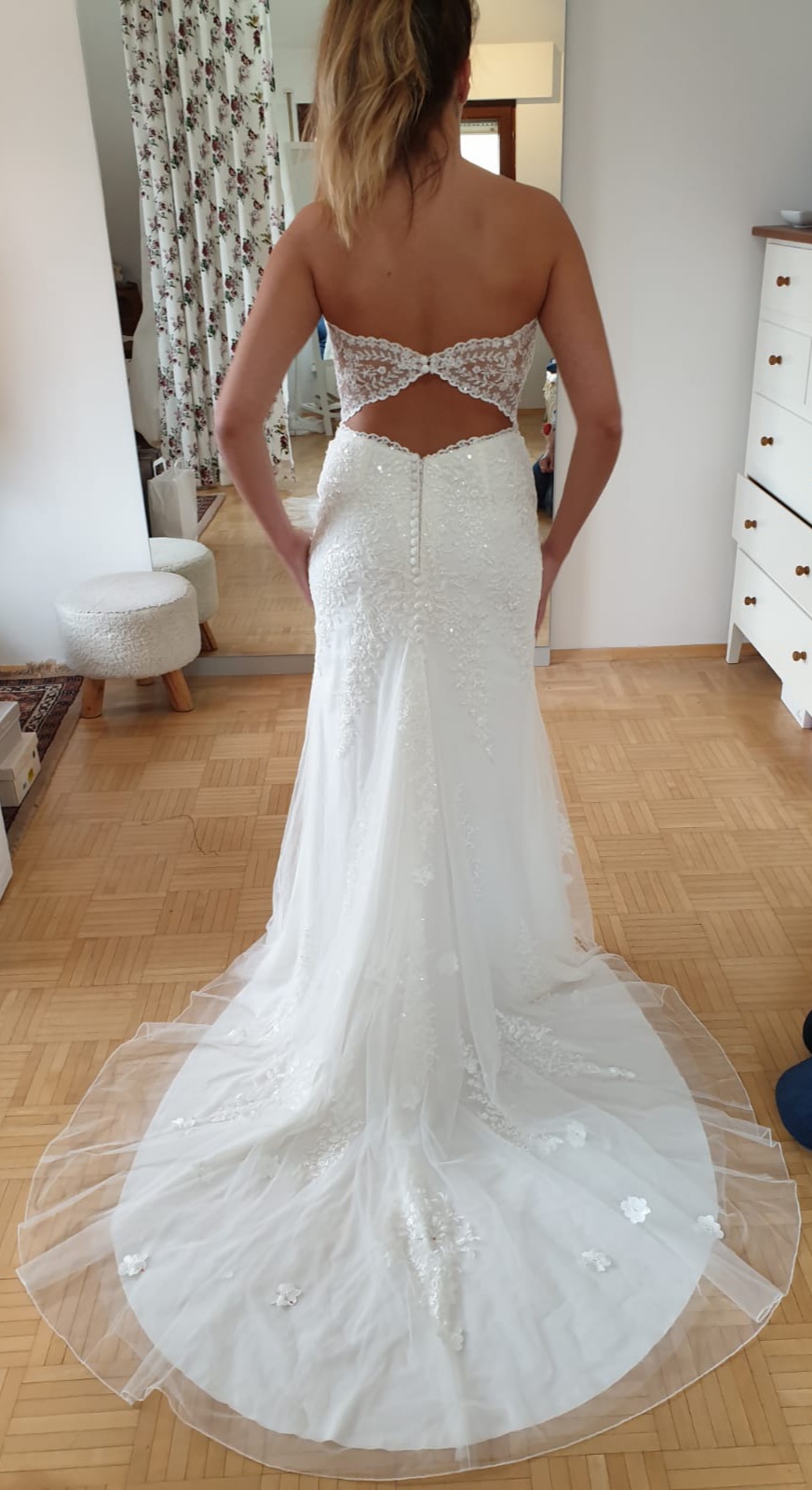 Das Kleid ist im Meerjungfrauen-Stil gehalten und ist superleicht und angenehm zu tragen. Es befinden sich tolle Stickereien und traumhaft glänzende Pailletten auf dem Stoff. Unglaublich schöner Glanz. Der freie Rücken und die anschließende Knopfleiste sind ein echter Hingucker.