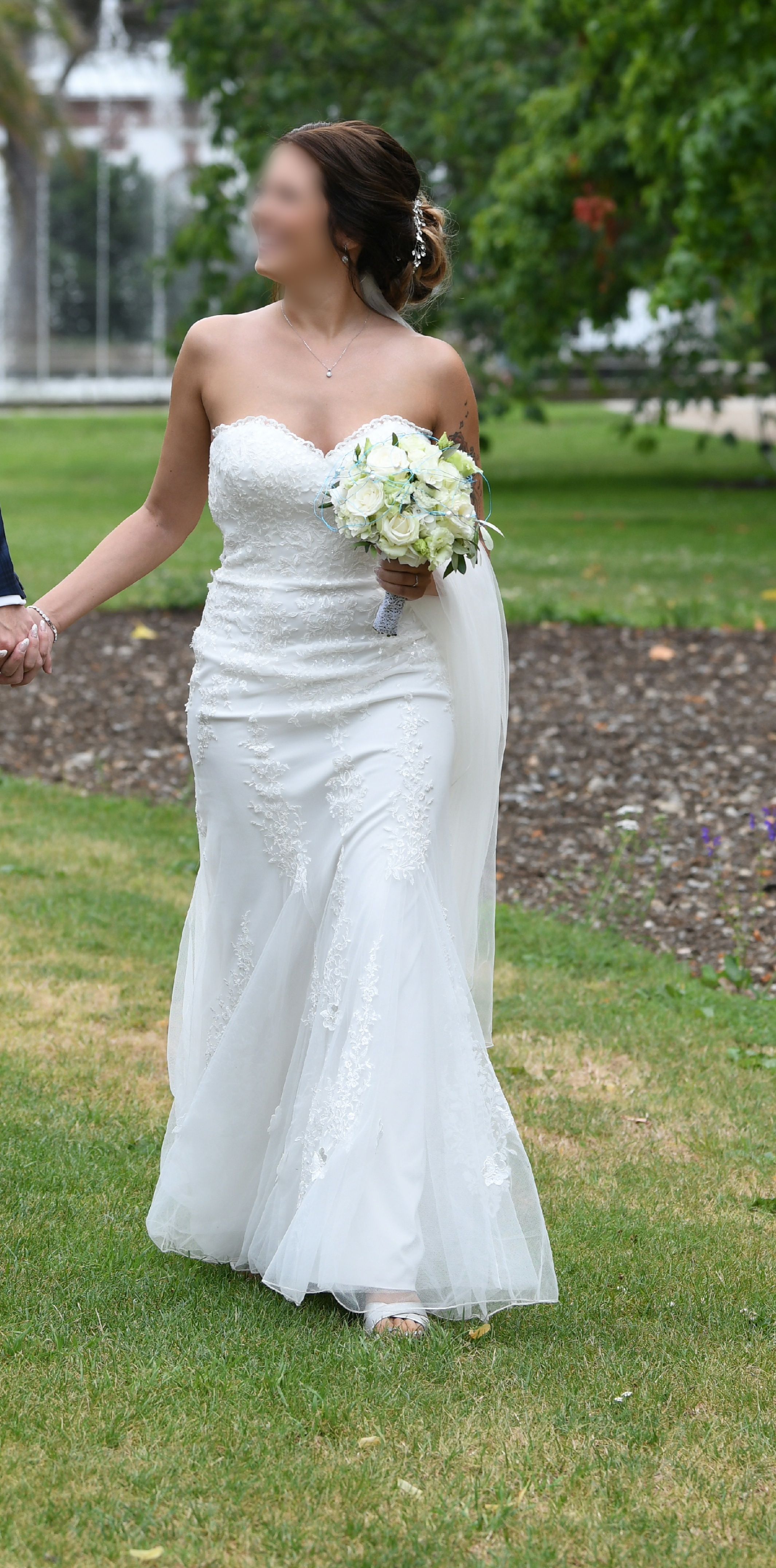 Als Zubehör zum Kleid gehört ein ca. 2,20 Meter langer Schleier (Bianco Evento S166 Ivory). Die Schleiernähte am unteren Ende (Bodennähe) haben Abnutzungsspuren (Verfärbungen), die trotz Reinigung nicht komplett entfernt werden konnten. Am Schleierkamm wurden Kammzacken herausgebrochen für einen besseren Halt in der Hochsteckfrisur.