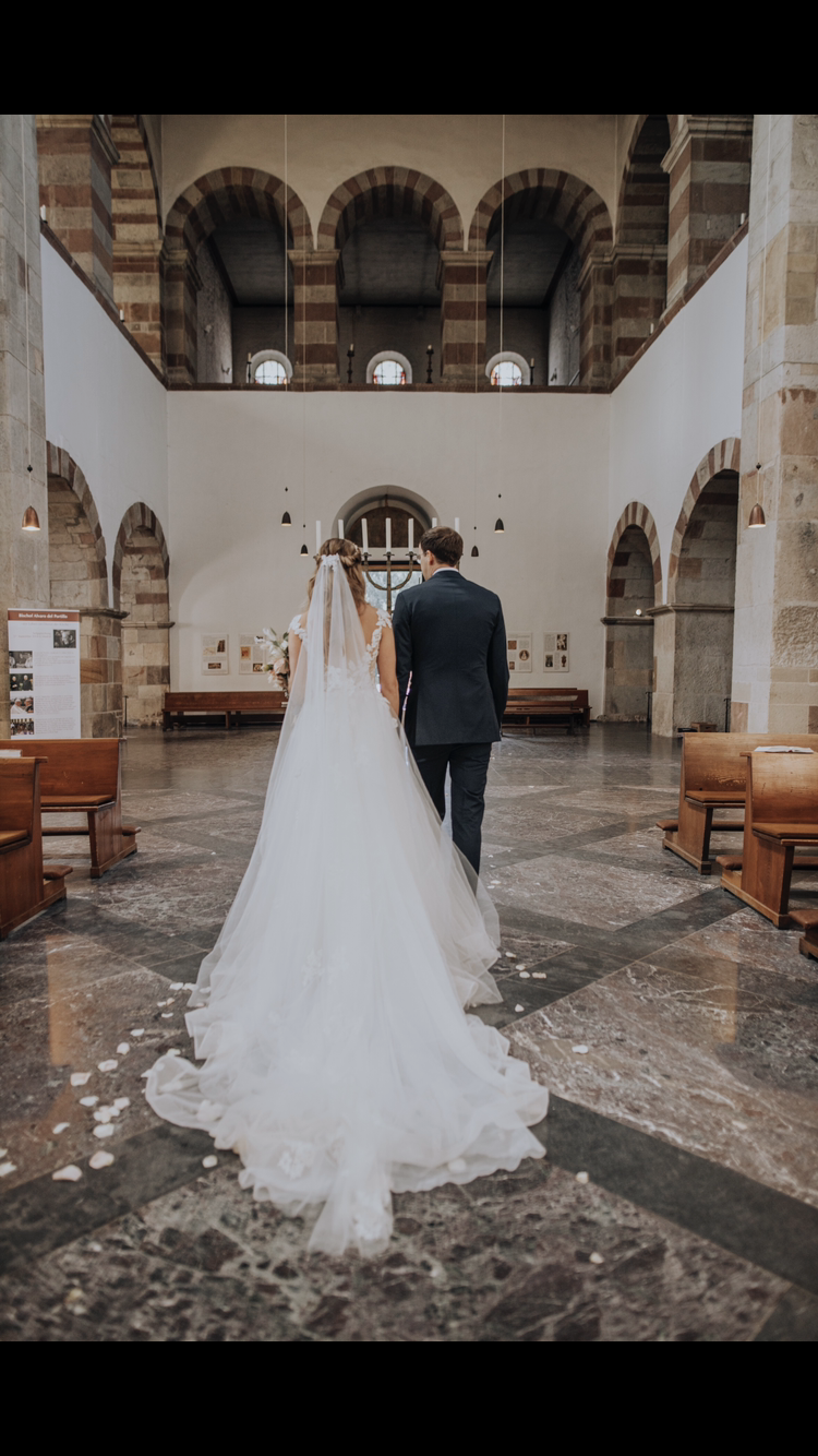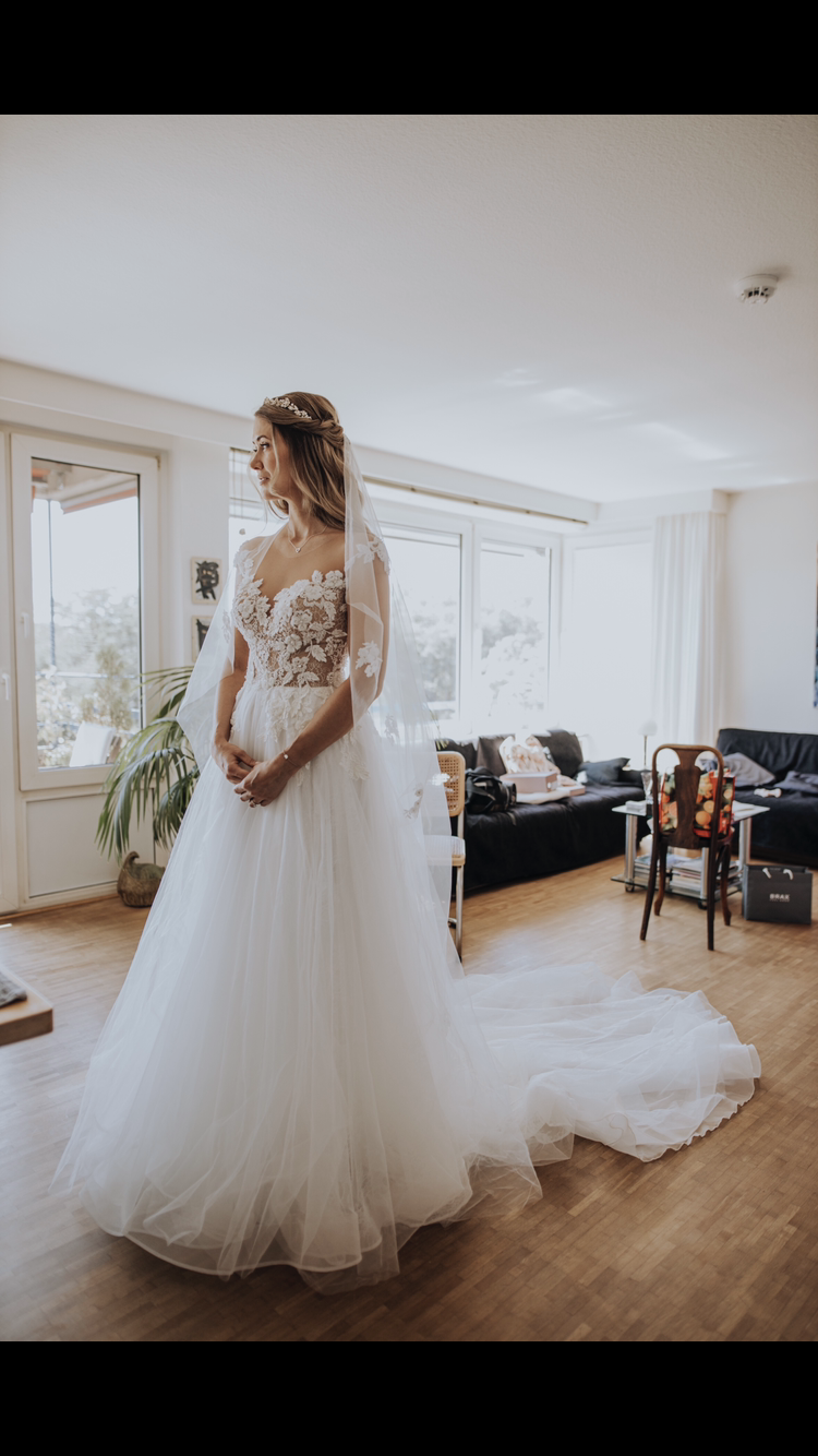 Kleid + Mit Blumen bestickter Schleier. Änderungen: wurde etwas gekürzt ( ich bin 1.80m groß). Kleid wurde einmal getragen und komplett gereinigt.