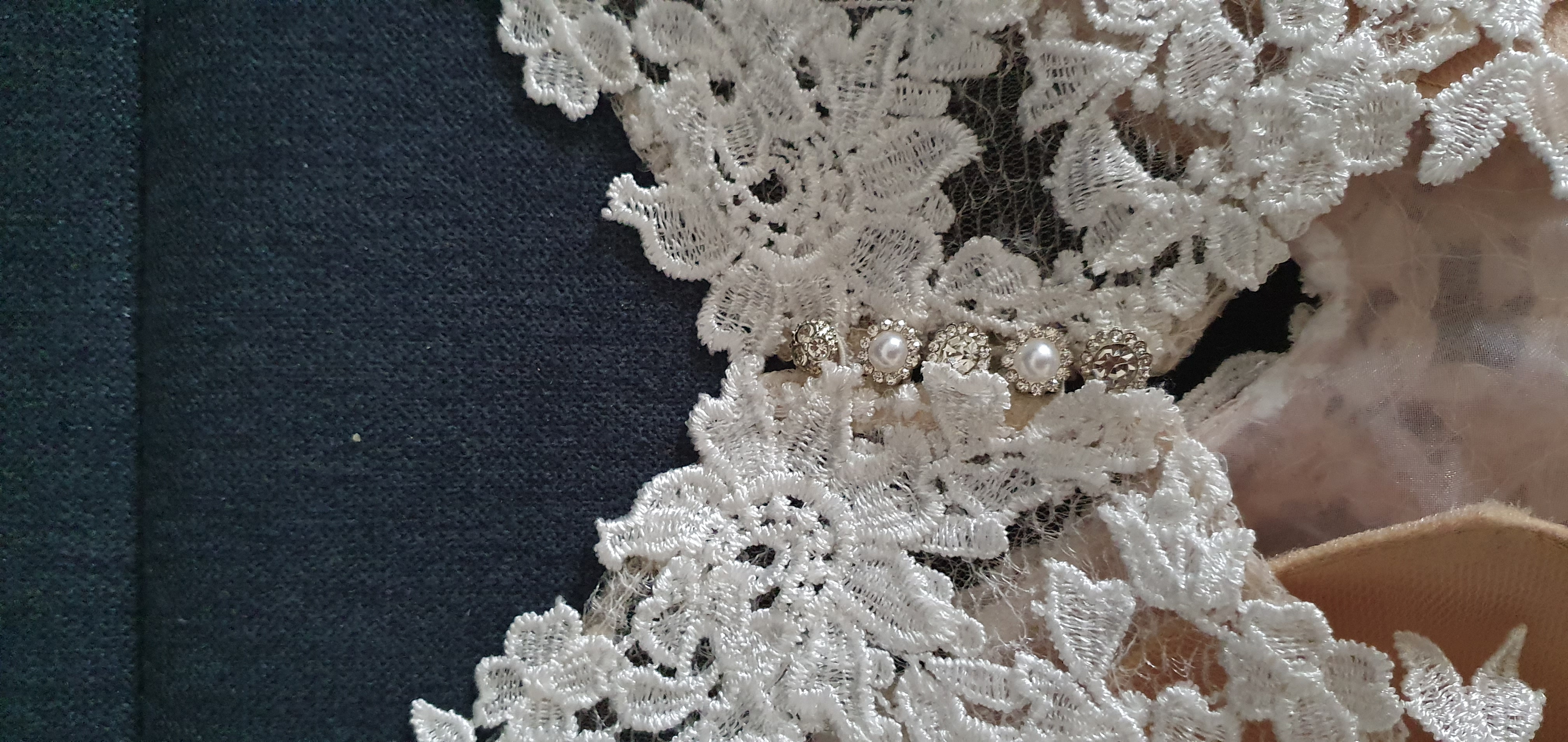 Es ist im Vintage Stil, hat Spitze und ist mit Pailetten bestickt.