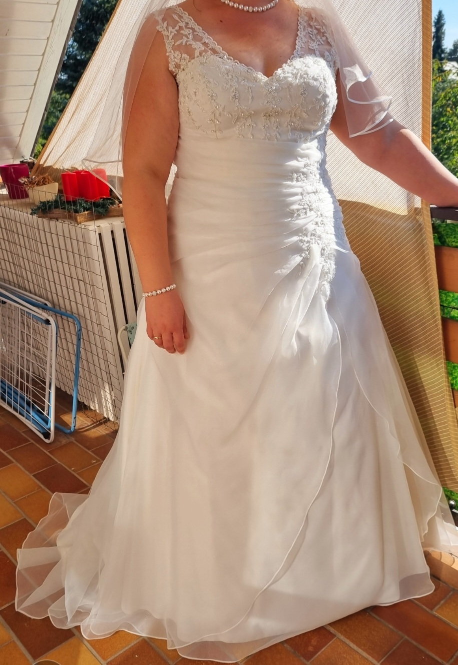 Das Kleid ist in der Farbe ivory und hat die Größe 52 (auf dem Ettiket). Ich trage bei normaler Kleidung die Größe 48. Das Kleid ist von der Marke molly Monroe by Lohrengel. Das Kleid musste nicht verändert werden. Bei meiner Körpergröße von 1,78m plus Schuhe mit Absatzhöhe von 5cm hat die Länge perfekt gepasst.