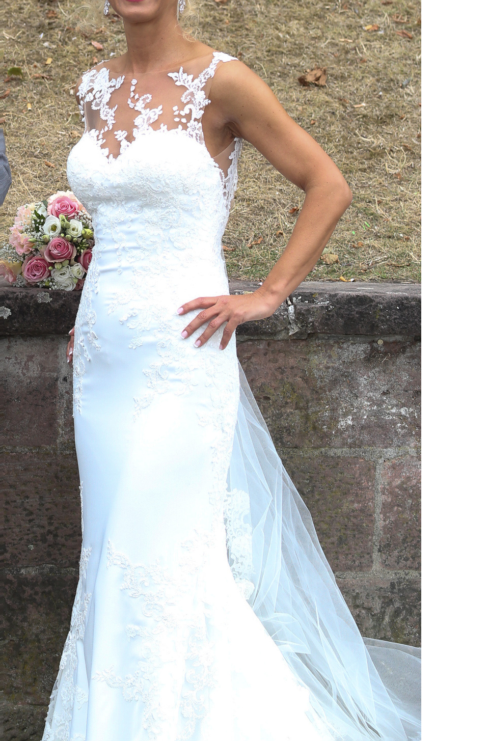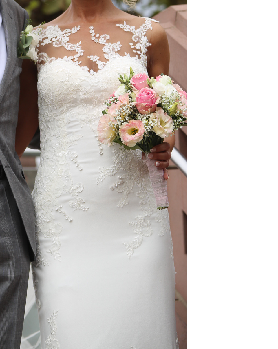 Ich bin 1,61 m groß und hatte zur Hochzeit 10 cm hohe Absätze an. Ich wiege 51 kg. Das Kleid wurde für mich etwas enger genäht und kann nach Belieben wieder weitergemacht werden.