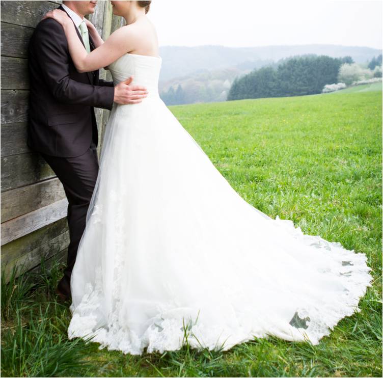 Traumhaftes ivory-farbenes Tüll-Brautkleid mit viel Spitze und wenigen Pailetten auf der Spitze besetzt, im Empire/A-Linie-Look mit Herzausschnitt, Tüll liegt im Korsagen-Bereich des Kleides über Kreuz, ab der Korsage abwärts Tüll in 2 Lagen mit Spitze besetzt, unterer Saum des Kleides komplett mit Spitze umrundet, getragen 2014, gereinigt, ohne Mängel, ich bin 1,65m groß, gekürzt auf diese Länge, sonst keine Veränderungen, Schleppe, wurde in einer Schutzhülle aufbewahrt