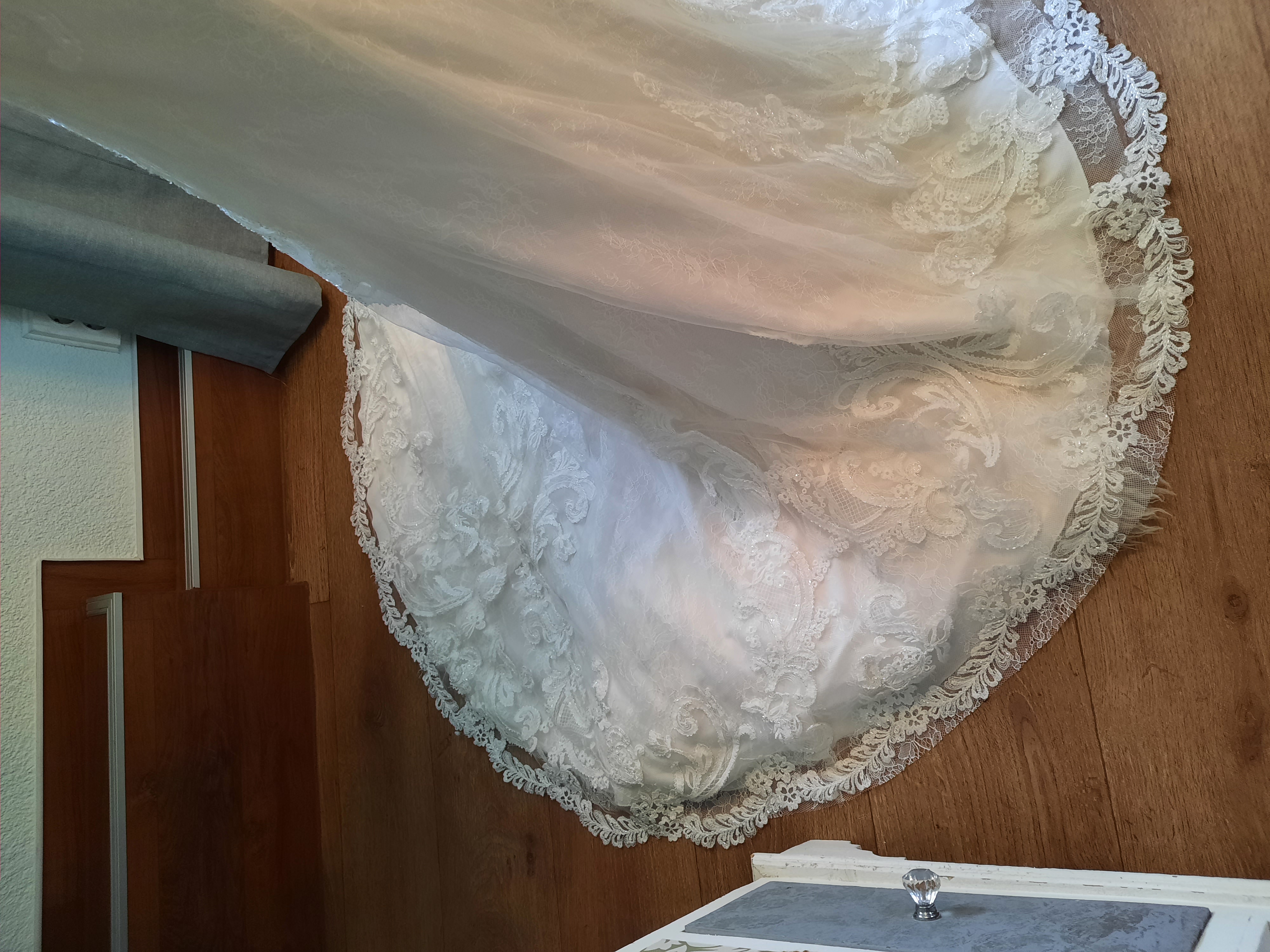 ich möchte mein wunderschönes Hochzeitskleid verkaufen. Ich bin derzeit in anderen Umständen und kann es daher nicht tragen. Ich hoffe, jemanden zu finden, der das Kleid zu schätzen weiß. Es ist in Sandfarbe und ein absoluter Hingucker. Es sieht getragen einfach nur toll aus.Ich selber trug bei der Anprobe Größe 34/36. Ich habe es bei Crusz in Berlin gekauft.