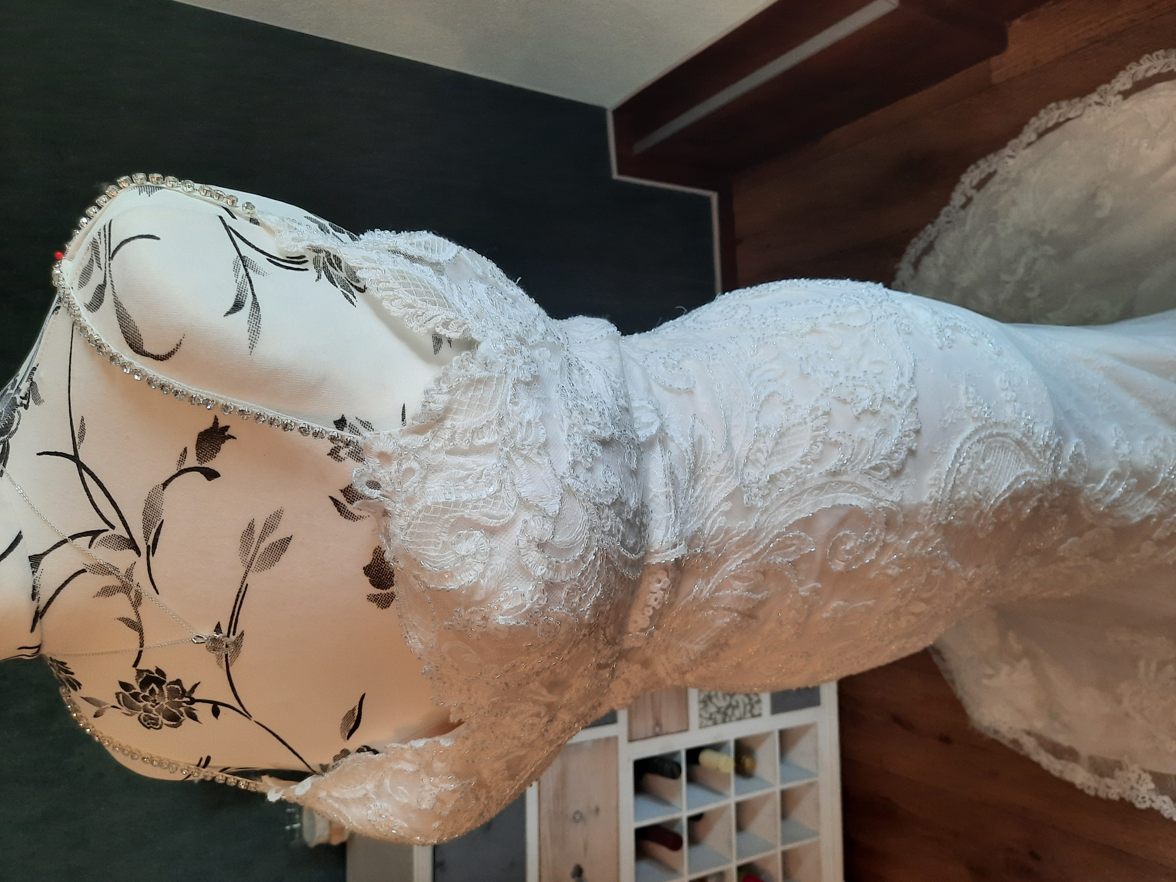 Zudem die wichtigen Infos:Ich bin Nichtraucher, habe kein Tier in der Wohnung und das Kleid hängt geschützt und gut eingepackt bei mir im Schrank. Dazu biete ich noch einen langen Schleier an, der aus der gleichen Spitze wie das Kleid besteht.
